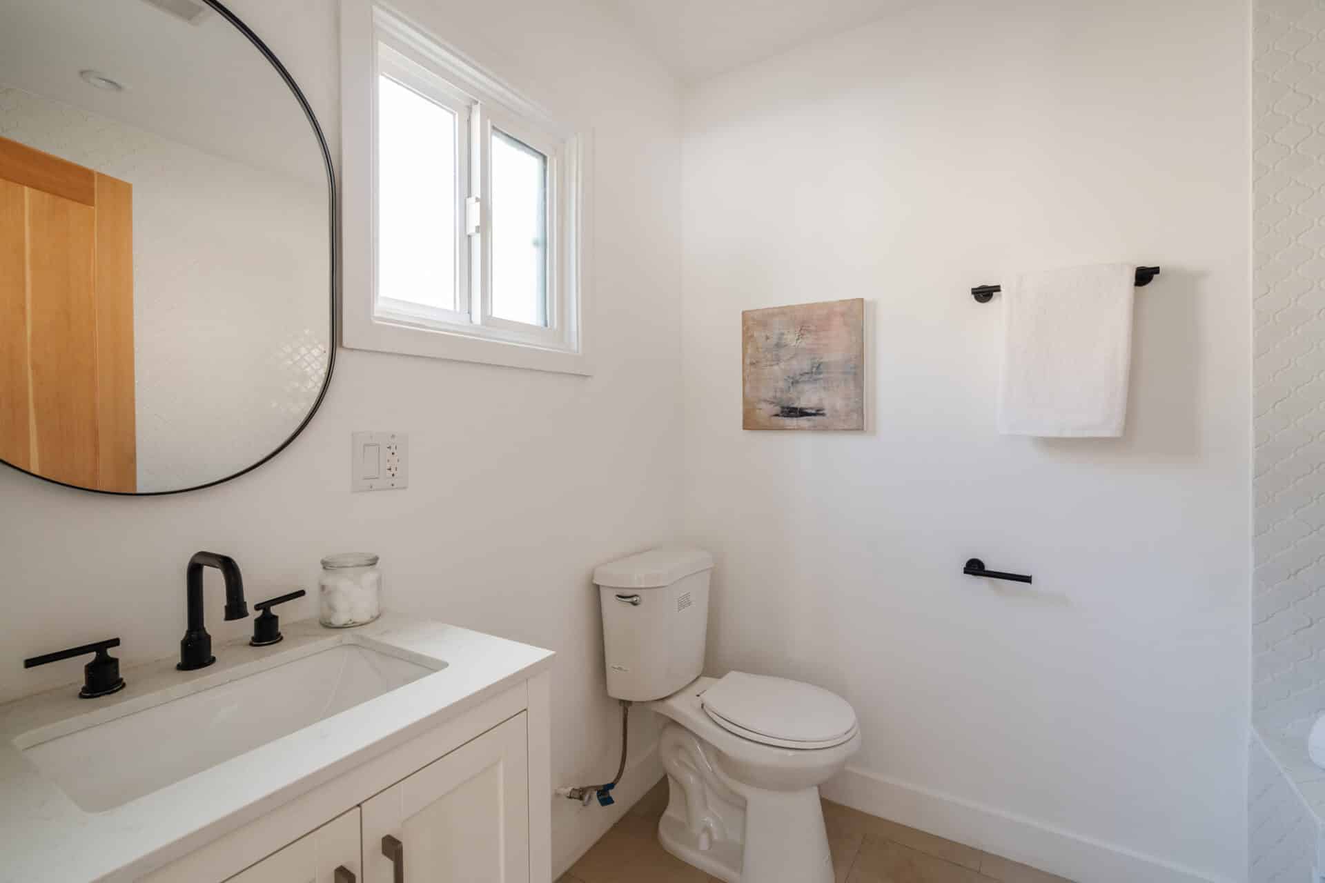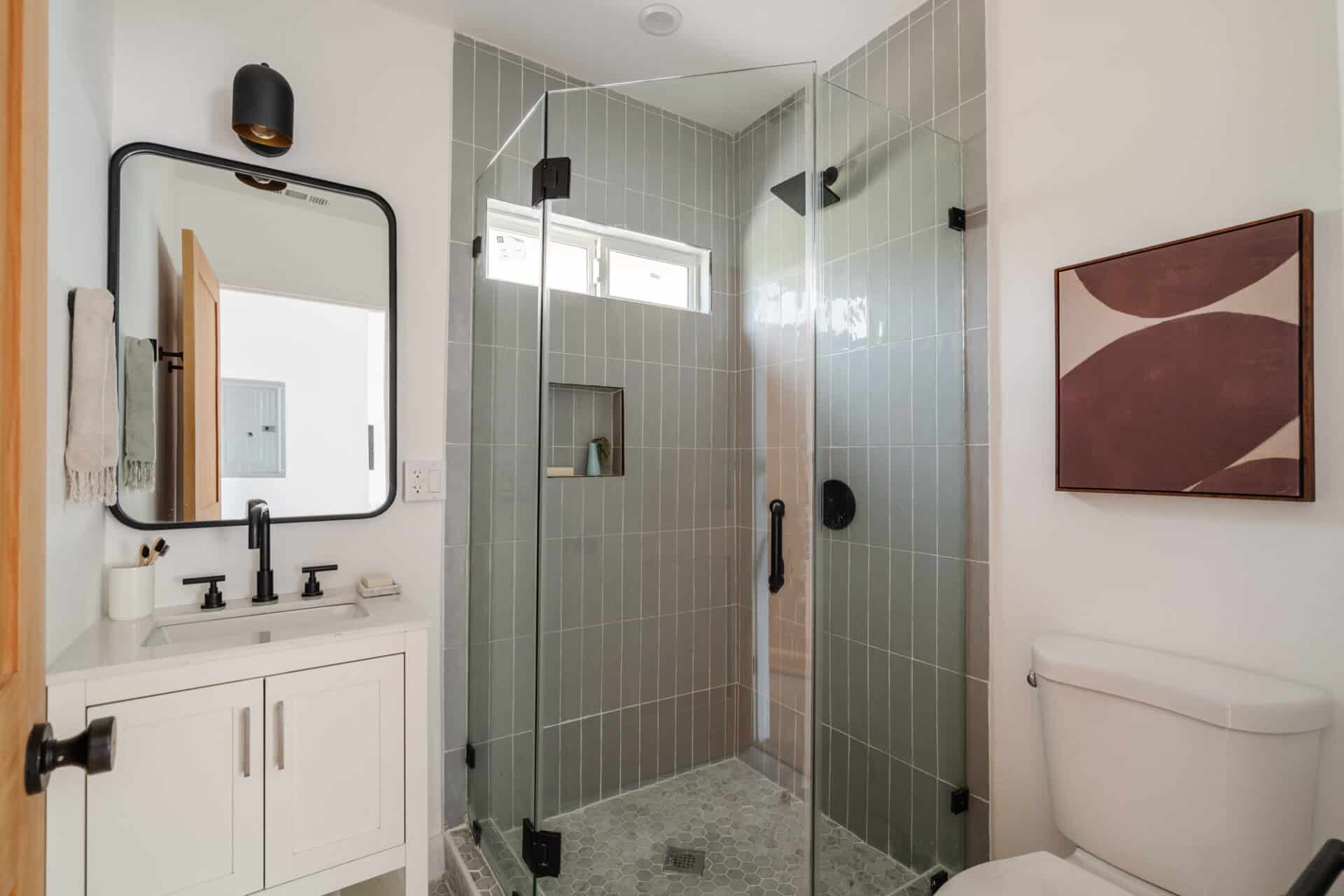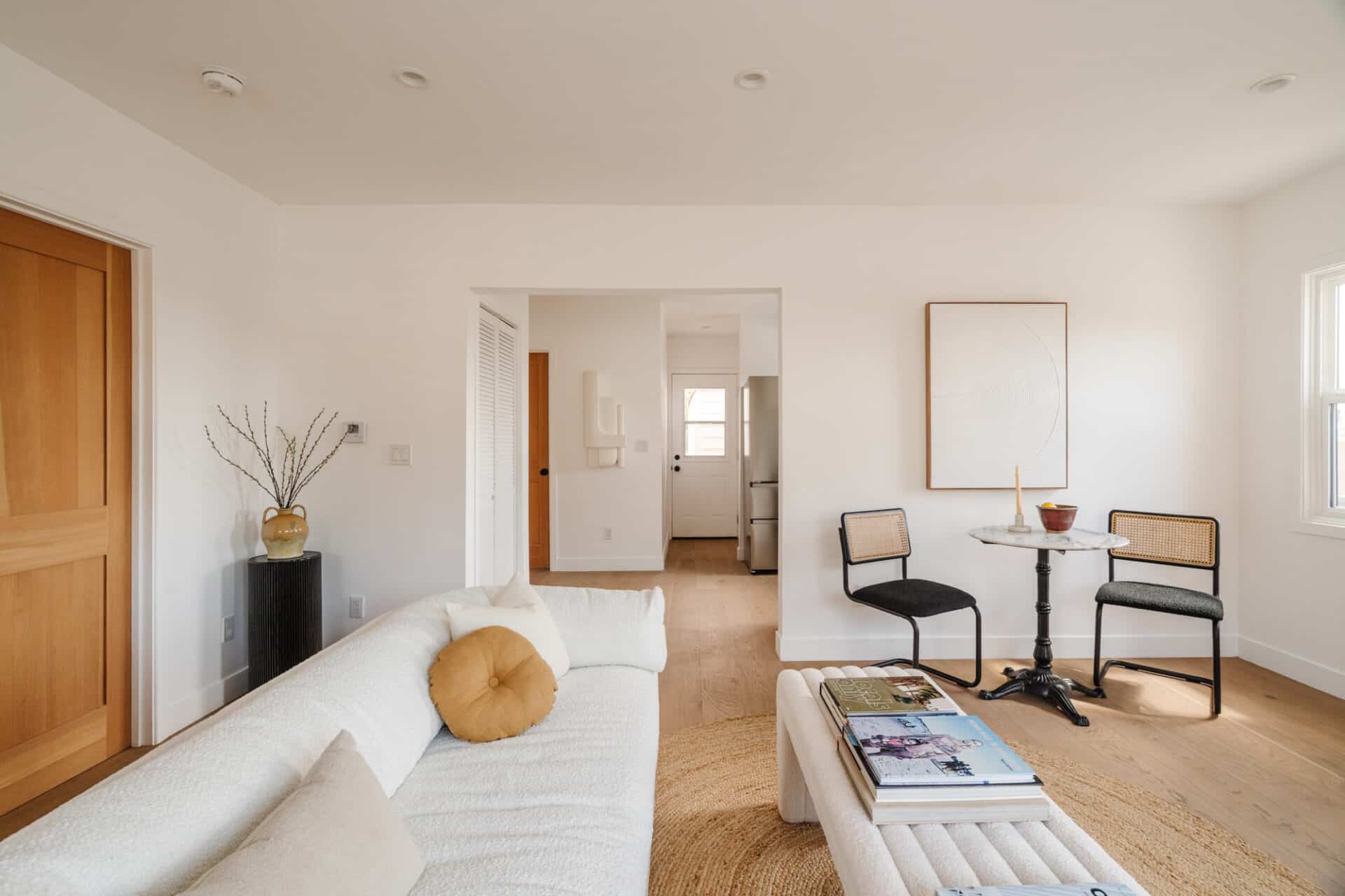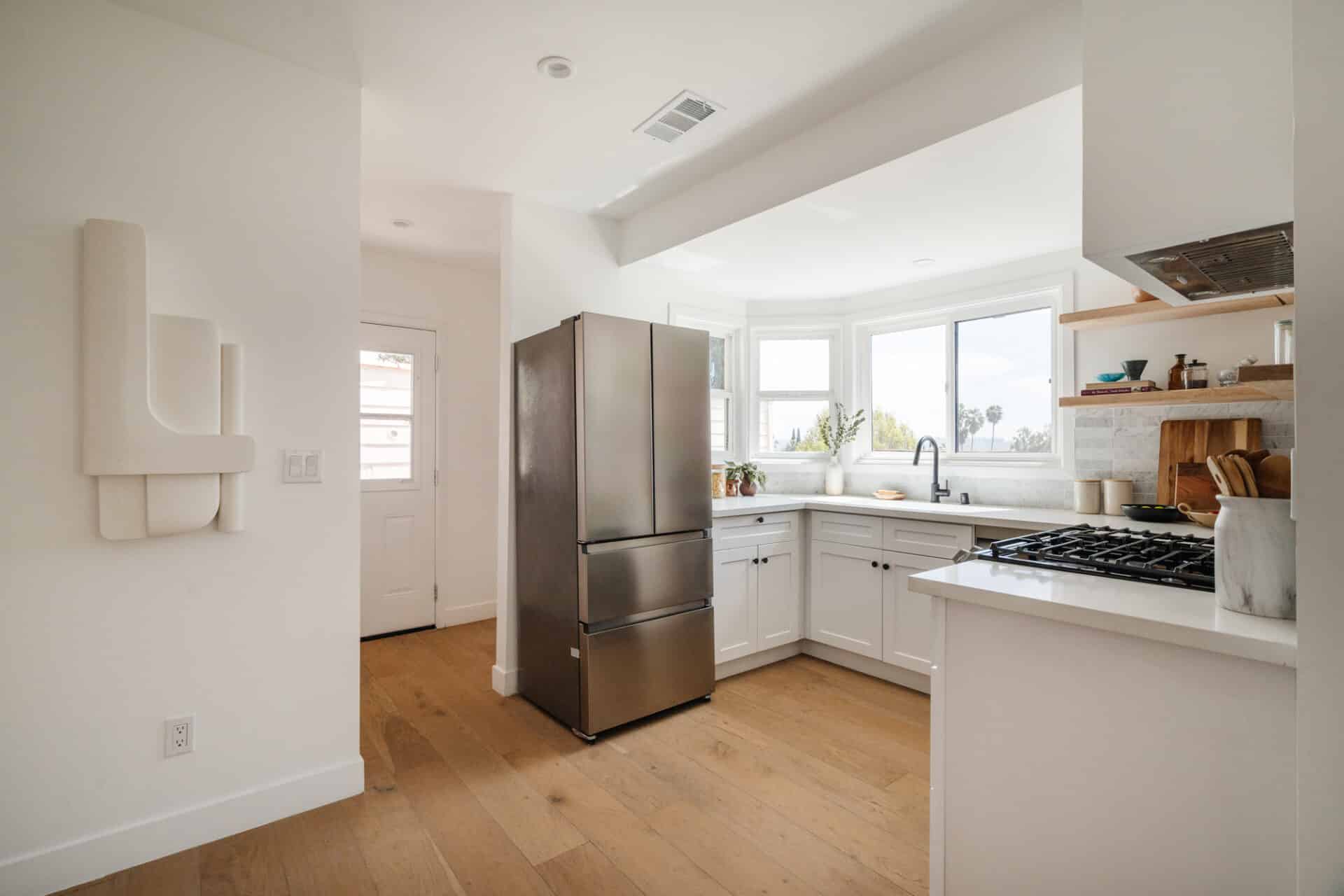 Bright & breezy 2BR/2BA Craftsman Bungalow nestled in the hills of Highland Park, thoughtfully renovated with lush hillside views and a newly constructed studio ADU with its own bathroom and kitchen. Step inside the main home’s sun-splashed interior, where new oak wood floors flow throughout, leading you from a formal living room with decorative fireplace and optional dining area, to a newly renovated kitchen with quartz counters, marble tiled backsplash, open shelving, integrated hood, new stainless steel appliances and windows that overlook lush hillside neighborhood views. Main home features 2 bedrooms, including a primary with ensuite bath with freshly reimagined bathroom with chic matte black fixtures. Hall bath with stacked tile shower and hex marble floor tiles is perfect for guests.