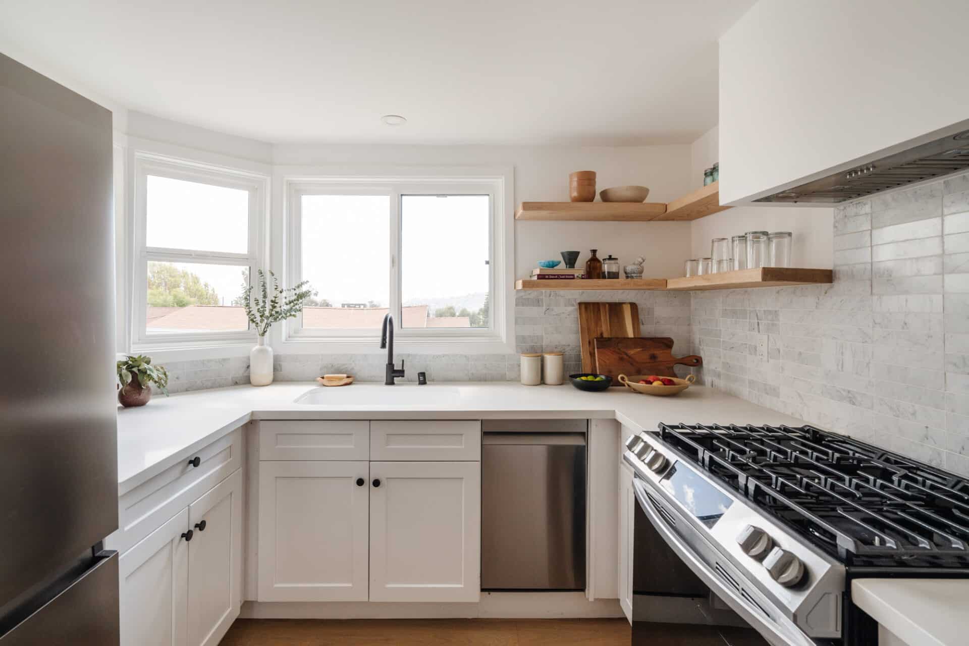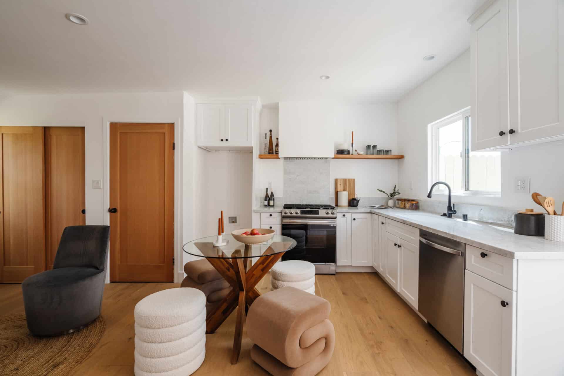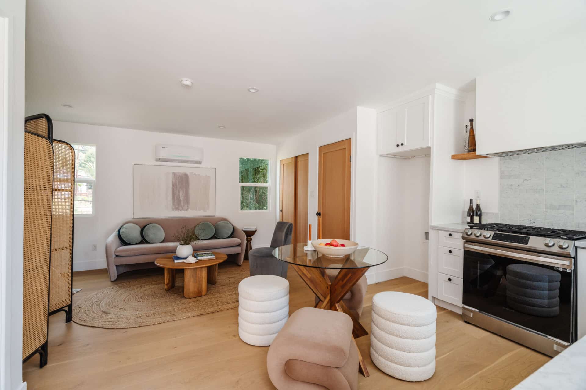 The newly-built studio ADU offers plenty of space for bedroom, living and dining areas as well as a dazzling kitchen with marble counters + backsplash, stainless steel appliances, open shelving and sleek matte black fixtures and stylish bathroom with marble tile flooring and shower clad in stacked matte subway tile. Main house and ADU have their own stackable laundry closets. Multi-tiered outdoor oasis features many levels of entertaining space and a world of possibilities for you to grow your dream garden, harvest your own produce or put in a grassy yard below! Main house measured at 750 sq ft, ADU is 324 sq ft.