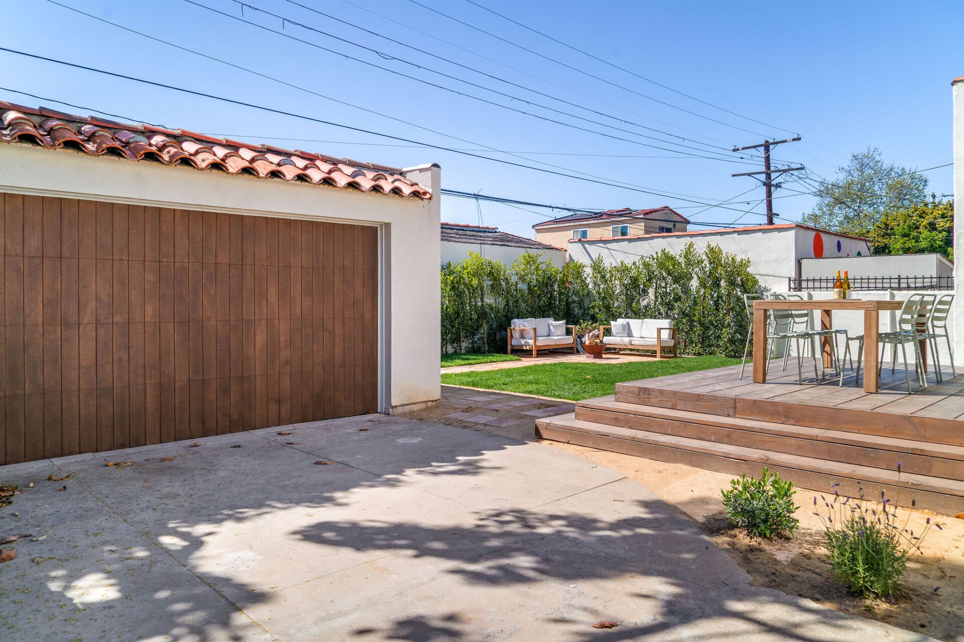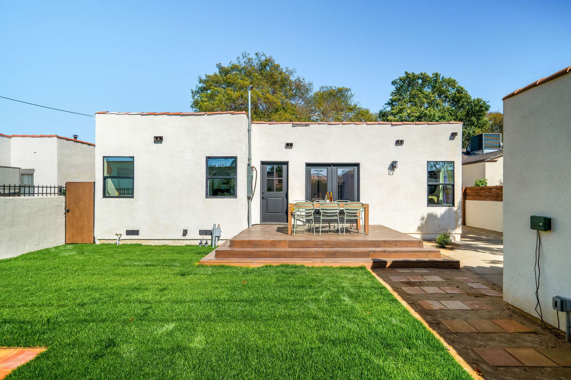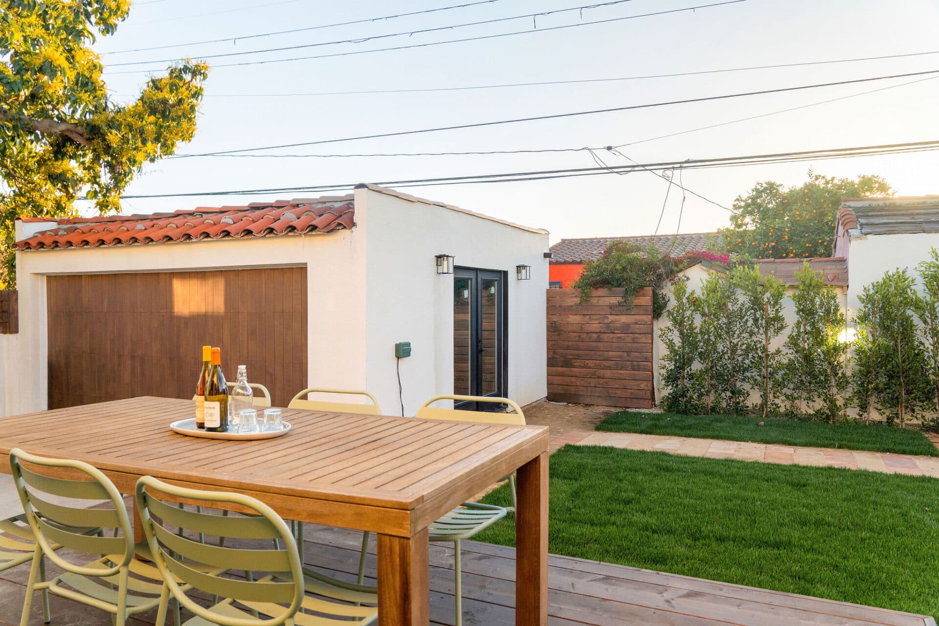 The kitchen is a chef’s dream, showcasing Kelly Wearstler sconces, custom wood cabinetry, and Bianco Neve marble countertops complemented by a custom chiseled calacatta backsplash. Samsung appliances add both style and functionality to this culinary haven. Indulge in relaxation in the primary bedroom en-suite boasting a walk-in closet. The bathroom features Italian Navona travertine flooring, handmade Moroccan zellige tile in the oversized shower, and Bianco Lasa marble counters. Kohler faucets add a touch of refinement to the space. Two additional ample-sized bedrooms complete this stunning home. Special features include Mexican handcrafted saltillo tile flooring in the hallway bath, plaster finish walls, new interior paint, and custom lighting throughout, enhancing the ambiance of every room. Upgrades include all new electrical wiring, a 200-amp electrical panel, new plumbing, new sewer line, new tankless water heater, fully irrigated landscaping, and outdoor lights. Outside, the enchanting backyard oasis awaits, complete with a custom deck, perfect for al fresco dining or enjoying the California sun. Stamped ADU plans plus permits to convert the garage into a studio ADU will be delivered with this sale.