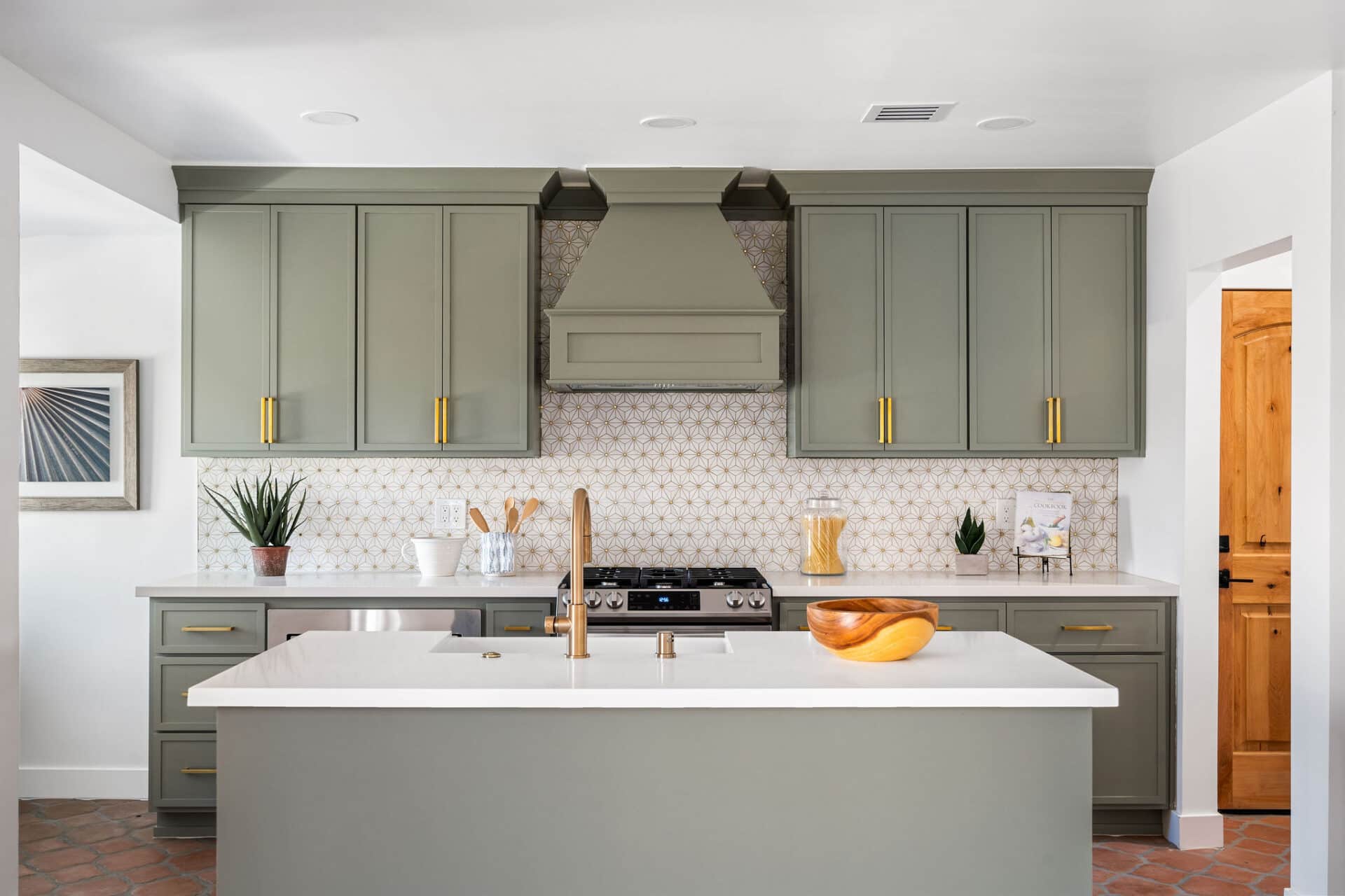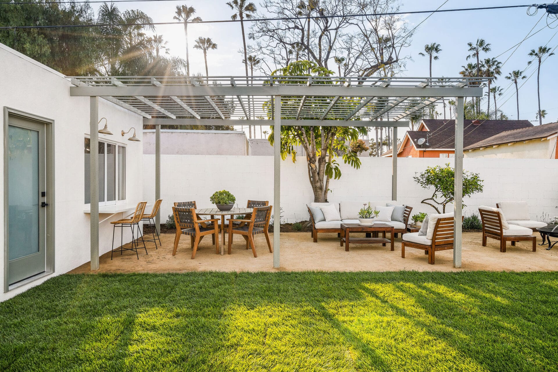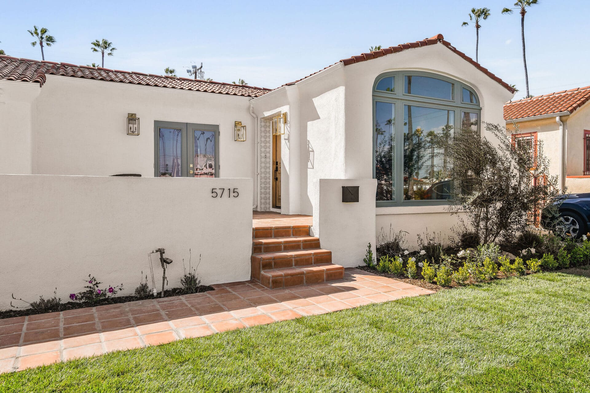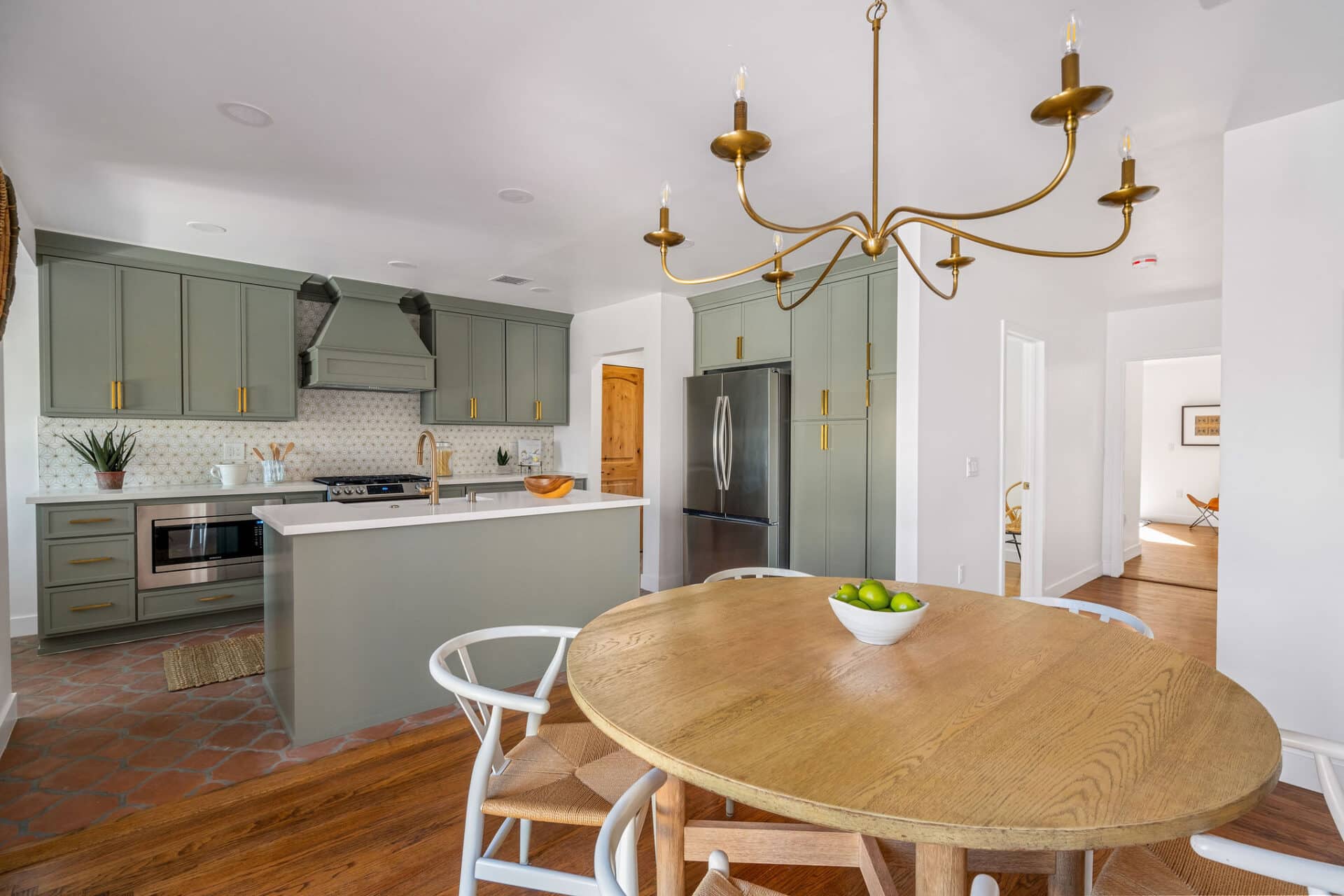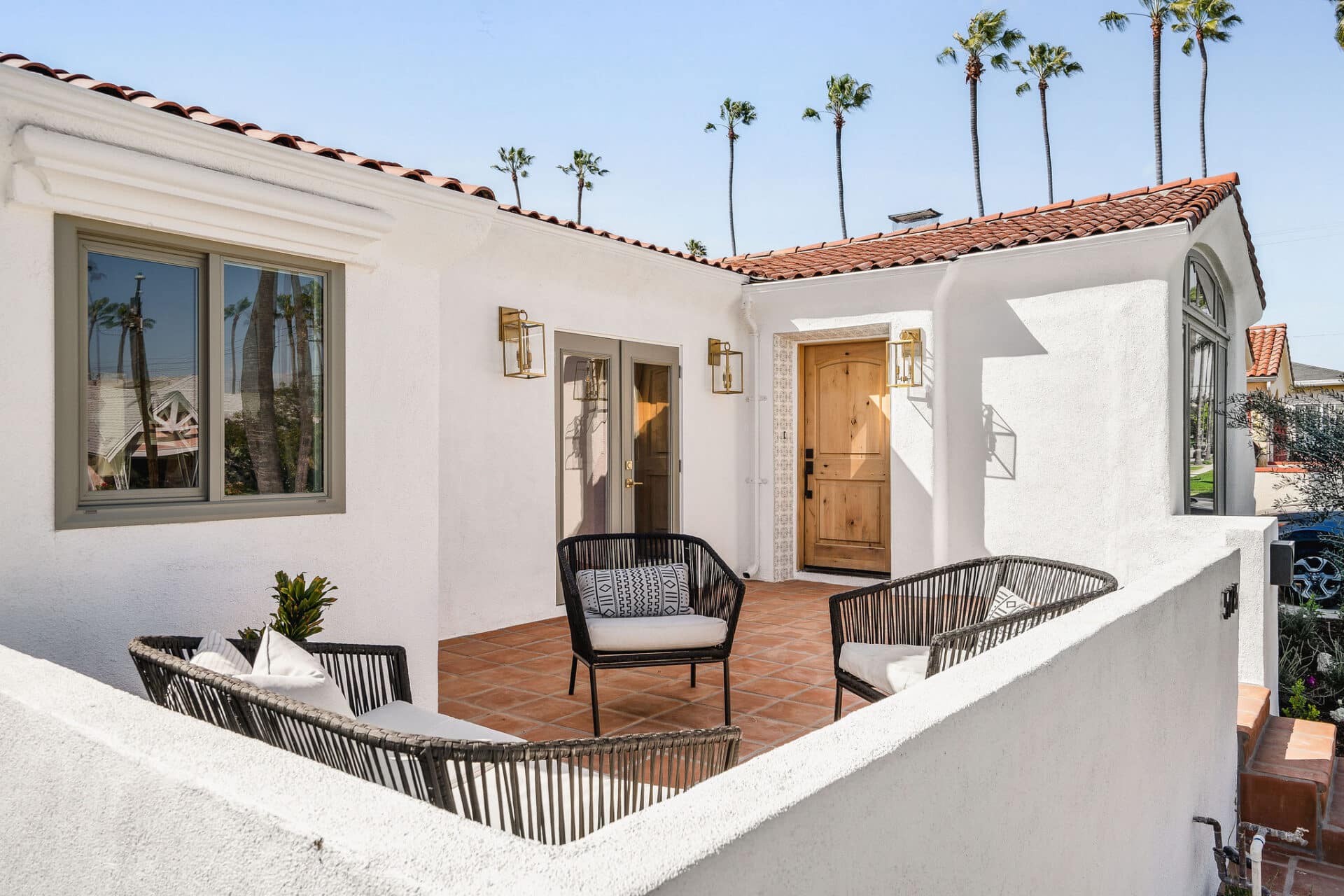 Dining area, with French doors to terrace, opens to renovated kitchen boasting custom sage cabinets, bright stone counters, farmhouse sink, brushed brass hardware and playful backsplash, plus separate office nook with custom built-in desk. Large master suite features dual vanity, freestanding soaking bathtub with designer tile detail, brushed brass hardware and terracotta tile floors, plus ample closet space and French doors to expansive grassy backyard. Two additional bedrooms share a bright hall bath with fresh stacked-tile shower, character terracotta Spanish tile floors and brushed brass detail. Rolling backyard features multiple entertaining options boasting fresh landscaping, pergola, and DG areas, perfect for al fresco dining or twilight entertaining.