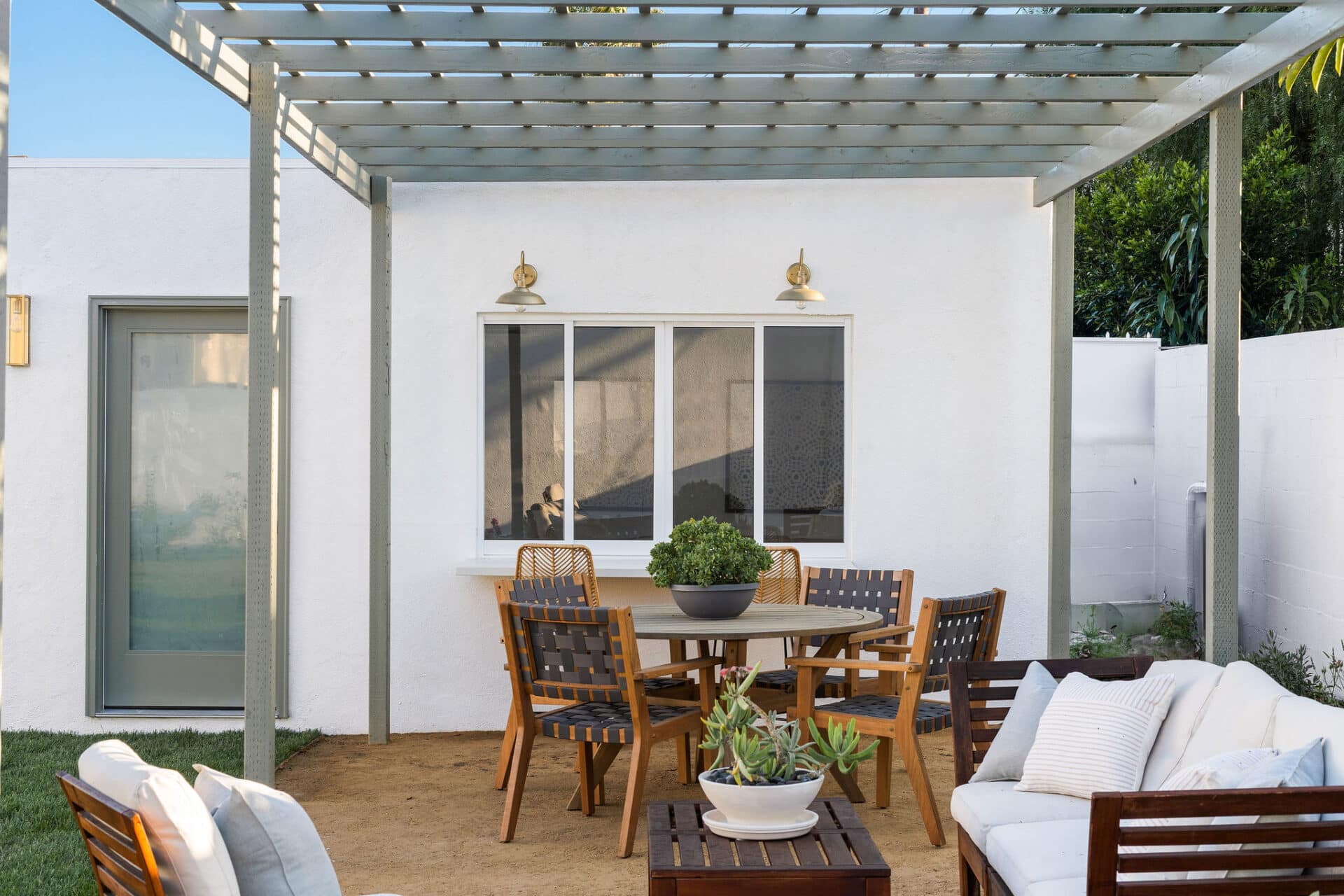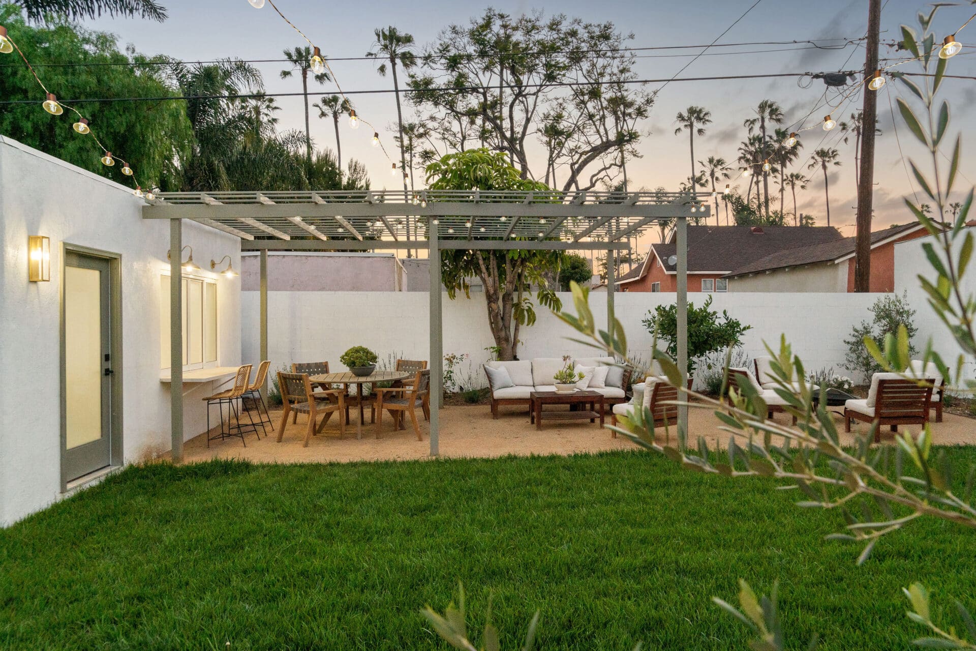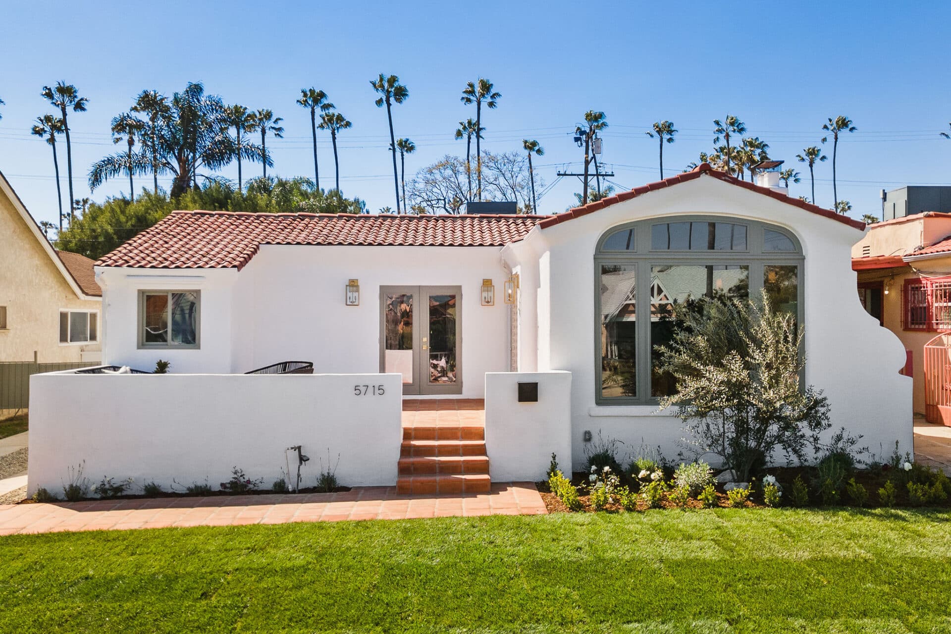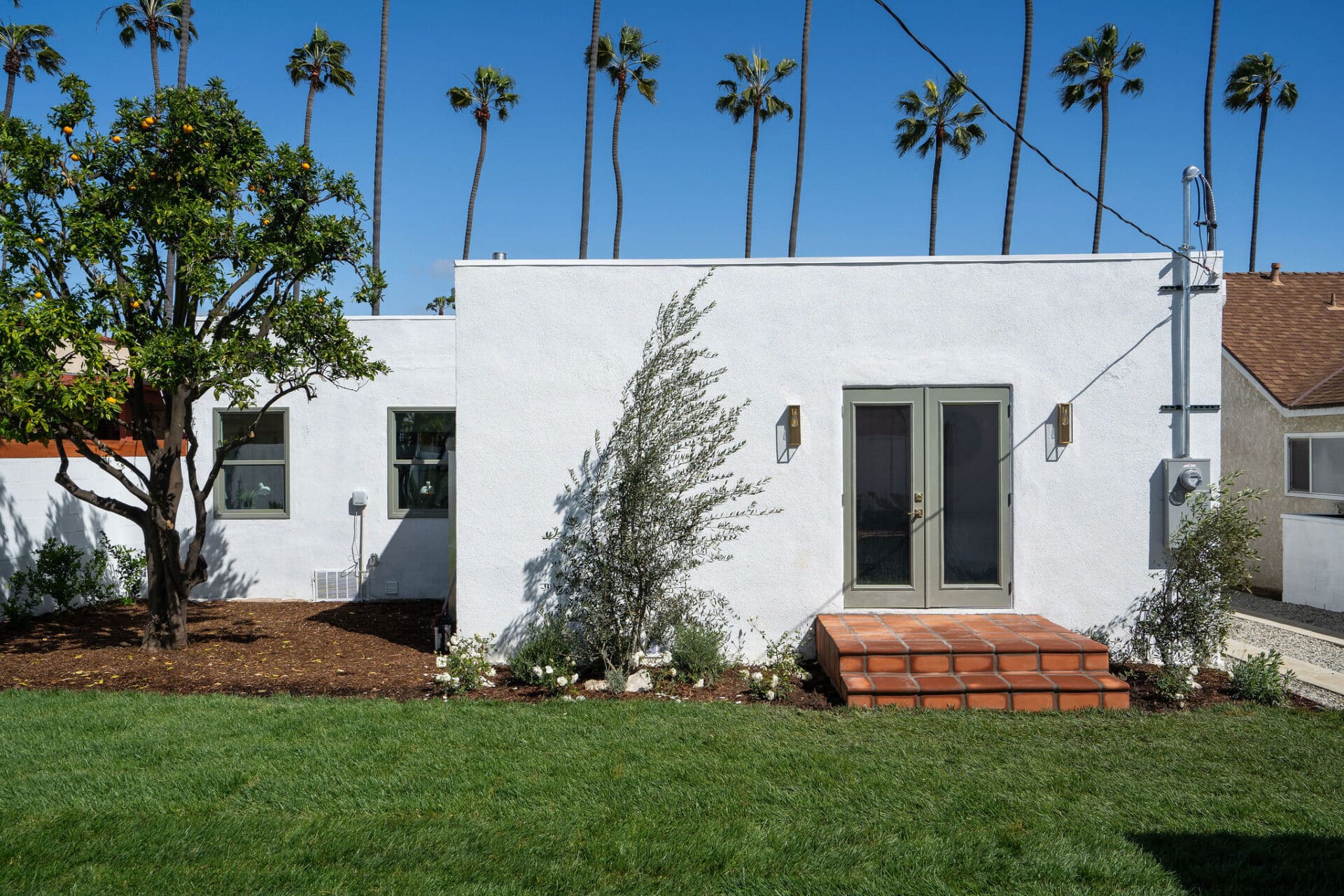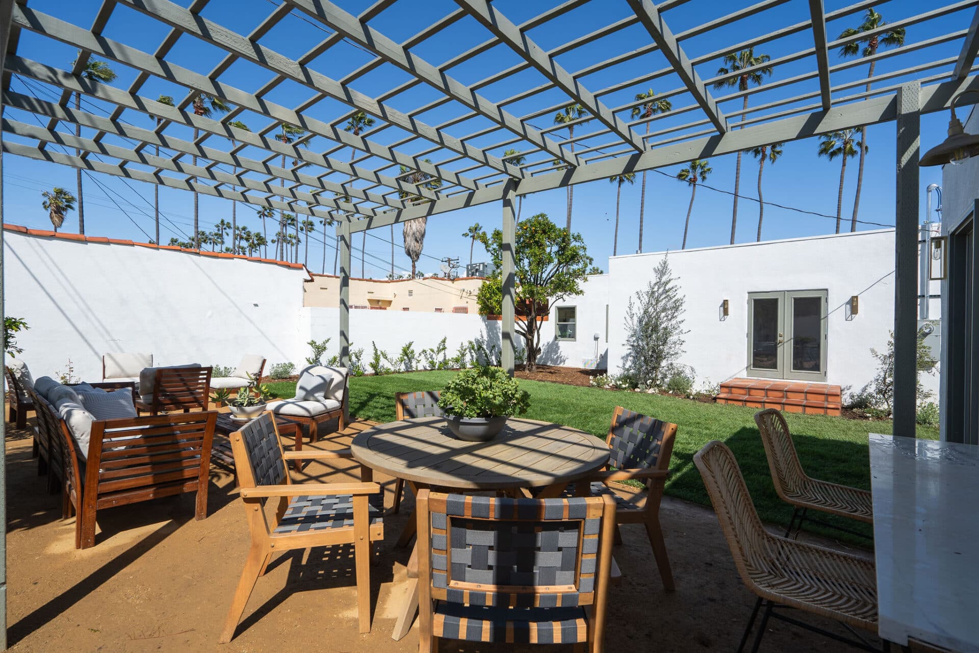 Dining area, with French doors to terrace, opens to renovated kitchen boasting custom sage cabinets, bright stone counters, farmhouse sink, brushed brass hardware and playful backsplash, plus separate office nook with custom built-in desk. Large master suite features dual vanity, freestanding soaking bathtub with designer tile detail, brushed brass hardware and terracotta tile floors, plus ample closet space and French doors to expansive grassy backyard. Two additional bedrooms share a bright hall bath with fresh stacked-tile shower, character terracotta Spanish tile floors and brushed brass detail. Rolling backyard features multiple entertaining options boasting fresh landscaping, pergola, and DG areas, perfect for al fresco dining or twilight entertaining.