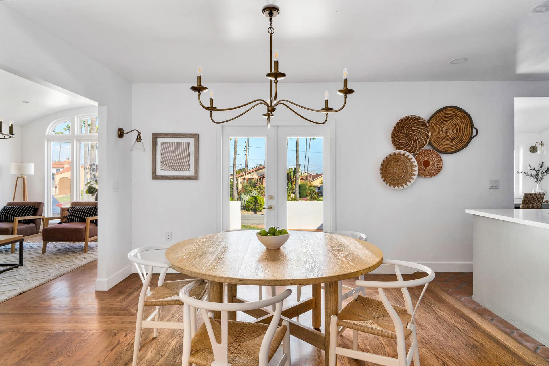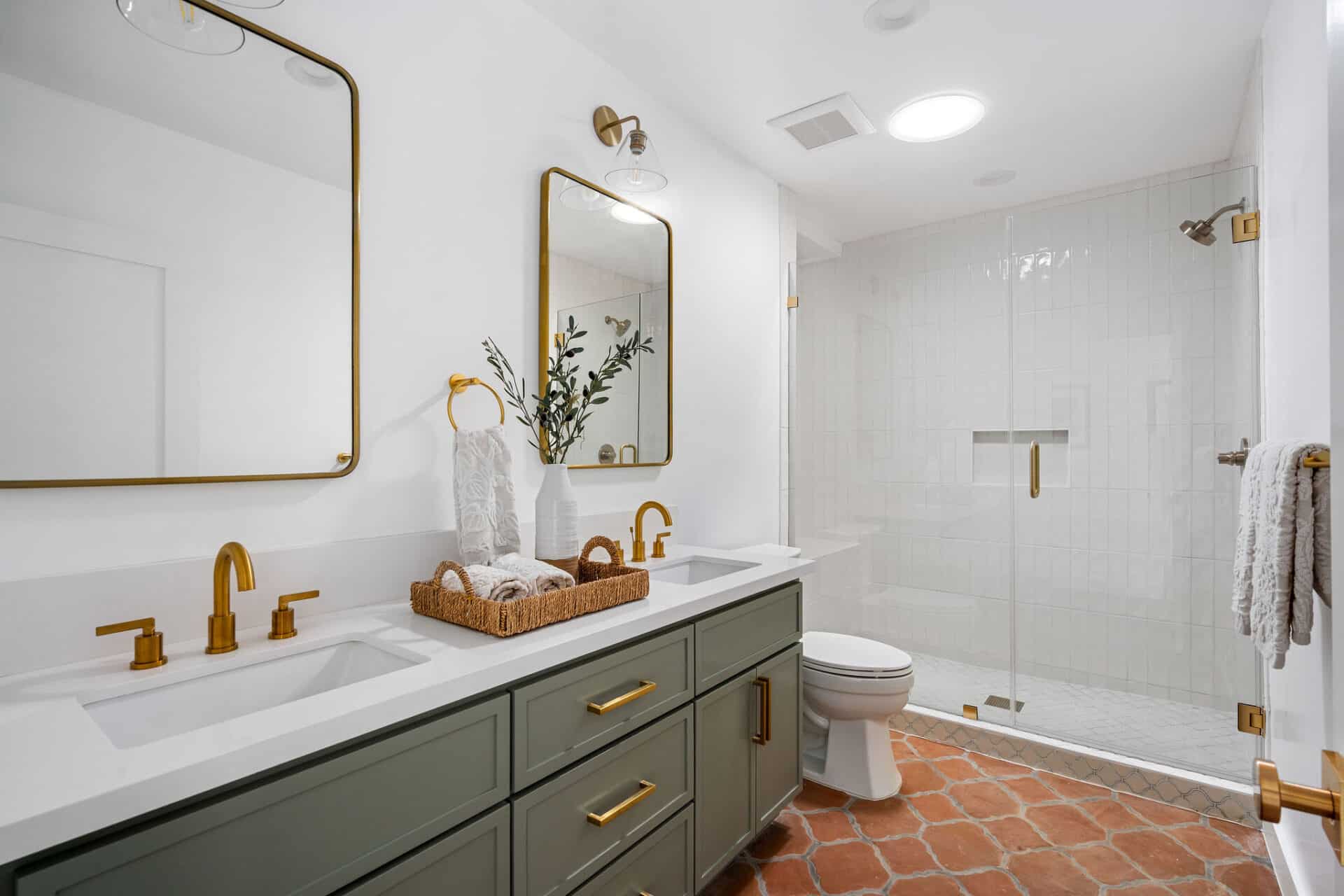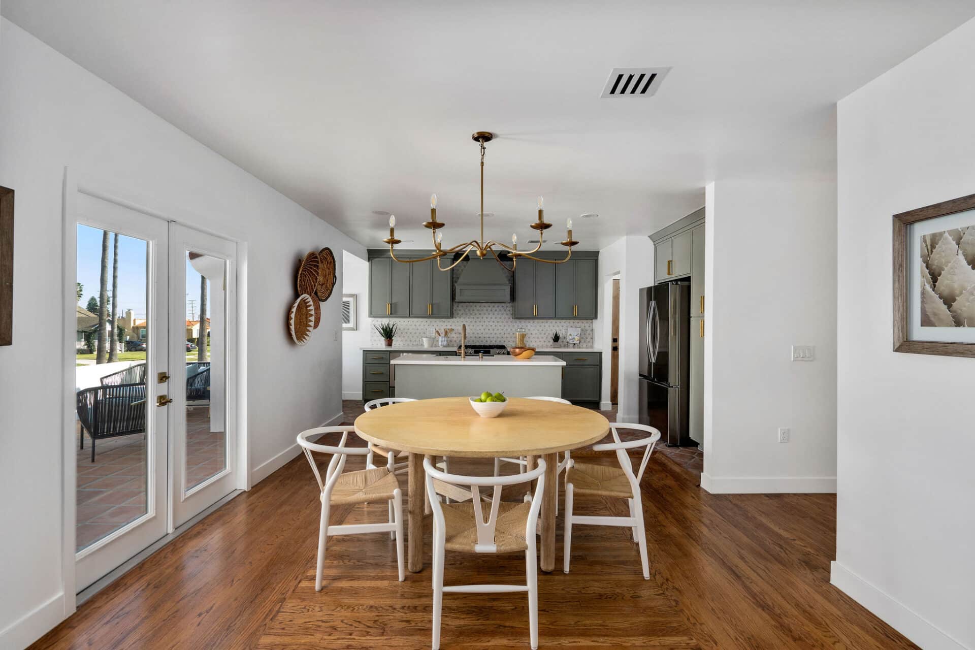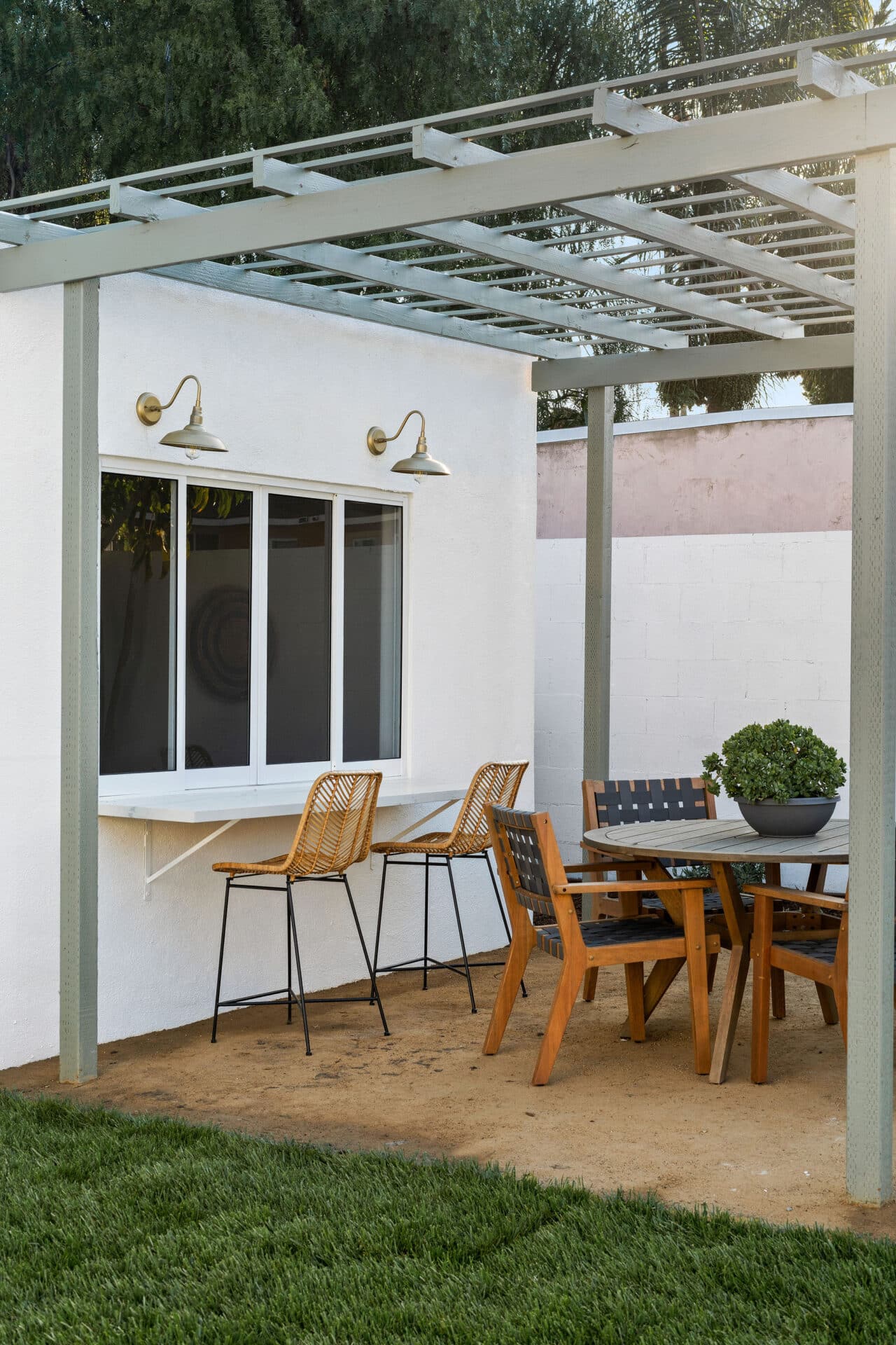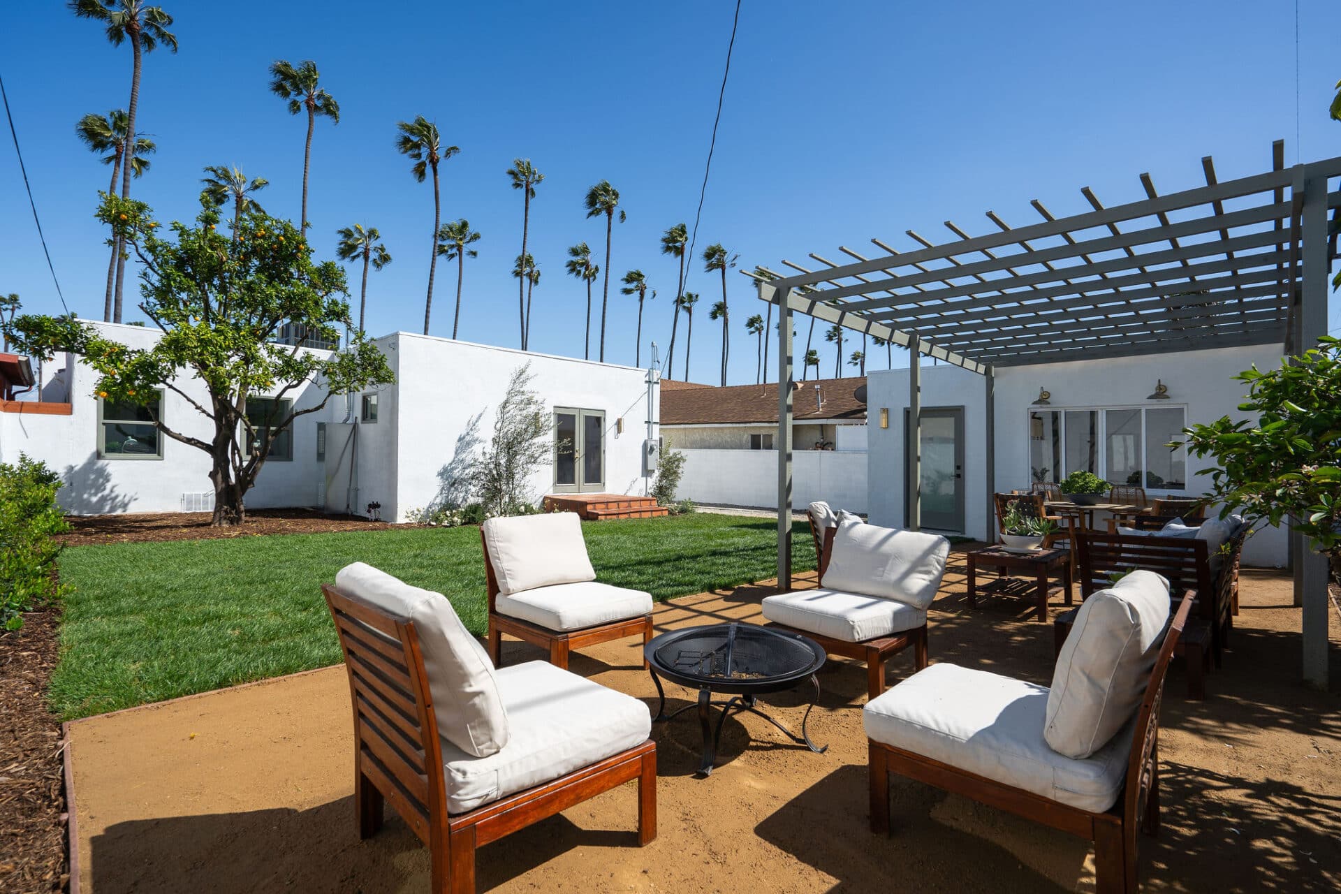 Dining area, with French doors to terrace, opens to renovated kitchen boasting custom sage cabinets, bright stone counters, farmhouse sink, brushed brass hardware and playful backsplash, plus separate office nook with custom built-in desk. Large master suite features dual vanity, freestanding soaking bathtub with designer tile detail, brushed brass hardware and terracotta tile floors, plus ample closet space and French doors to expansive grassy backyard. Two additional bedrooms share a bright hall bath with fresh stacked-tile shower, character terracotta Spanish tile floors and brushed brass detail. Rolling backyard features multiple entertaining options boasting fresh landscaping, pergola, and DG areas, perfect for al fresco dining or twilight entertaining.