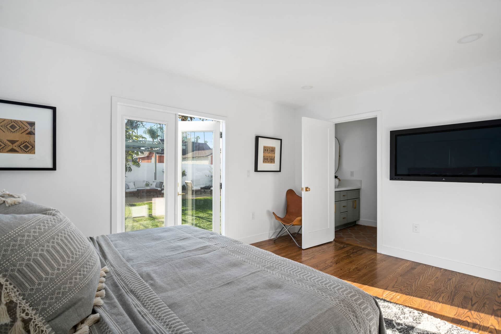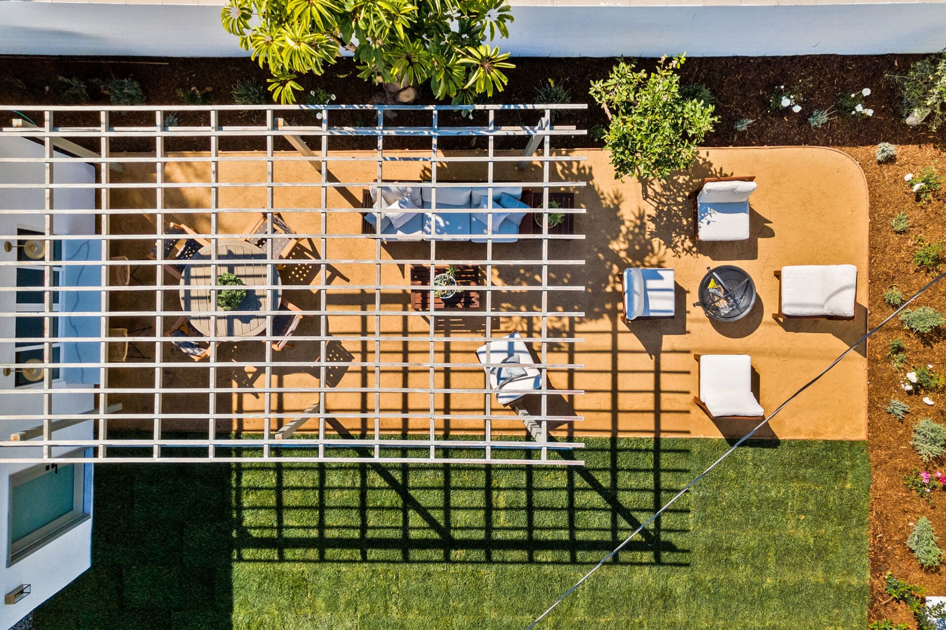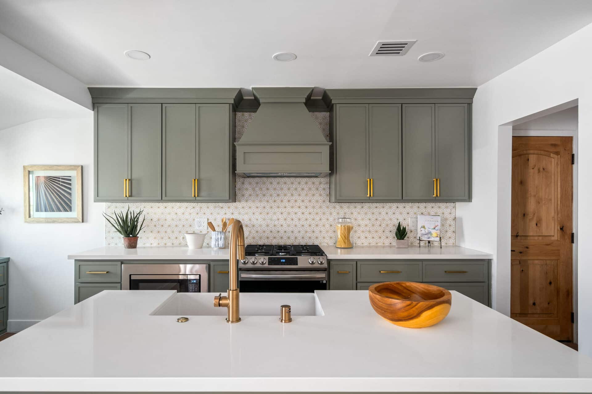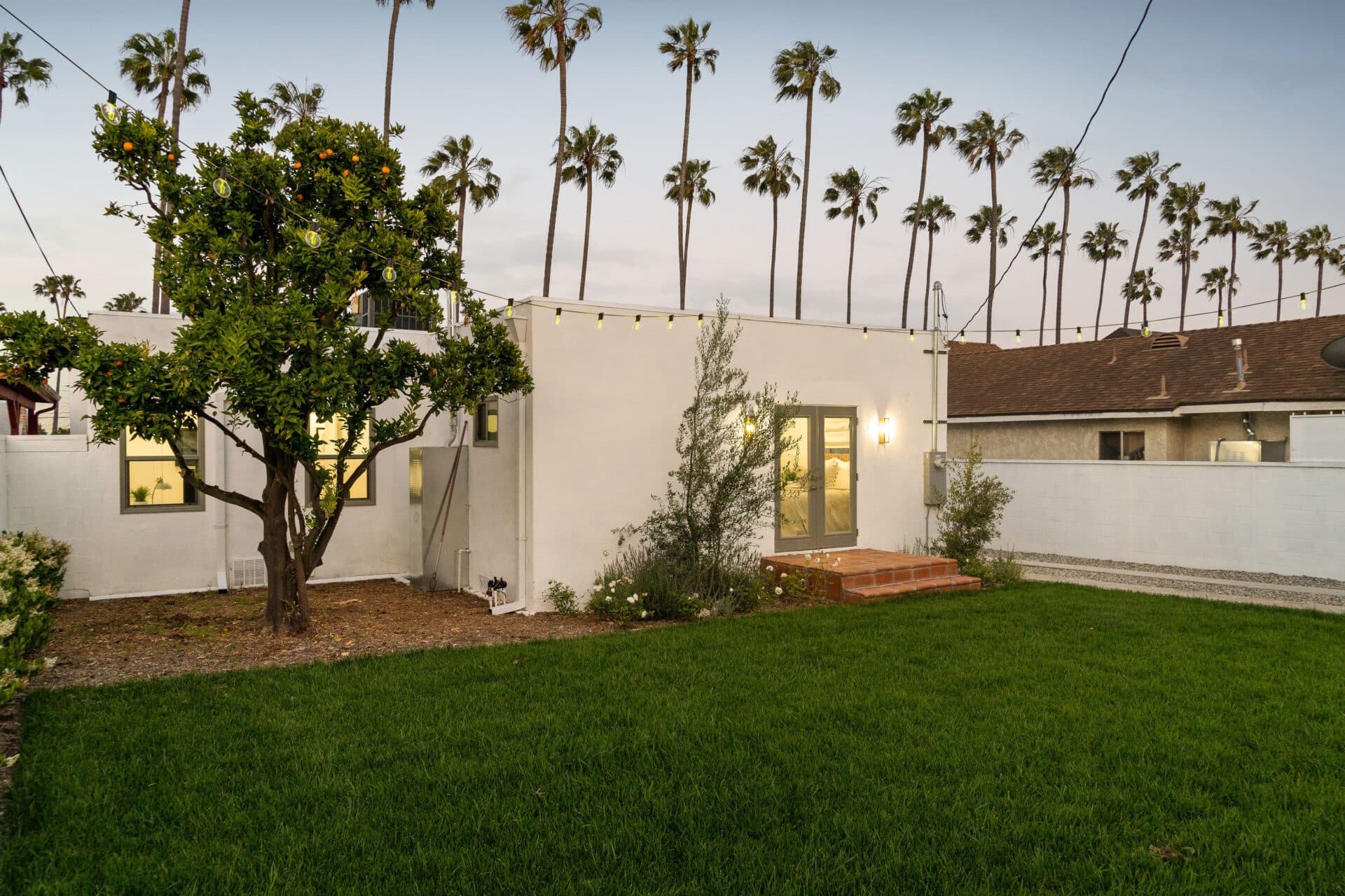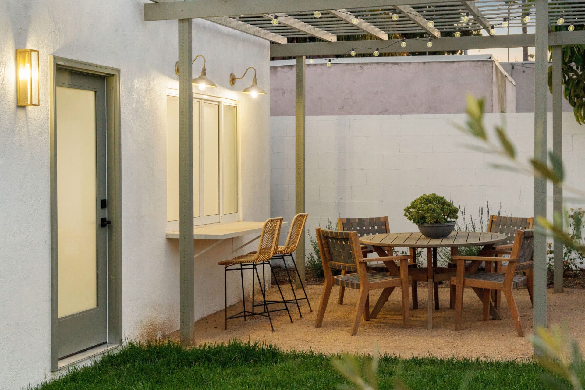 Dining area, with French doors to terrace, opens to renovated kitchen boasting custom sage cabinets, bright stone counters, farmhouse sink, brushed brass hardware and playful backsplash, plus separate office nook with custom built-in desk. Large master suite features dual vanity, freestanding soaking bathtub with designer tile detail, brushed brass hardware and terracotta tile floors, plus ample closet space and French doors to expansive grassy backyard. Two additional bedrooms share a bright hall bath with fresh stacked-tile shower, character terracotta Spanish tile floors and brushed brass detail. Rolling backyard features multiple entertaining options boasting fresh landscaping, pergola, and DG areas, perfect for al fresco dining or twilight entertaining.
