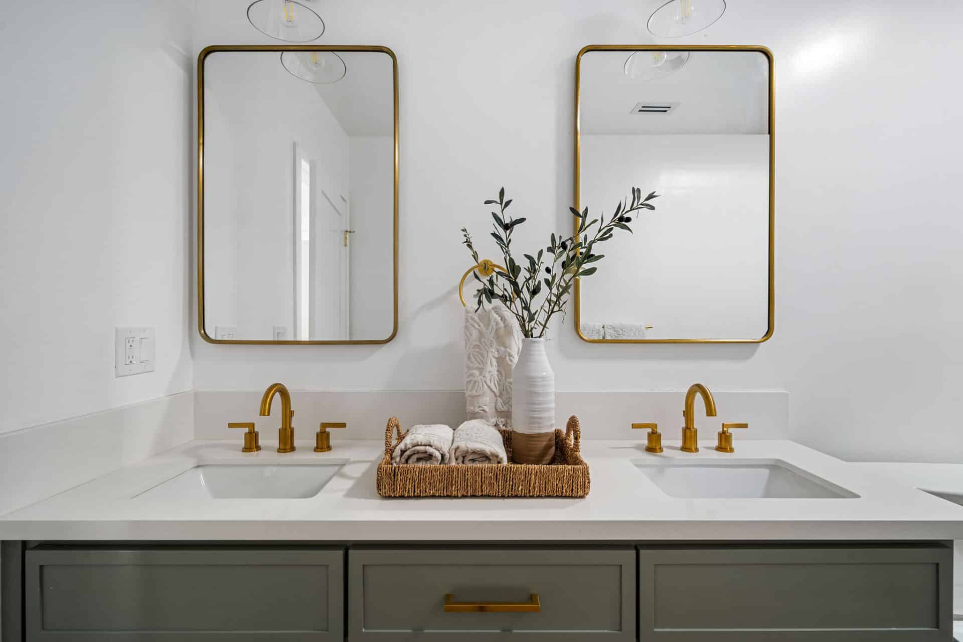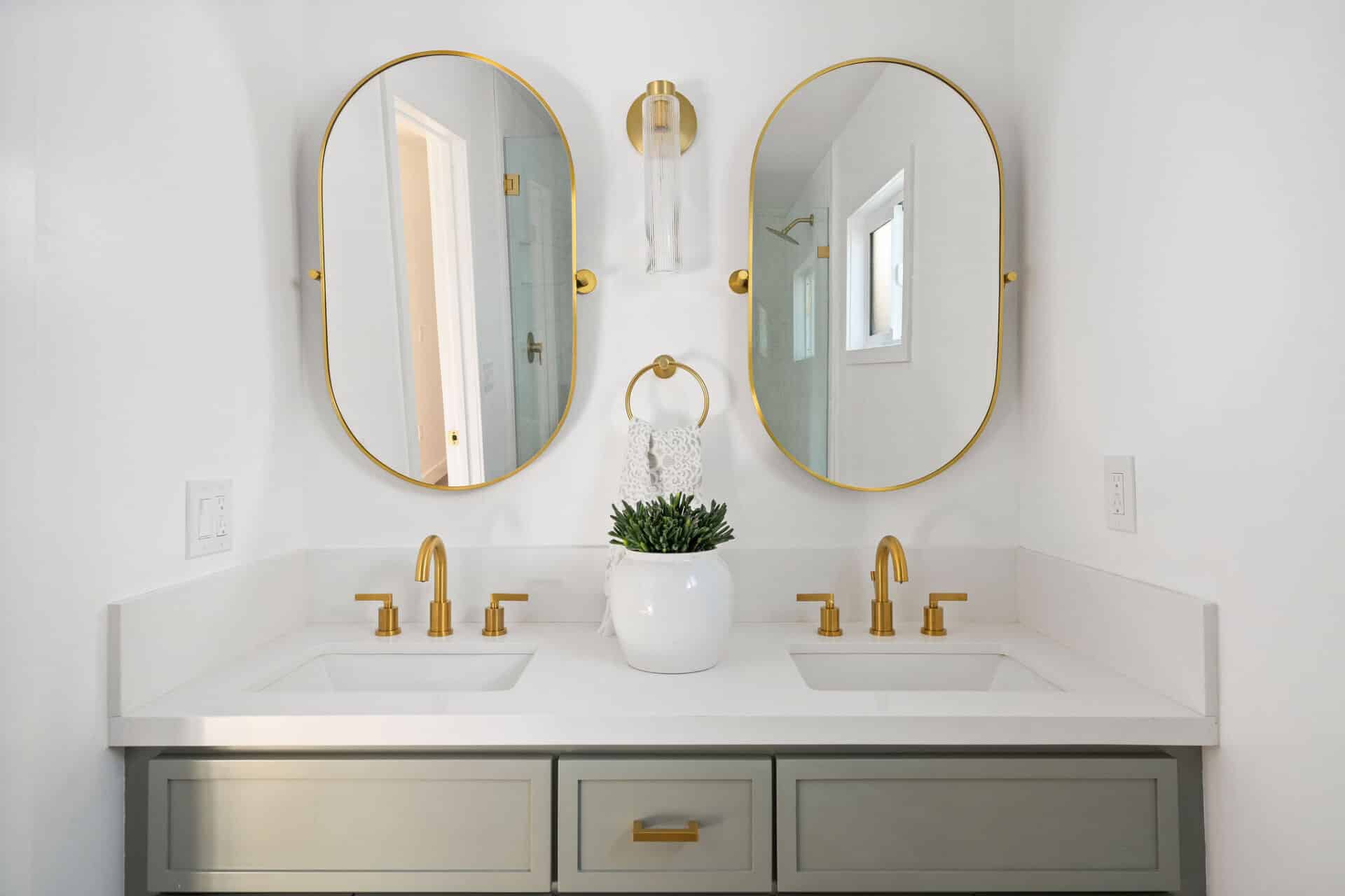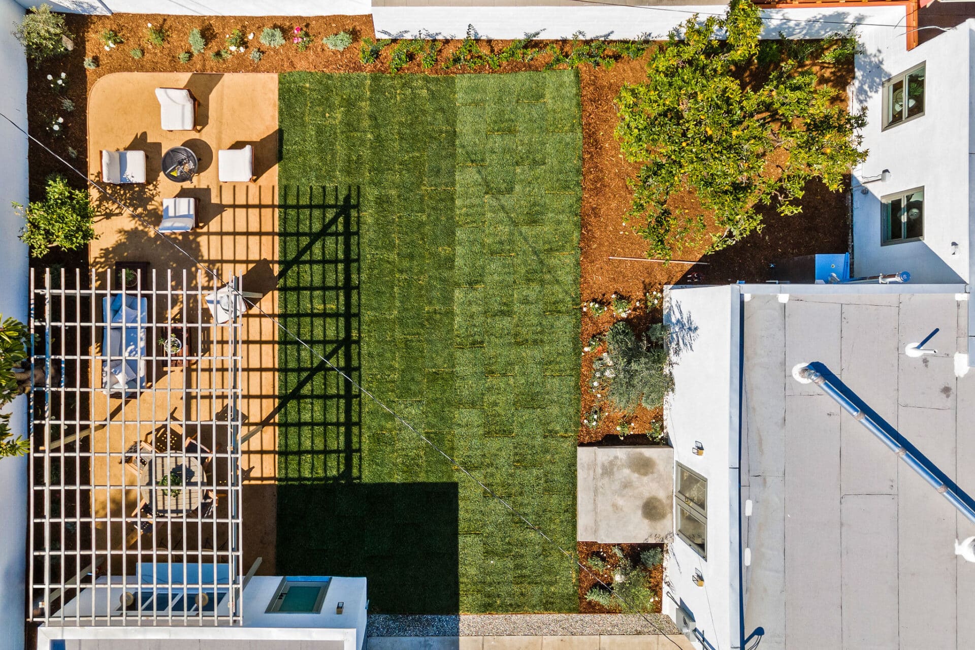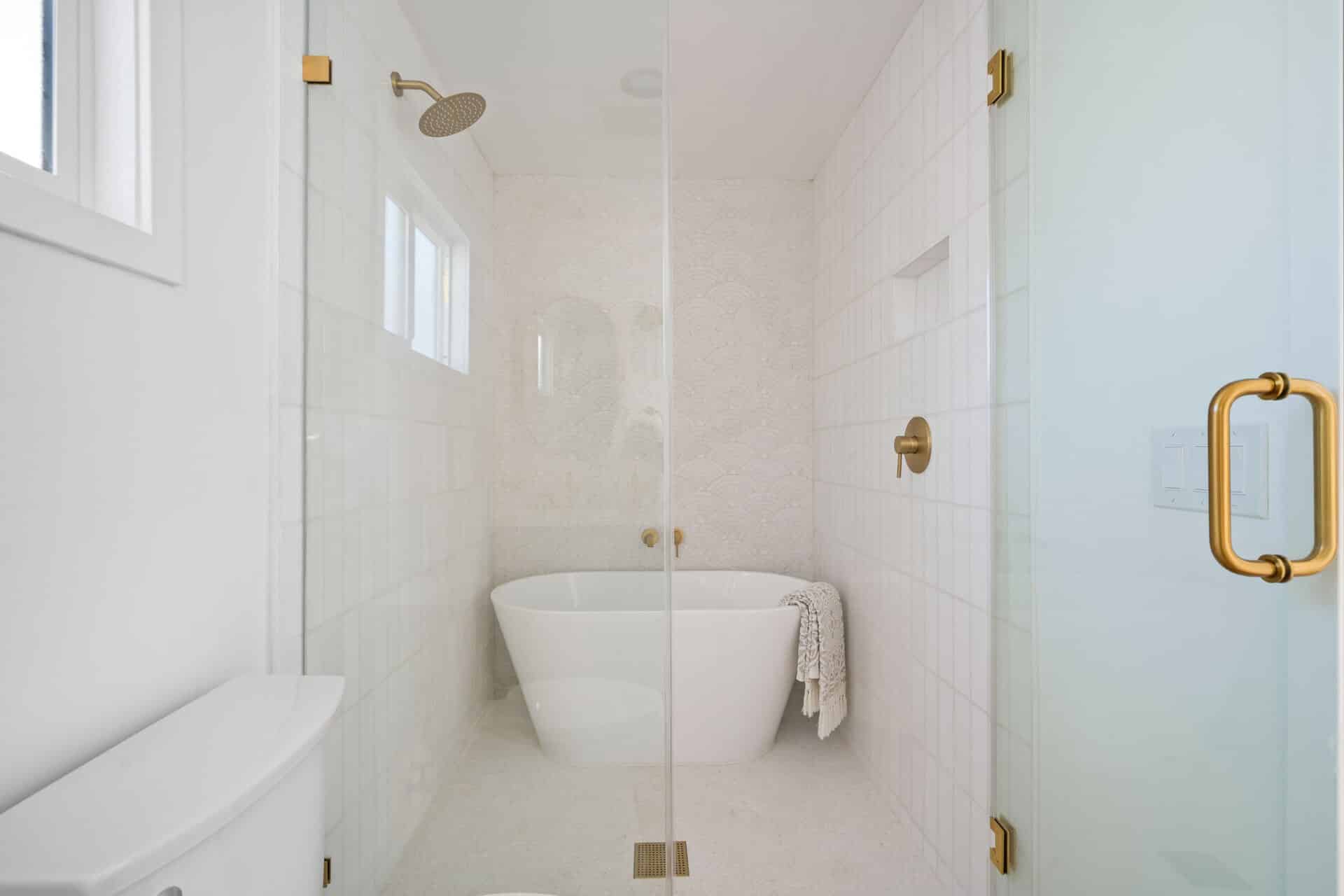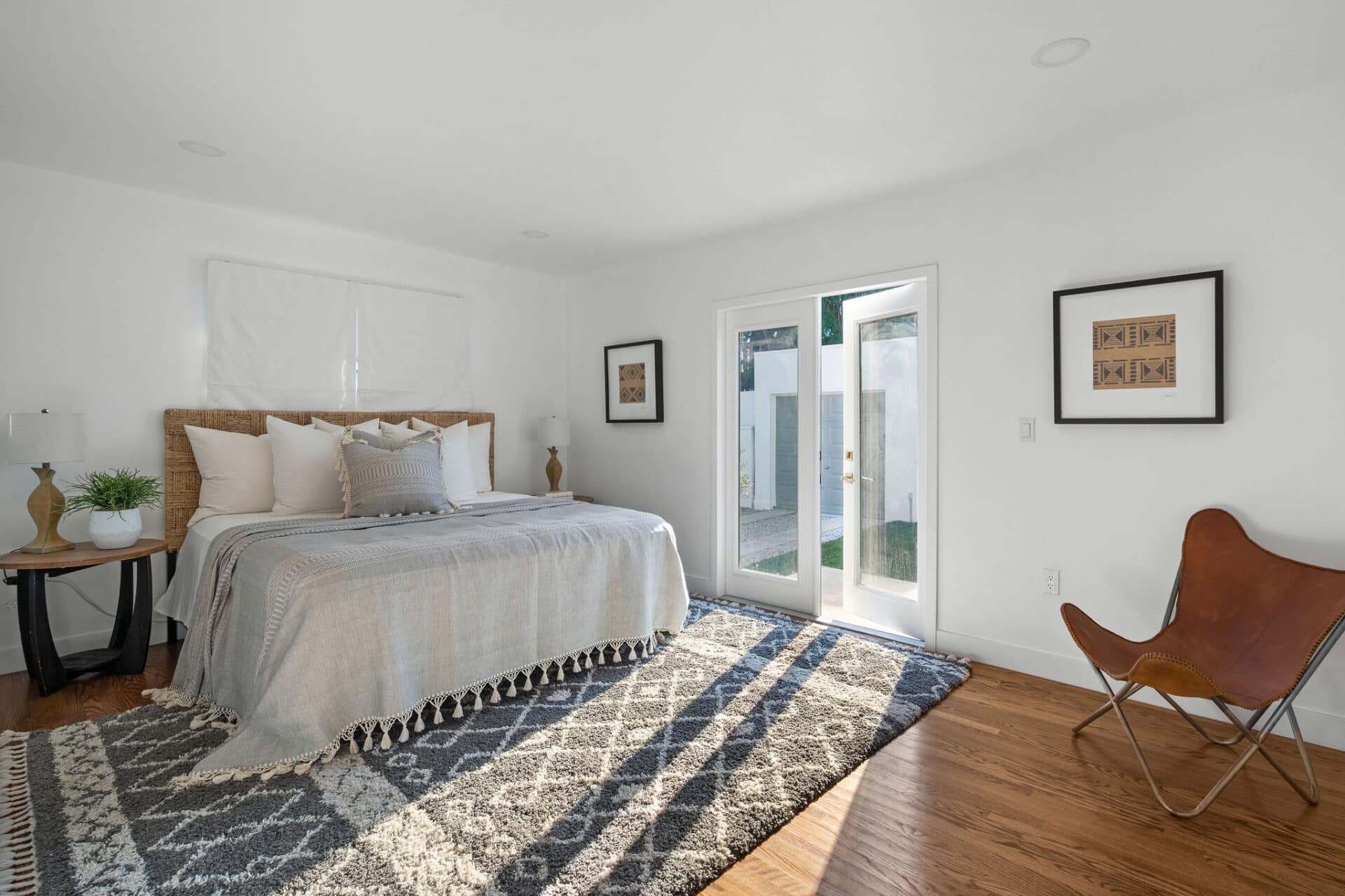 Dining area, with French doors to terrace, opens to renovated kitchen boasting custom sage cabinets, bright stone counters, farmhouse sink, brushed brass hardware and playful backsplash, plus separate office nook with custom built-in desk. Large master suite features dual vanity, freestanding soaking bathtub with designer tile detail, brushed brass hardware and terracotta tile floors, plus ample closet space and French doors to expansive grassy backyard. Two additional bedrooms share a bright hall bath with fresh stacked-tile shower, character terracotta Spanish tile floors and brushed brass detail. Rolling backyard features multiple entertaining options boasting fresh landscaping, pergola, and DG areas, perfect for al fresco dining or twilight entertaining.