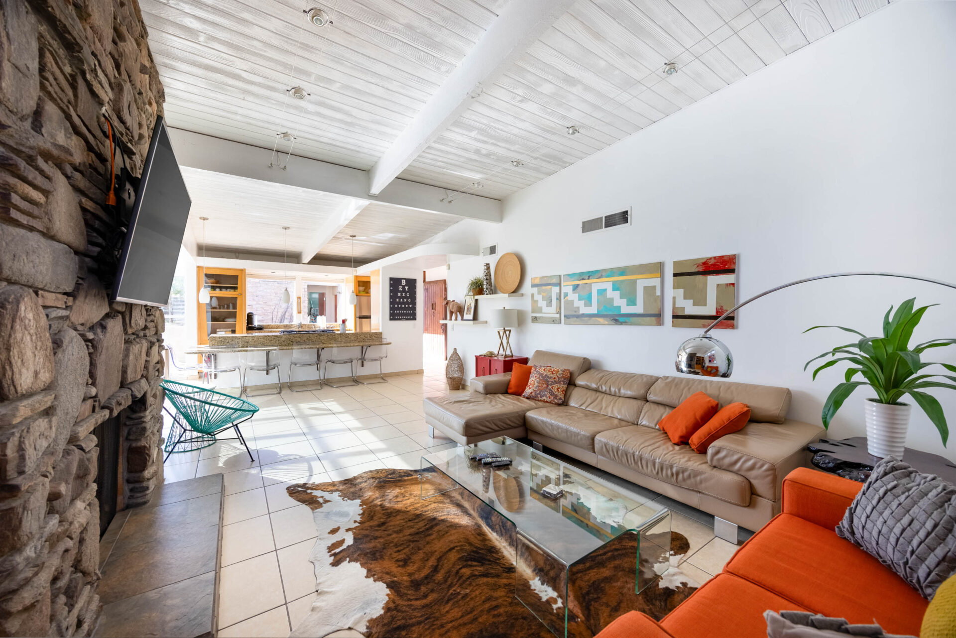What makes this place extra special? Entertain in the spirited modern floor plan, featuring stone fireplace, slatted wood ceilings and tons of character. But dine in the solarium bringing in the sunset or the night stars. Sunshine streams through the windows, making the whole house glow with that magical desert light. The kitchen has plenty of space for food preparation, offering stone counters and wood cabinetry, plus breakfast bar for convenience! The home brings the outside in – slide open the doors and you’re in your private oasis, complete with a sparkling pool surrounded by those iconic Palm Springs palms and mountain views. Plus, new solar panels so powerful you’ll have nearly ZERO in electric bills. Every detail feels thoughtfully from the earthy touches to the modern amenities. Privacy, sparkle, and fun–what Palms Springs is made of!