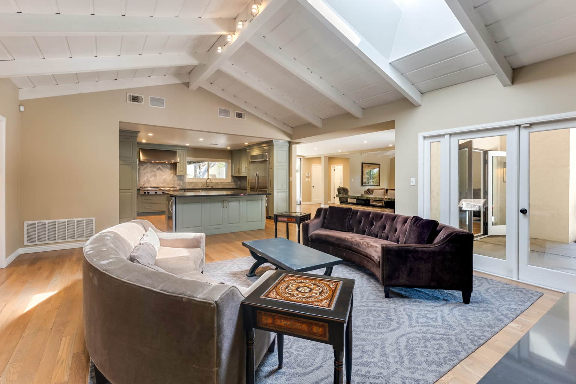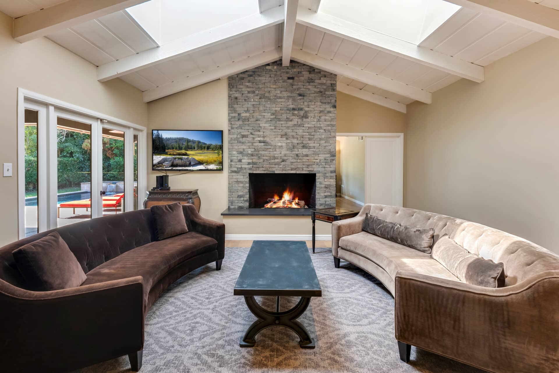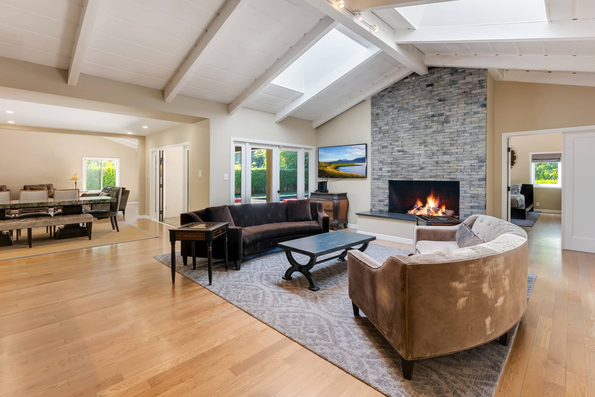 Open living spaces are highlighted by espresso oak floors, vaulted ceilings, skylights through out, and a cozy fireplace, creating an inviting atmosphere.