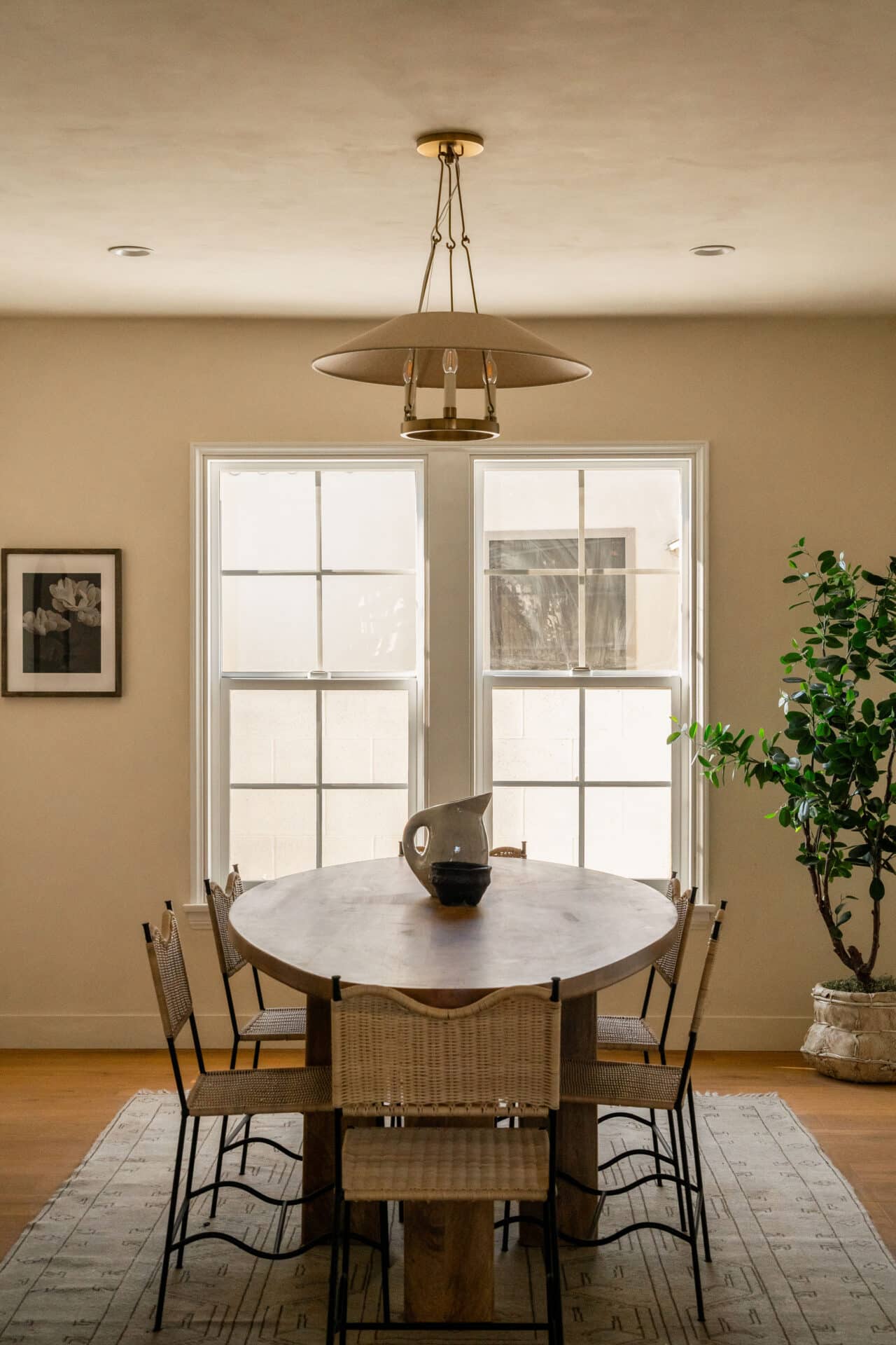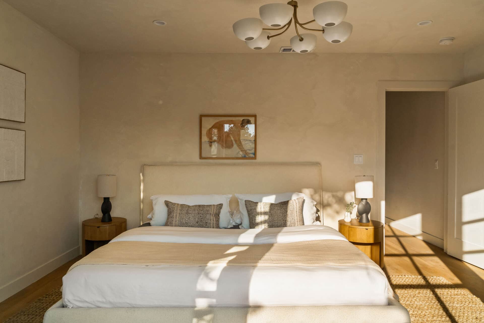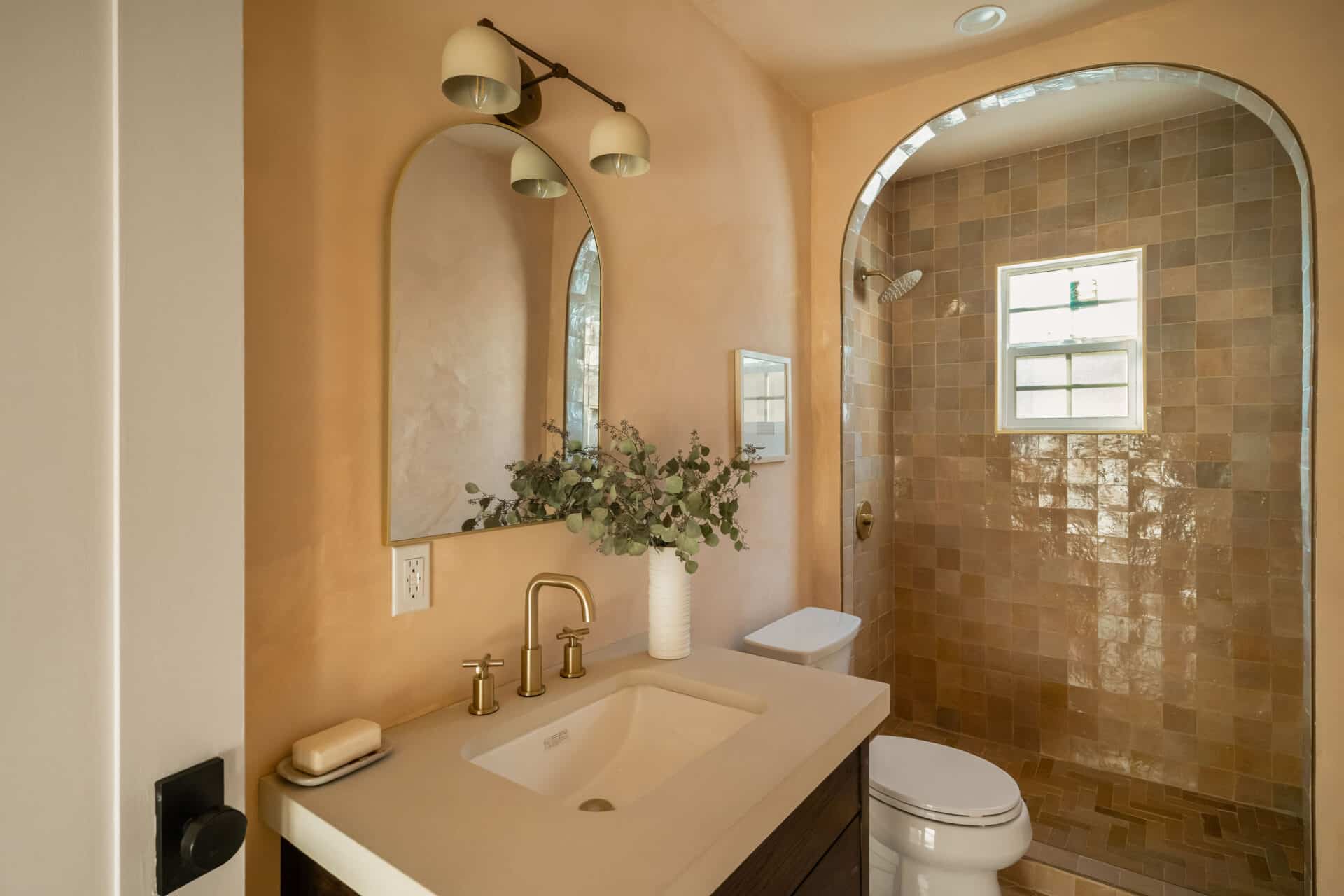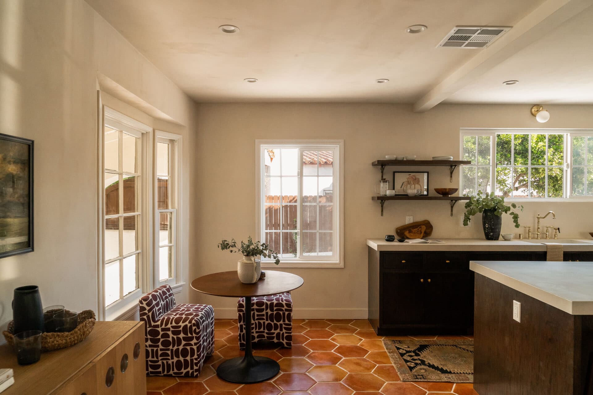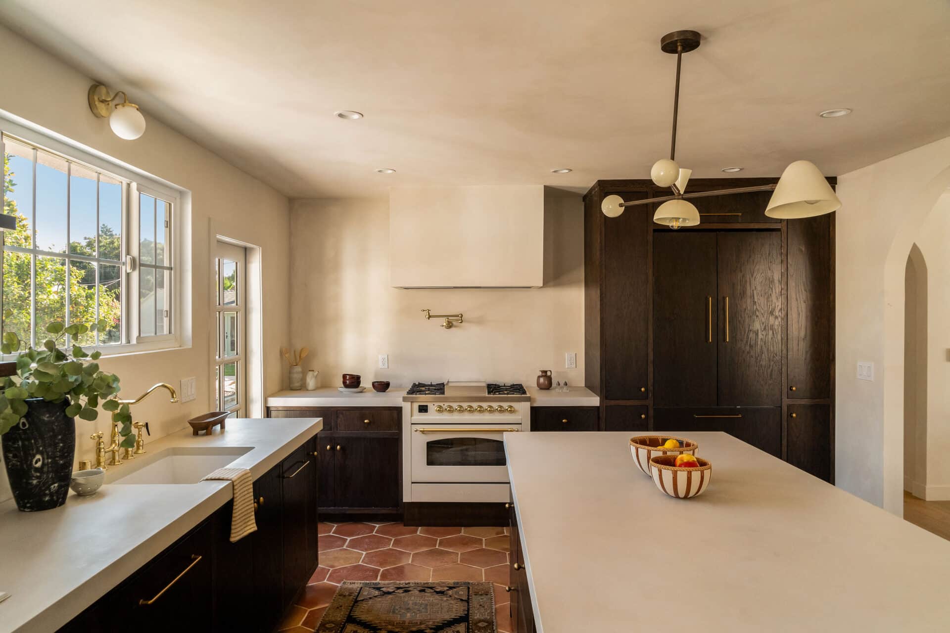 The stained glass picture window bathes the living room in an ethereal light while lime washed walls provide a natural warmth throughout the space. Bask in a sense of grandeur in front of the original fireplace with a saltillo tile hearth and a vaulted ceiling overhead adorned by a brass CB2 chandelier. Archways lead you from space to space, giving a preview of charm that waits beyond. The newly renovated kitchen is a culinary haven with all new custom wood cabinetry, new concrete counters, an island with storage + seating and top of the line appliances. Imagine preparing gourmet meals in this space benefiting from modern luxuries but surrounded by a fresh take on the rich history of the home.