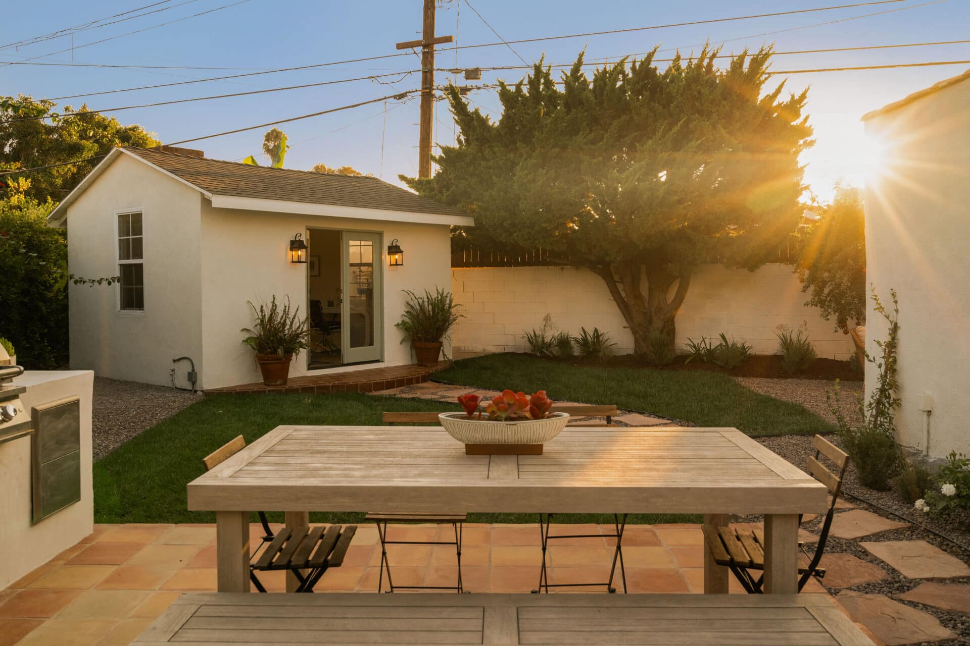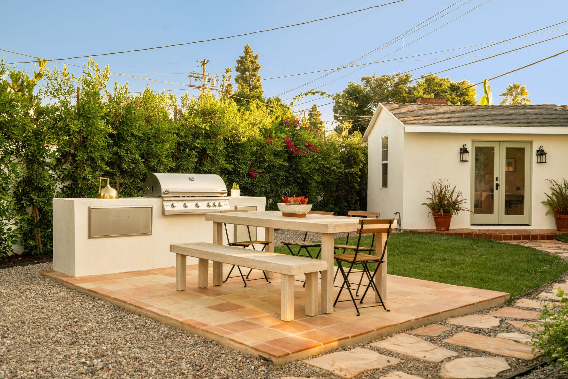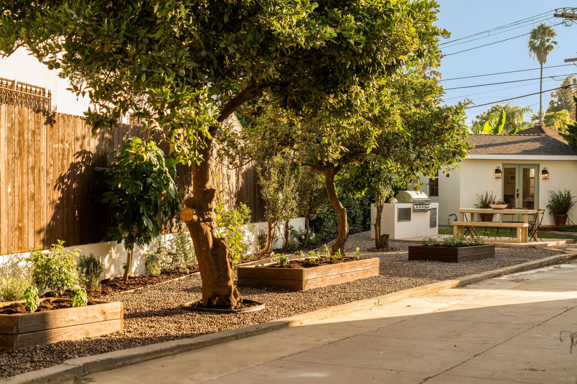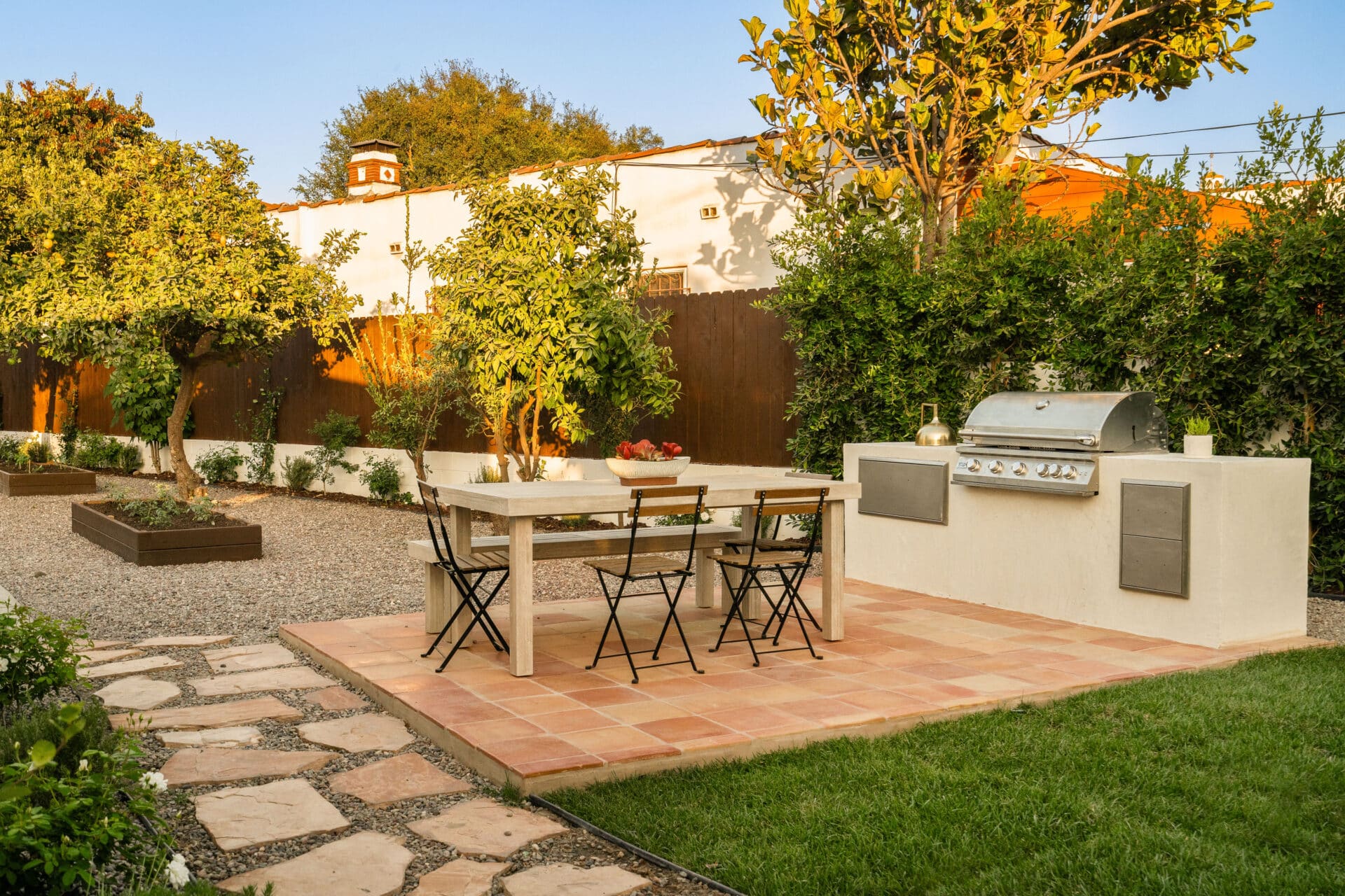 Each of the three generously sized bedrooms is a sanctuary of comfort and style. The primary features french doors to an outdoor patio, dual customized walk-in closets, and an en-suite bathroom with a soaking tub and separate shower. Imagine unwinding in your luxurious suite after a long day, surrounded by the soothing ambiance of the spa-like atmosphere. The additional bathrooms have been thoughtfully designed with eclectic yet cohesive finishes, featuring custom arched showers, authentic Zellige tile, and brushed brass finishes. Step outside to a sprawling outdoor space carefully divided into multiple entertaining and lounge areas, encircled by fruit trees and mature ficus hedging. Wake up to the sounds of birds chirping in your private garden then enjoy a leisurely breakfast with pomegranates picked right from your garden and lemon water with fruit born from your blossoming tree. Satisfy your appetite with produce from your personal farmer’s market with mature fruit trees such as lemon, lime, orange, pomegranate, banana, pepper + more! Multiple planter beds provide more space for herbs + veggies to grow. The newly constructed barbecue area with a 6-burner grill and built-in storage is perfect for hosting al fresco gatherings. Enjoy summer evenings grilling with friends and family, surrounded by the beauty of your own private slice of Los Angeles. The permitted 180 square foot bonus room offers the perfect rec room for entertaining or detached home office. It’s not just the home that makes this property so special.