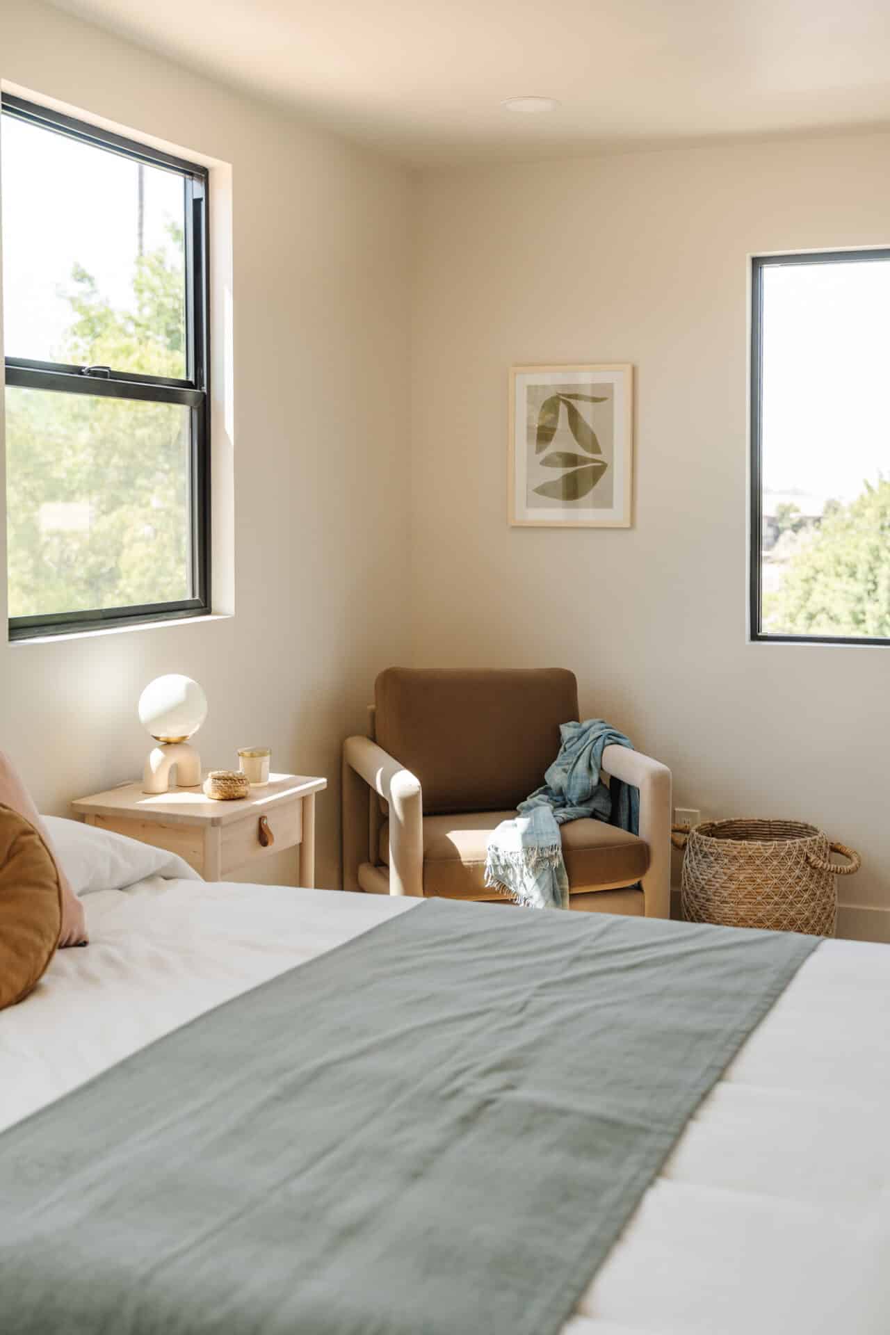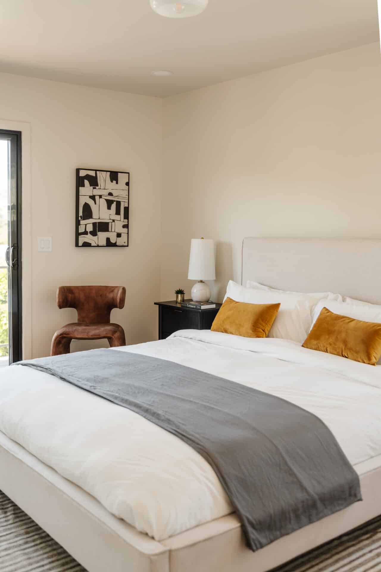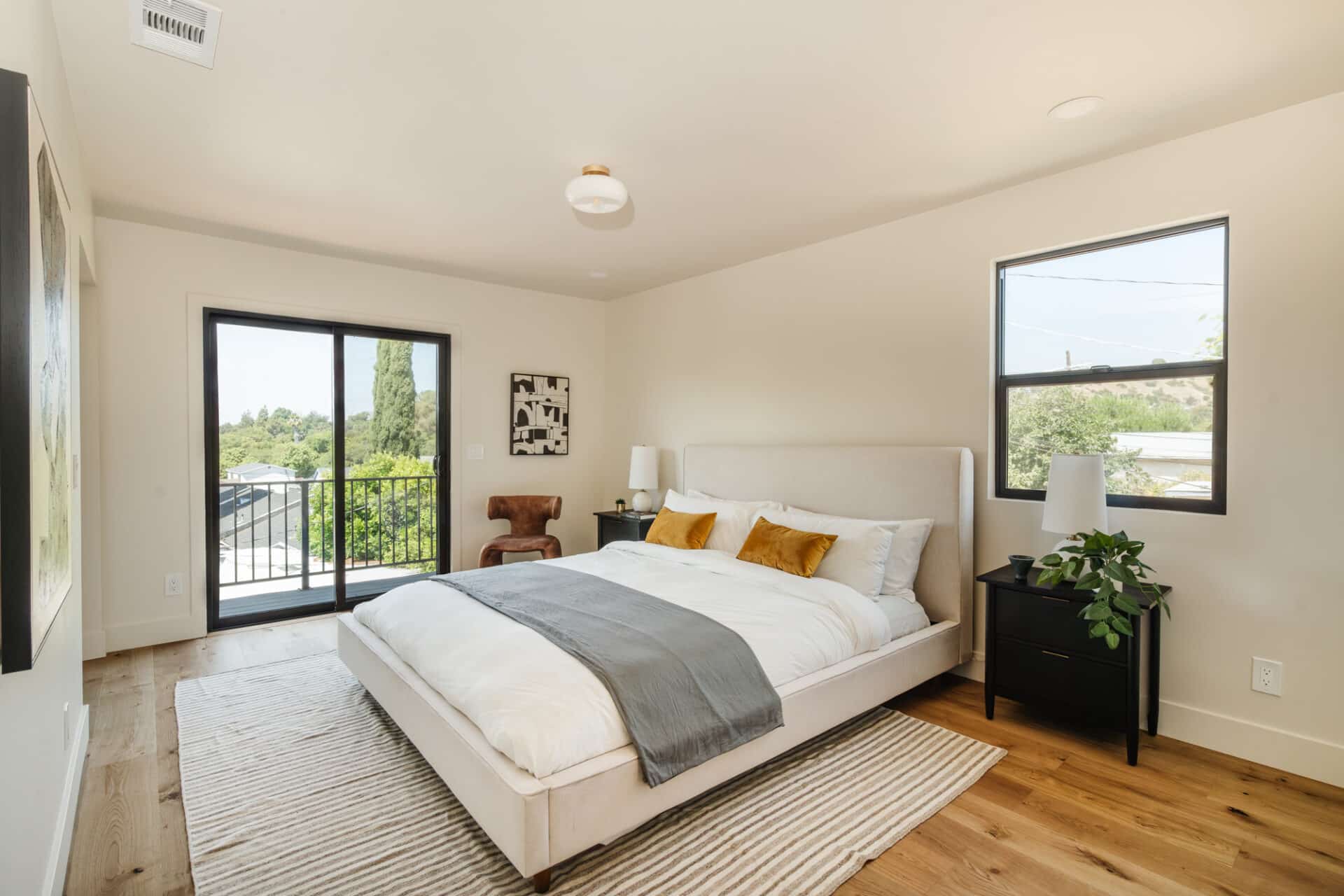 Step through the glass dining room door to the fully fenced and private backyard, perfect for outdoor gatherings and relaxation. Upstairs, you’ll find a second sun-filled bedroom thoughtfully designed for comfort. As well as the primary bedroom offering a private balcony with a view. The upstairs bath continues the theme with venetian plaster walls, Bedrosian tiles, and a glass enclosed shower.