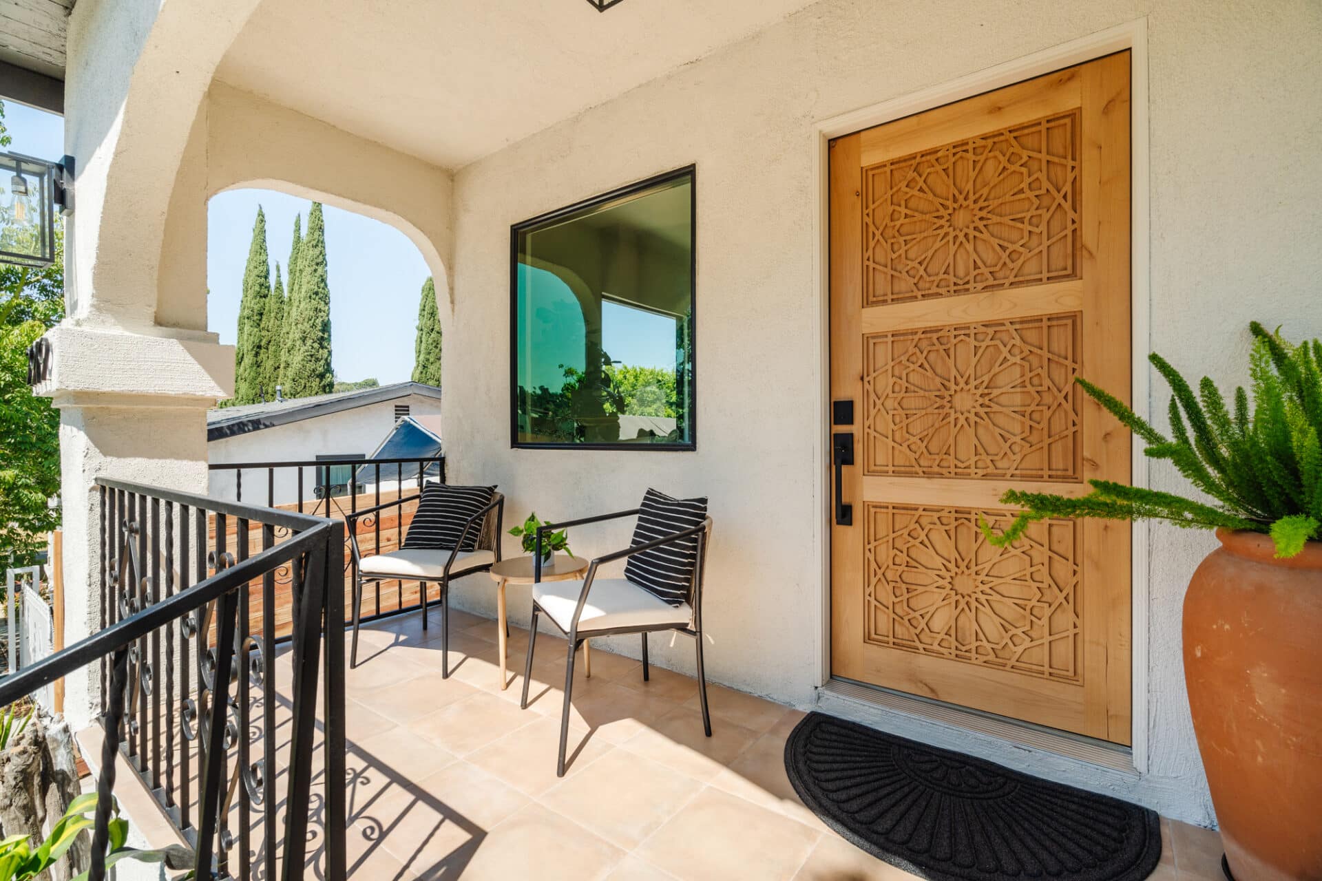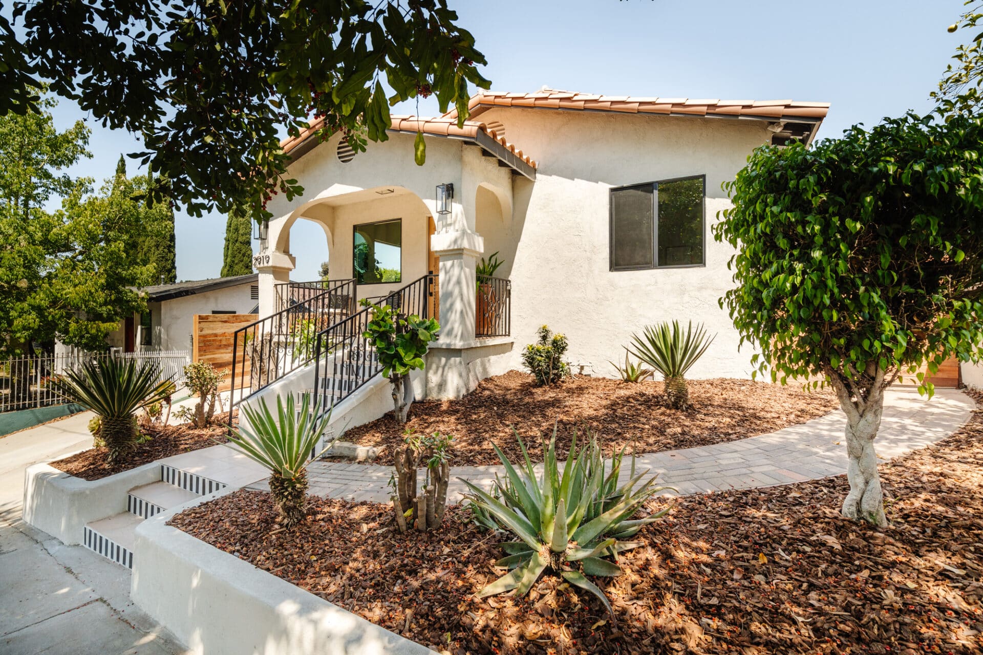 Welcome to this lovely 1925 Spanish home in the heart of Glassell Park. From the moment you arrive, you’ll be enchanted by the charming tile-striped front steps leading to a beautifully carved wood front door. Step inside to the inviting family room, where European wire brushed engineered hardwood floors flow seamlessly throughout the house. The classic Spanish archways guide you to the first private sunny bedroom and bath featuring plaster walls, an enclosed glass shower, and Spanish-inspired Bedrosian tiles.