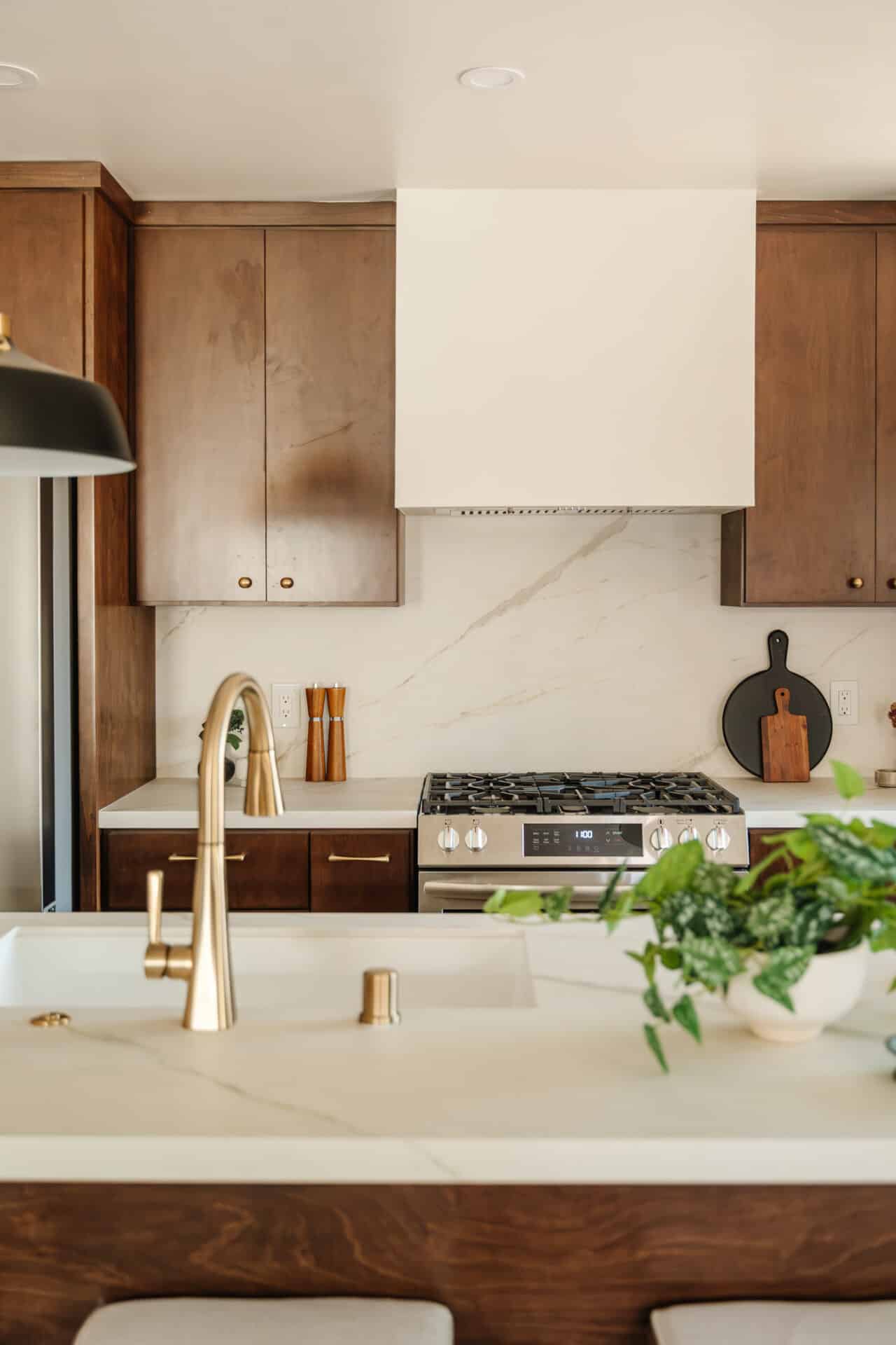 Pass through another archway to discover the open-concept kitchen and dining area. This space boasts stunning honed porcelain Calacatta Oro counters, a full height backsplash, and a waterfall island with bar seating – ideal for hosting dinner parties. The kitchen is adorned with gorgeous flat panel wood cabinetry and stainless steel Frigidaire appliances. Adjacent to the kitchen is a stylish half bath with Spanish-inspired Bedrosian tiles and a spacious laundry room.