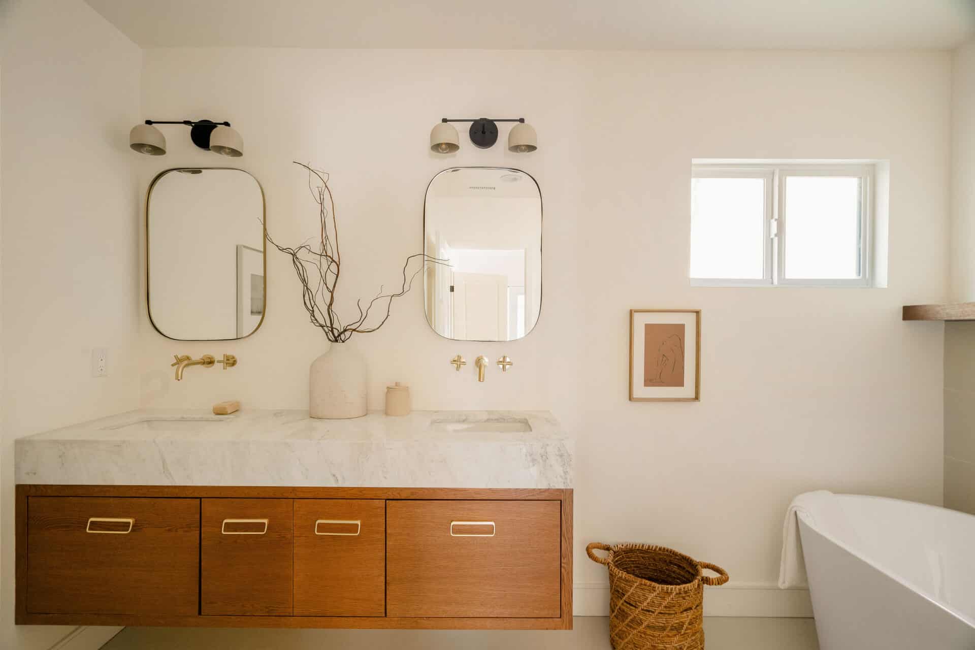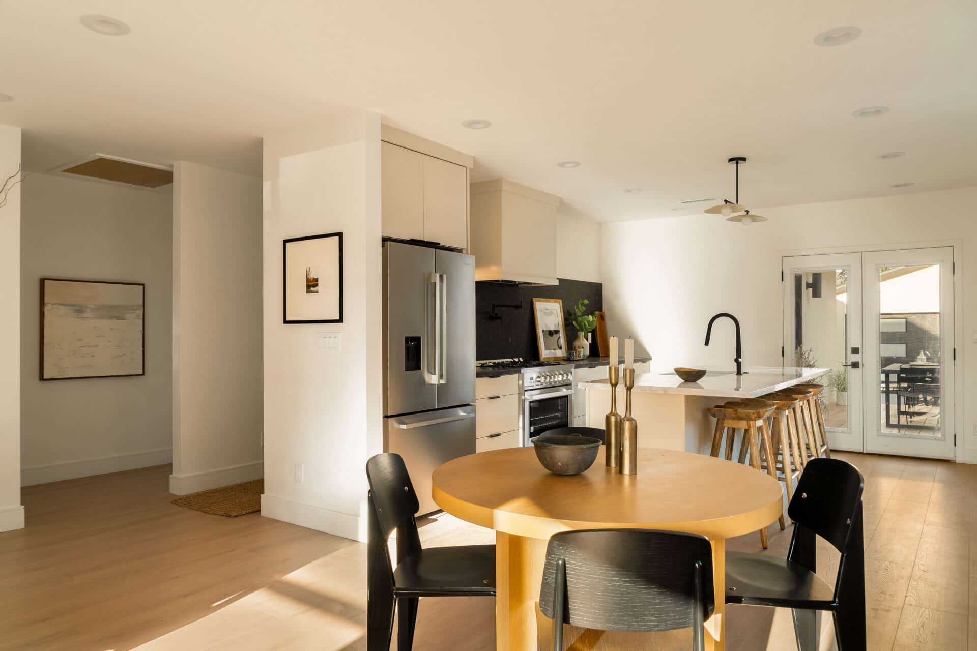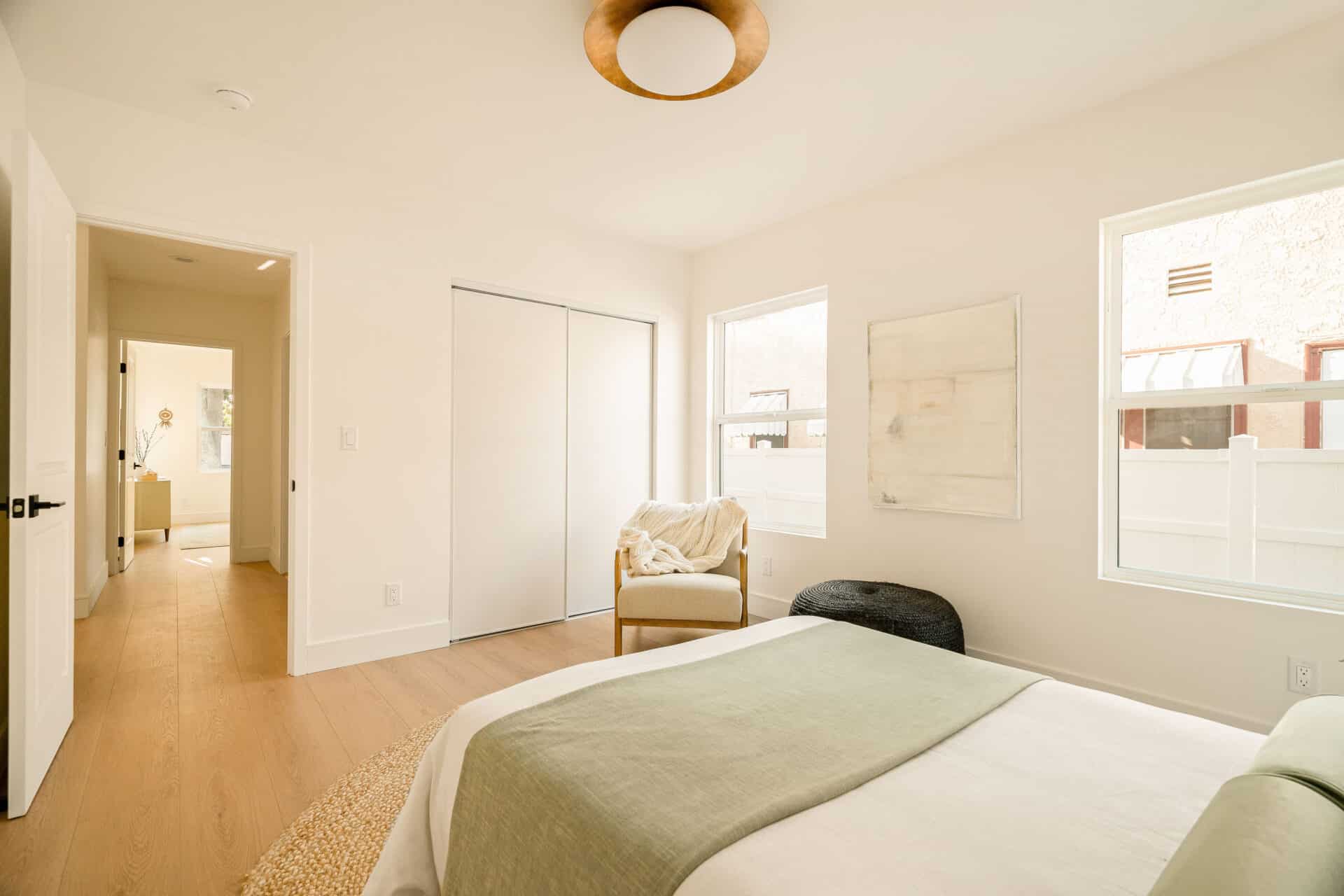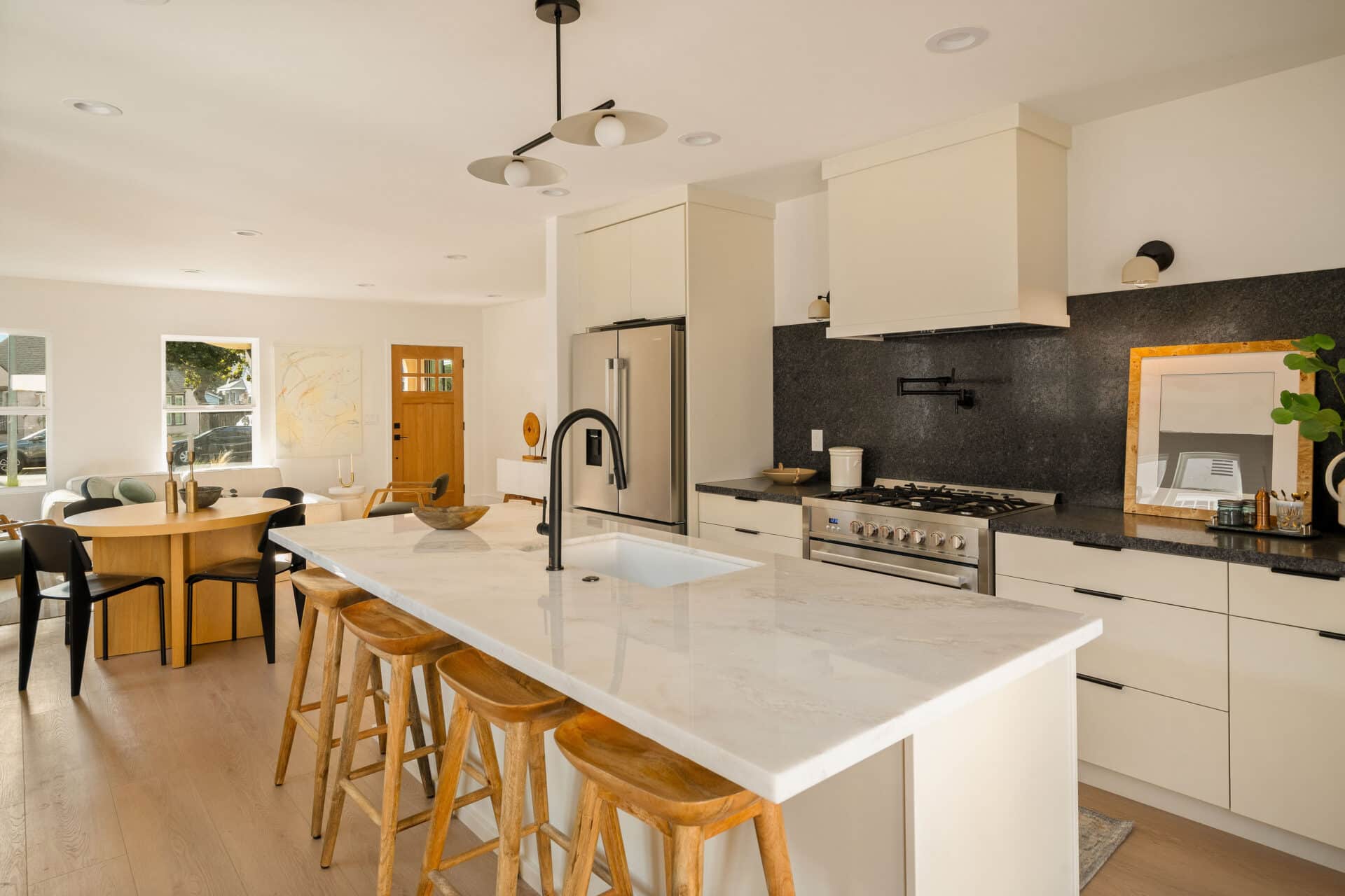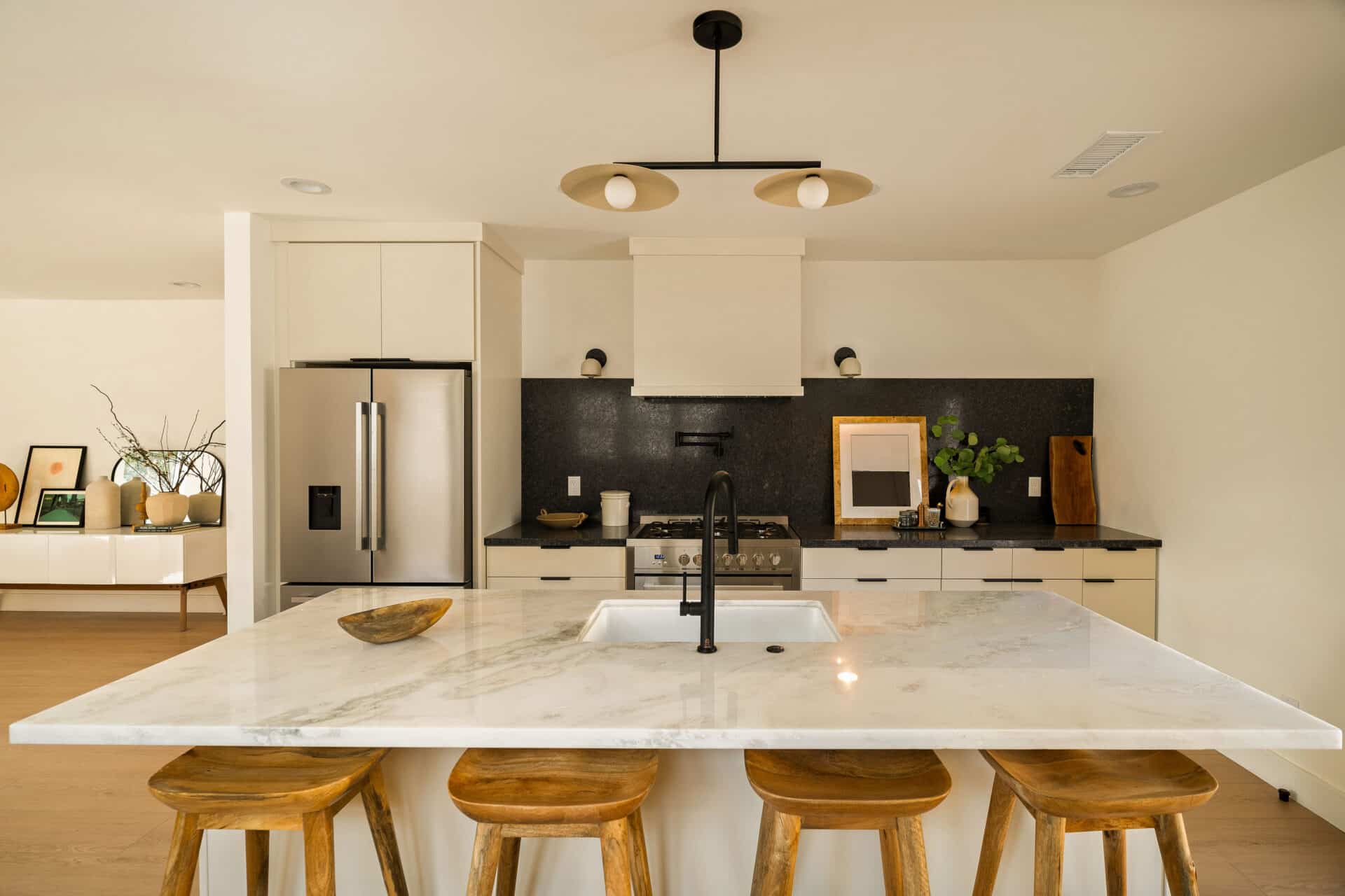 The master suite offers a view of the backyard, plus a walk-in closet and en suite bath with a freestanding tub, custom white oak vanity, and designer light fixtures. Two ample-sized sunlit bedrooms share a stunning hallway bath showcasing marble accents, a tub-shower combo, designer tiles and a custom vanity. With new systems in place, including a new roof, updated electrical wiring with a 200-amp panel, new plumbing, and a new AC system, this home is ready for you to move in and enjoy. It’s more than just a place to live – it’s a cozy and versatile retreat that captures the essence of the California lifestyle. RTI plans for an ADU conversion will be provided.