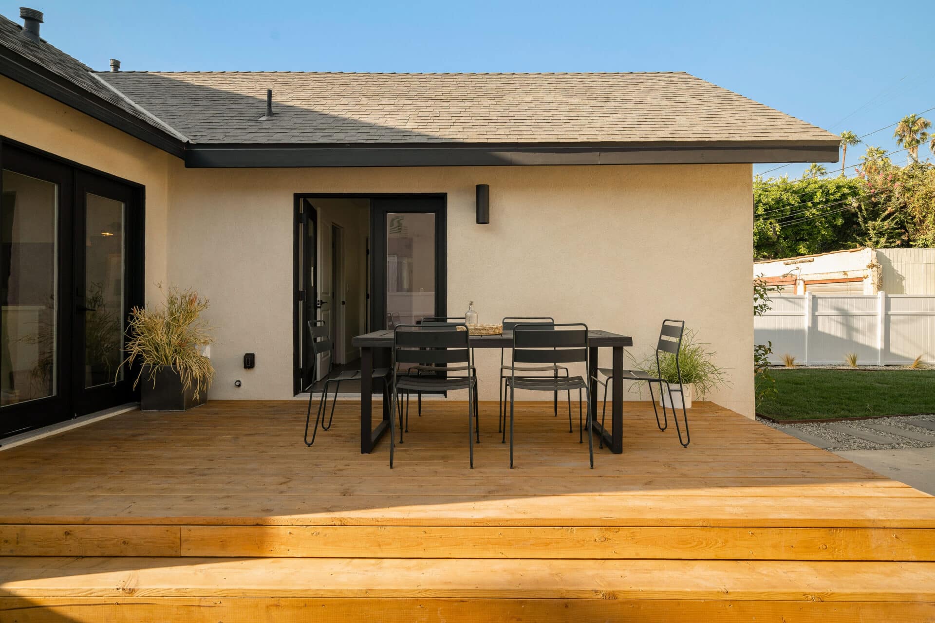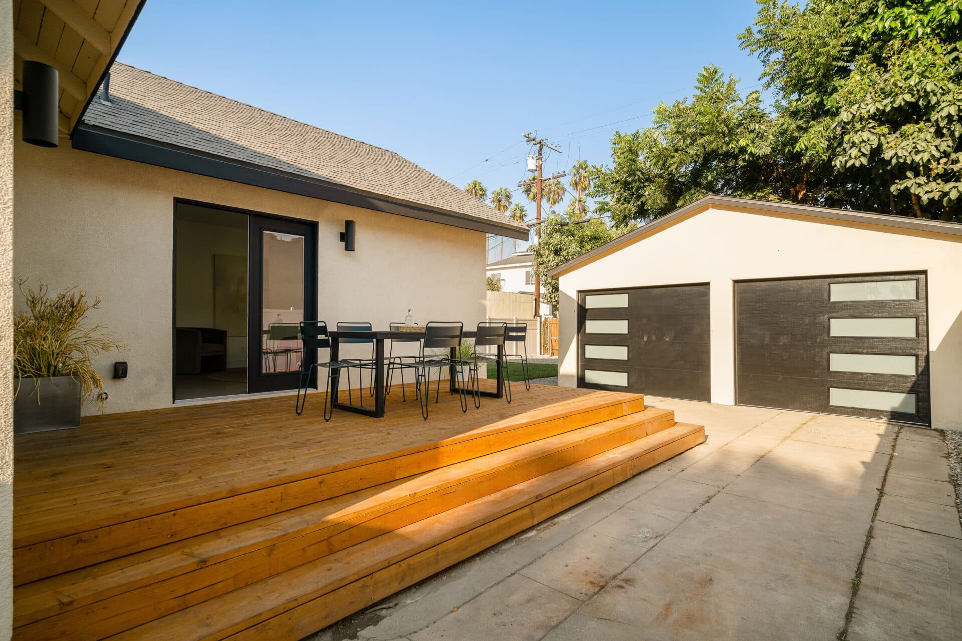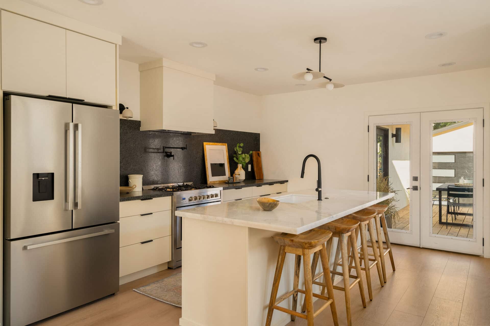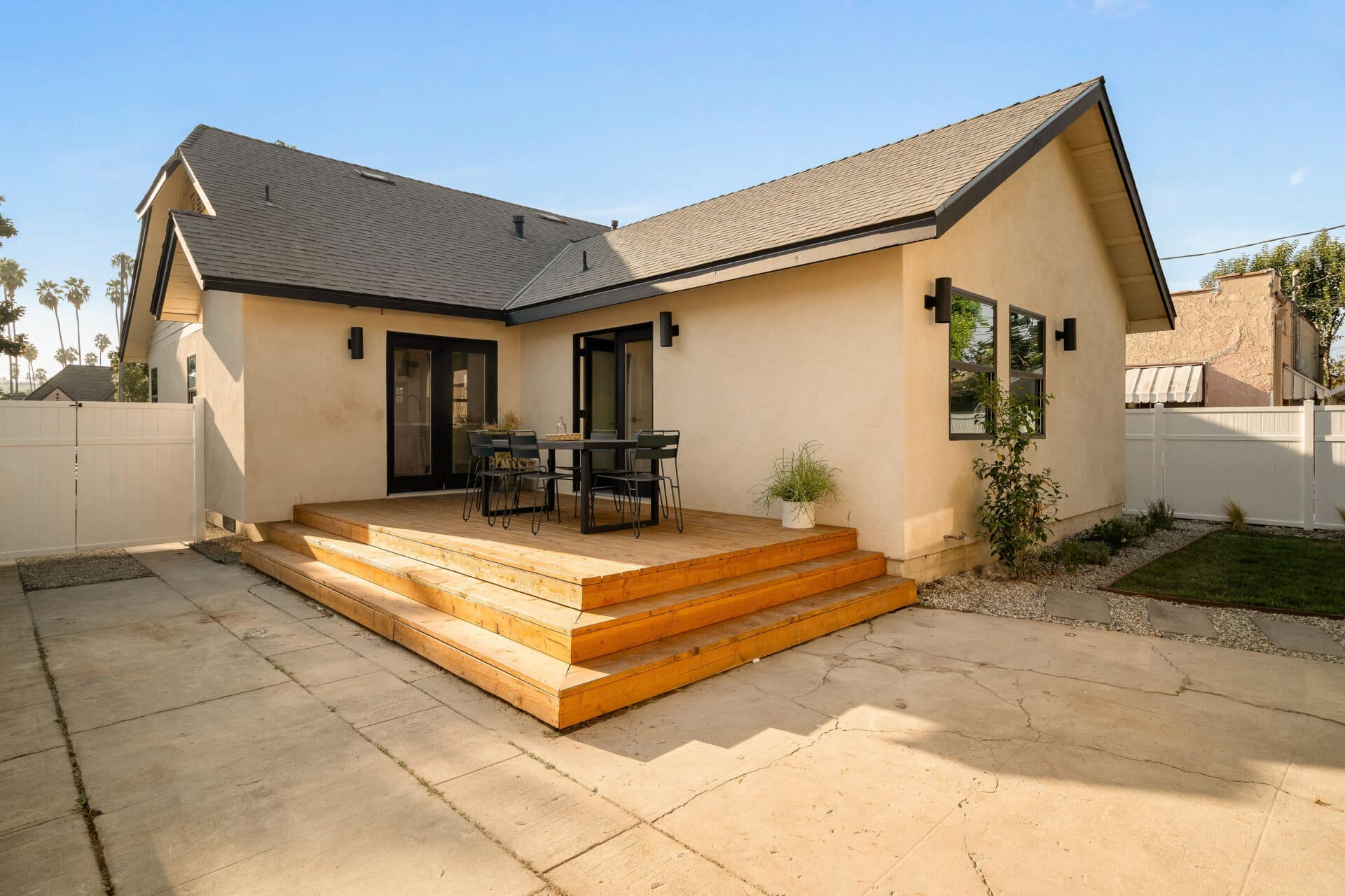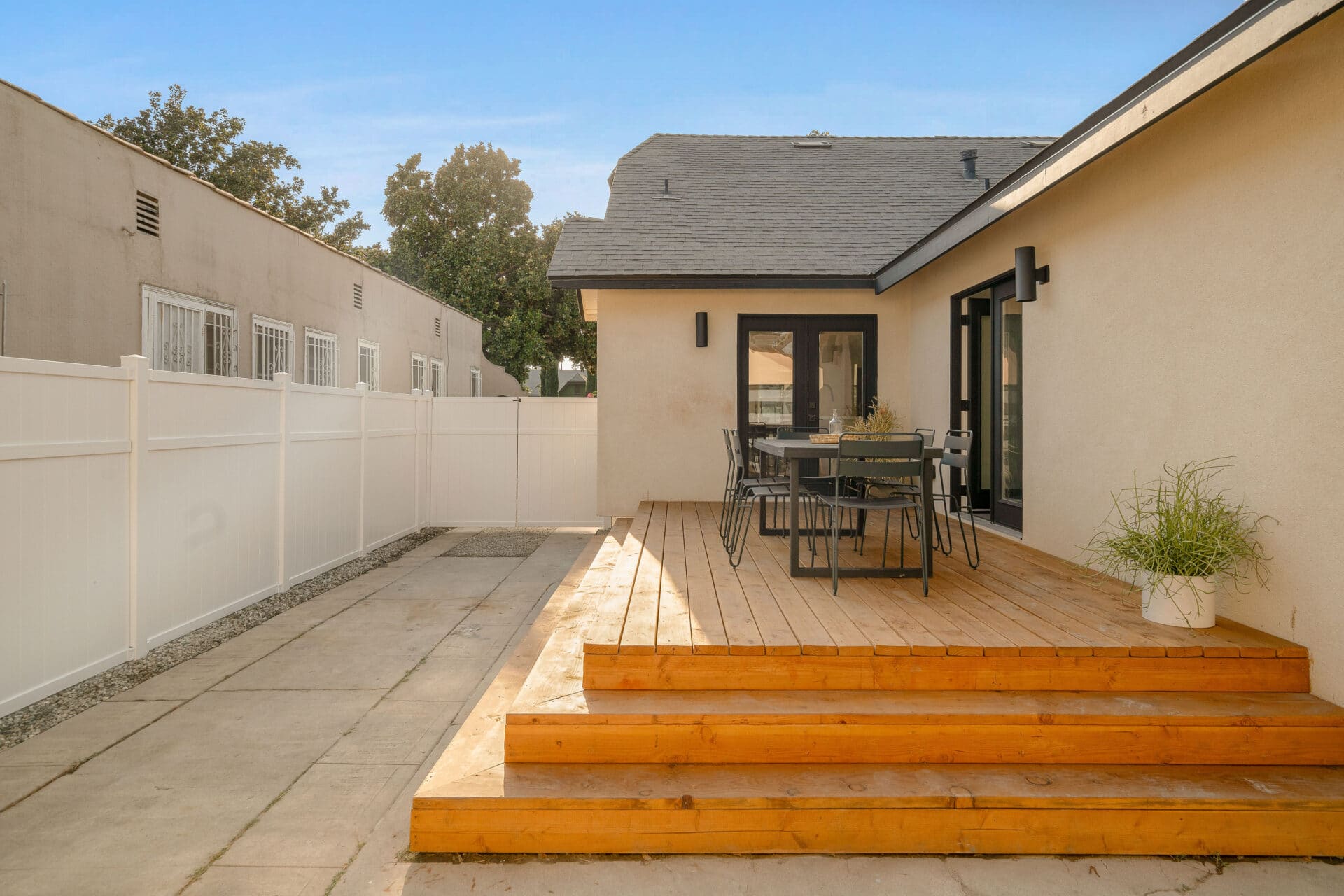 French doors from the kitchen open to a large deck, perfect for outdoor dining and relaxing, with steps leading down to a generous yard.