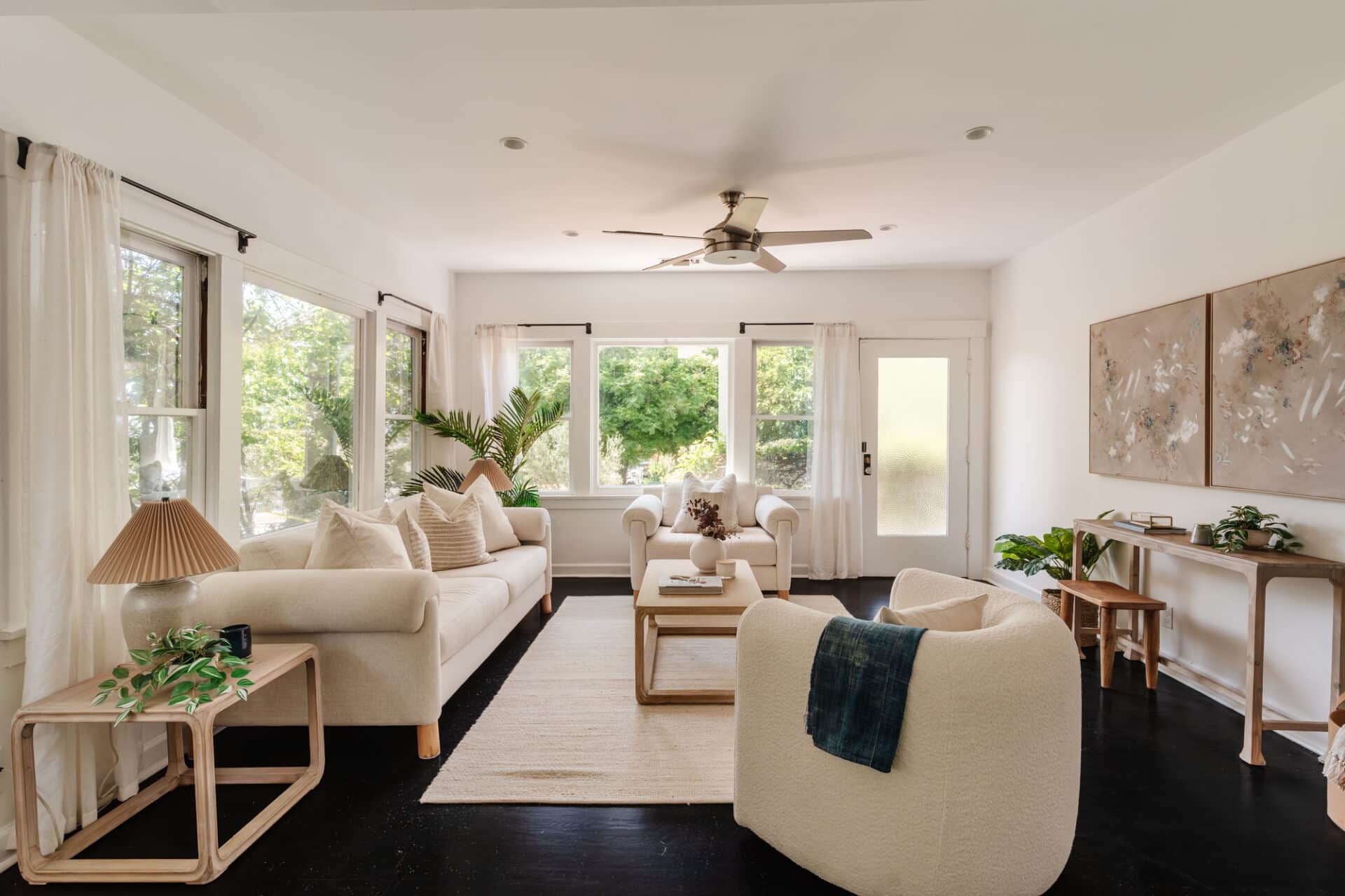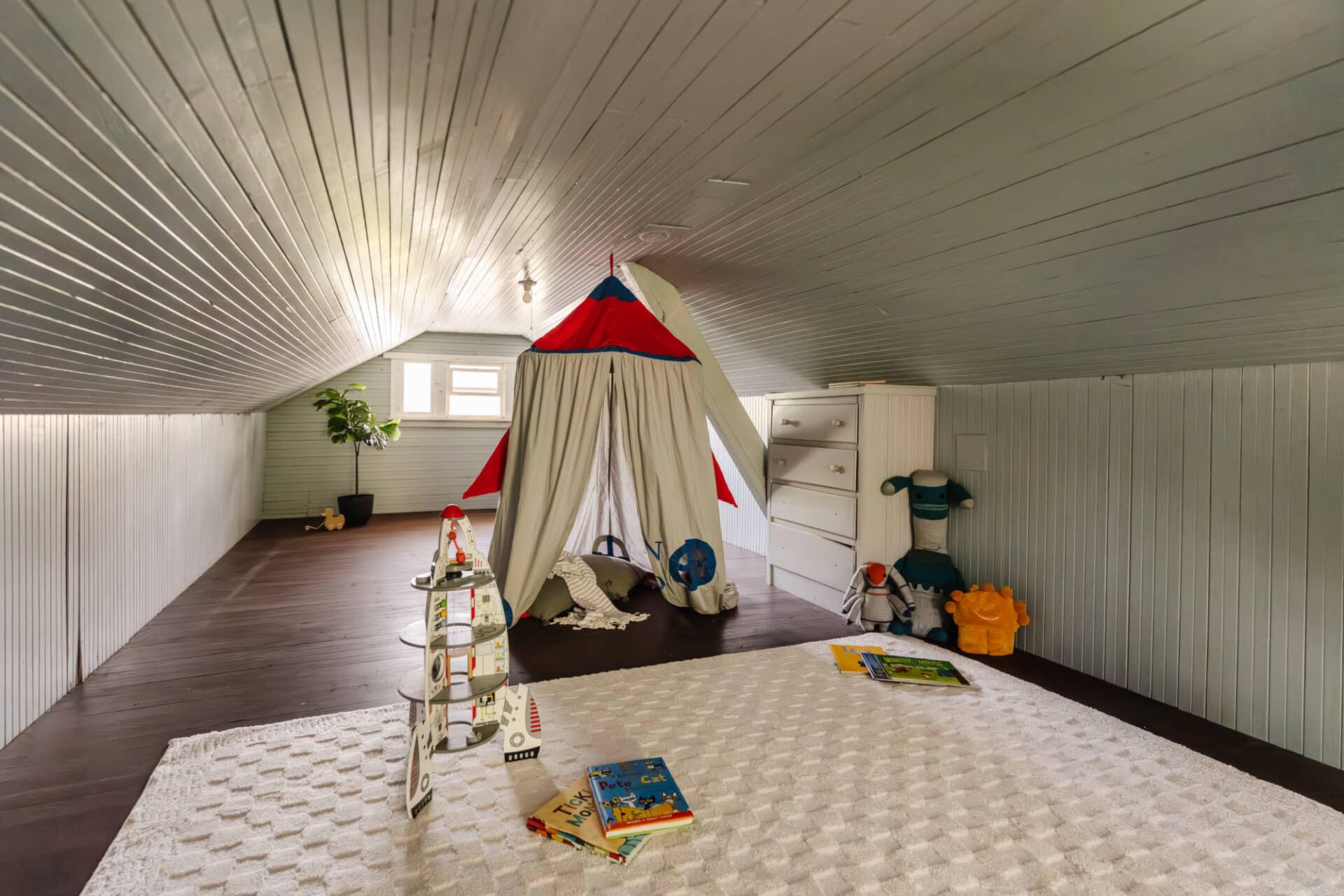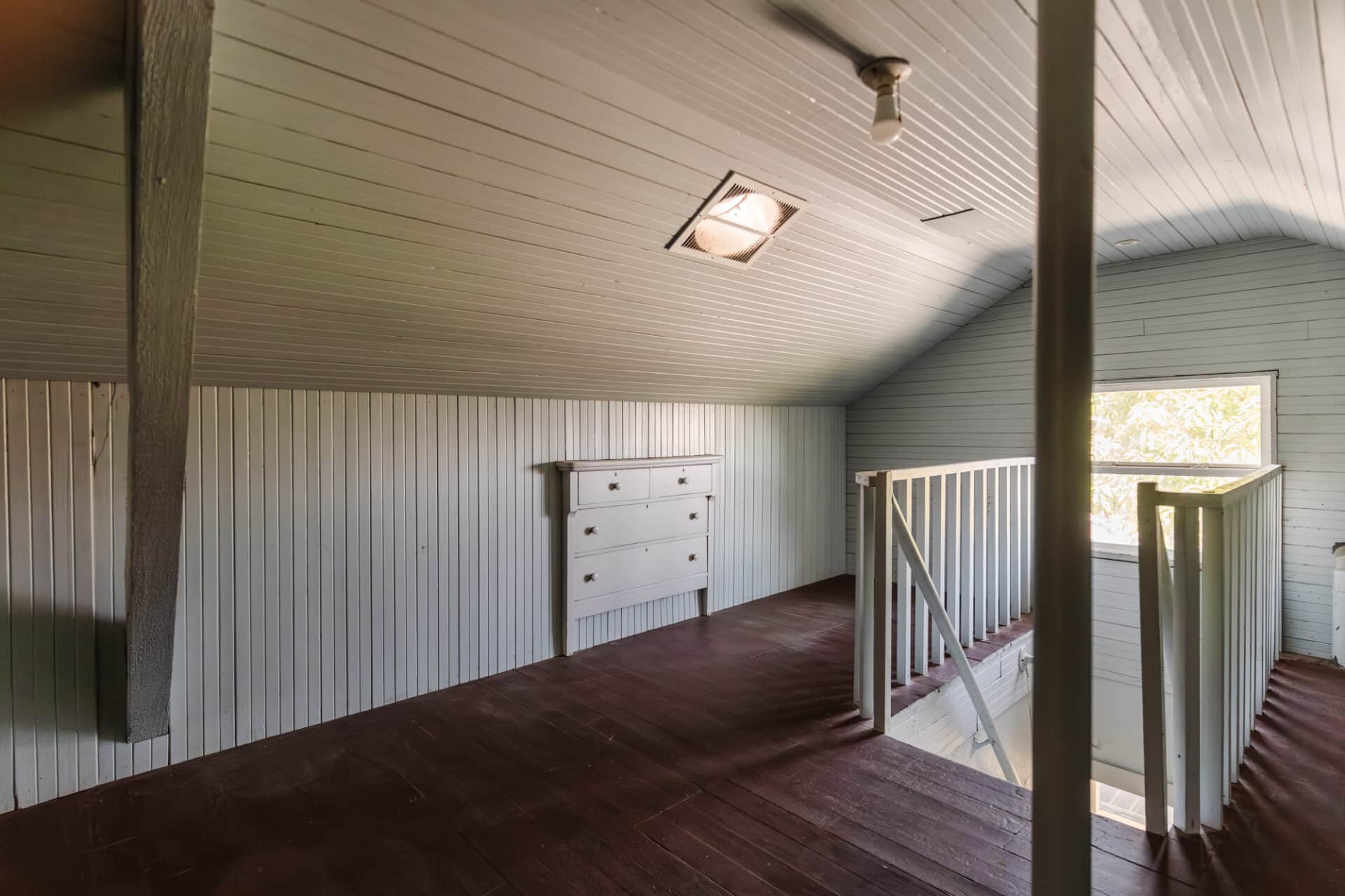 Down the hall, two bedrooms are peaceful and light-filled, with a stylish hall bath offering a shower over tub, modern dual vanity, and updated lighting. A laundry room with built-in storage keeps the essentials tucked neatly away. Upstairs, a spacious attic with wood floors awaits—overflow bedroom, secret play space, or dreamy studio retreat? You decide.