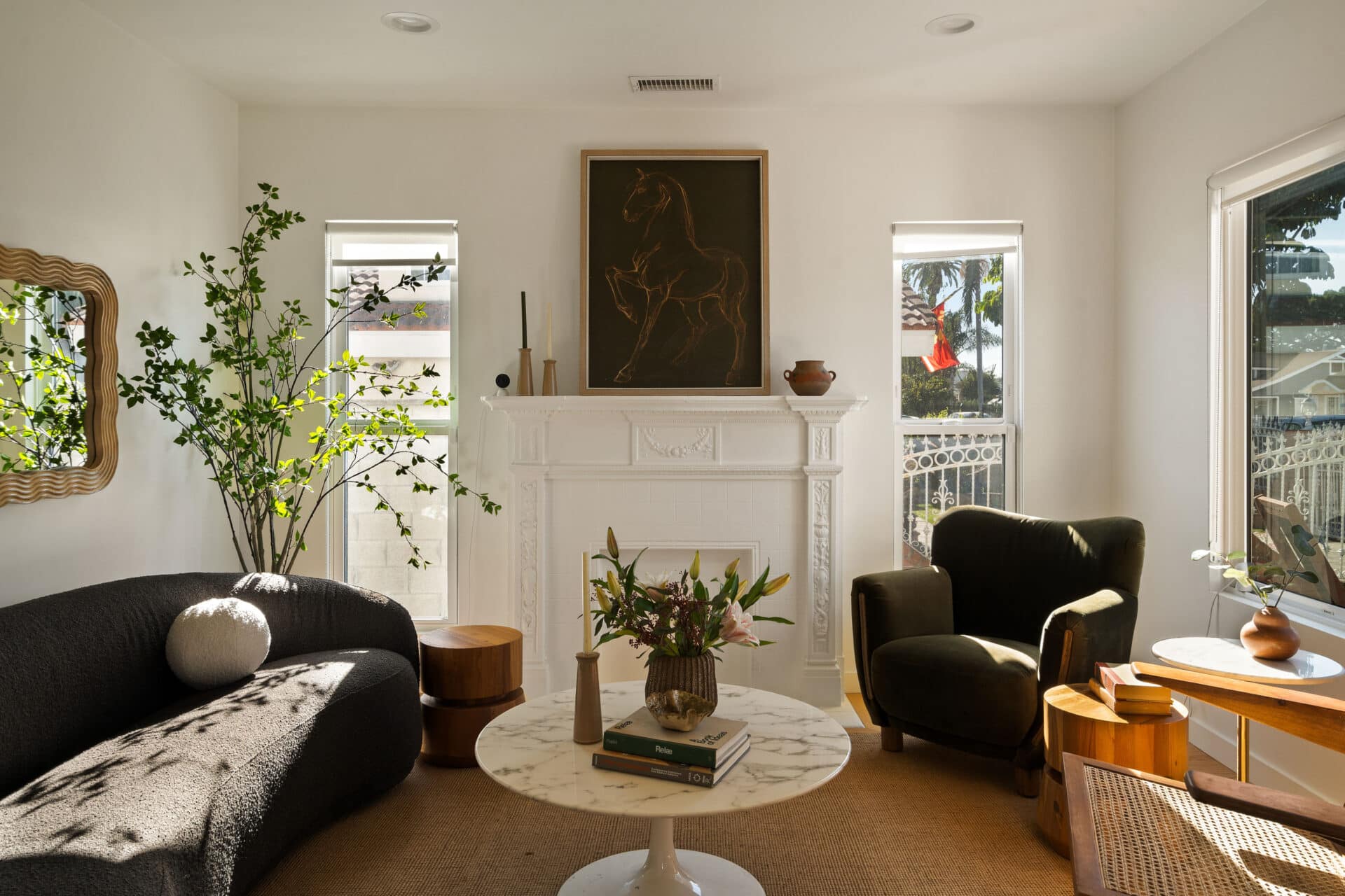 Enter into a sun-kissed living room adorned by a decorative original fireplace and warmed by refinished original wood floors.