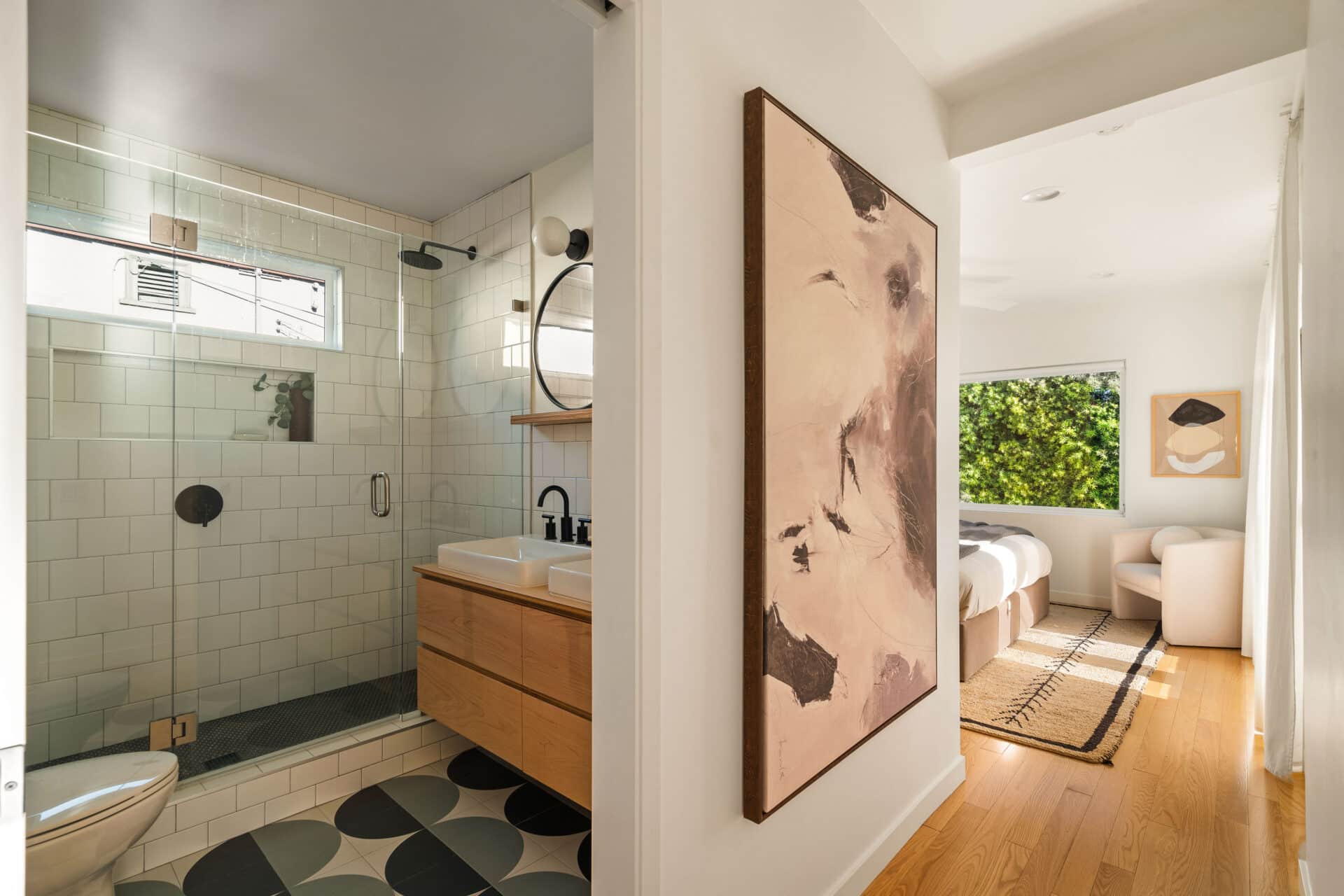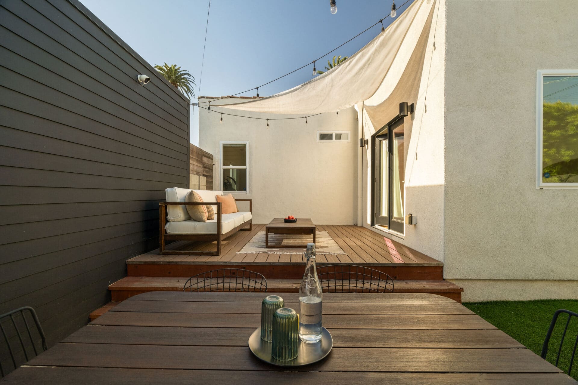 Two private bedrooms are tucked down the hallway, each with plenty of space and customized closets. The hallway bathroom enjoys a shower-over-tub for added convenience. Indulge in rest + relaxation in the roomy primary suite with its own ensuite bathroom and a picture window overlooking the verdant yard. The indoor-outdoor flow is abundant, with French doors that lead directly to the en suite patio. A sun shade ensures comfortable days lounging on the deck, while string lights set the tone in the evening.