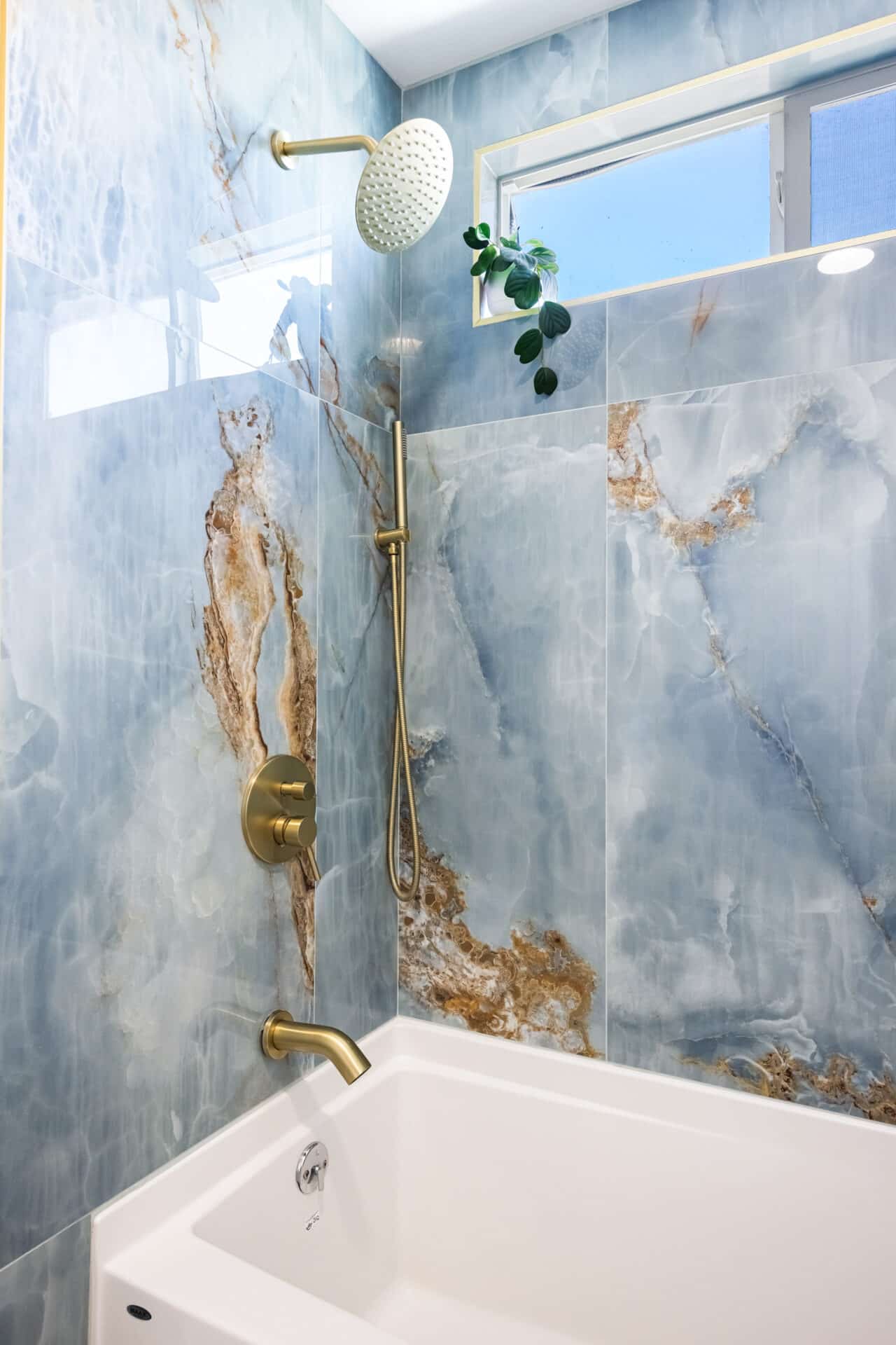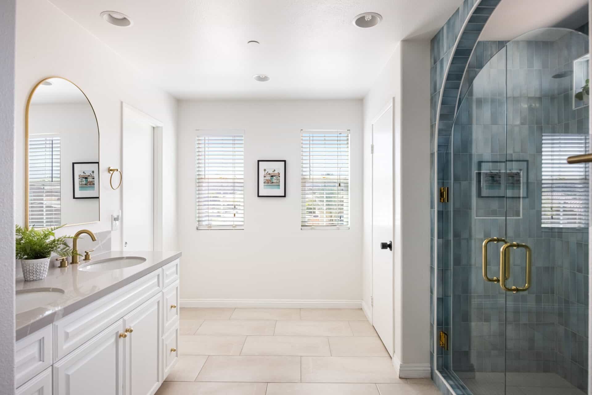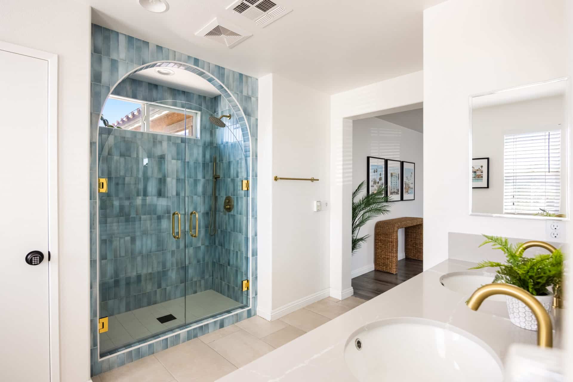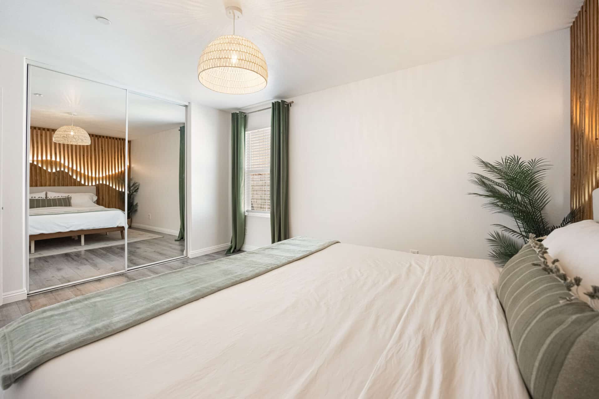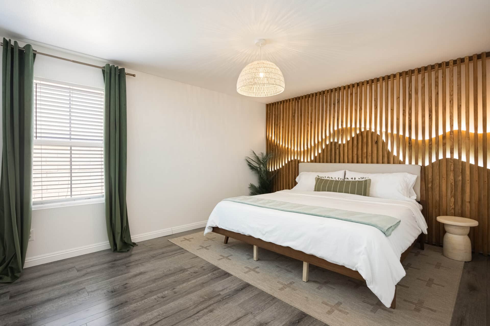 Down the hall, a second spacious bedroom features a striking custom backlit wood slat wall, designed in a soft, wave pattern that adds warmth. A full bath nearby boasts dual sinks with soapstone mist quartz countertops and a stunning glass-enclosed shower wrapped in porcelain tile.