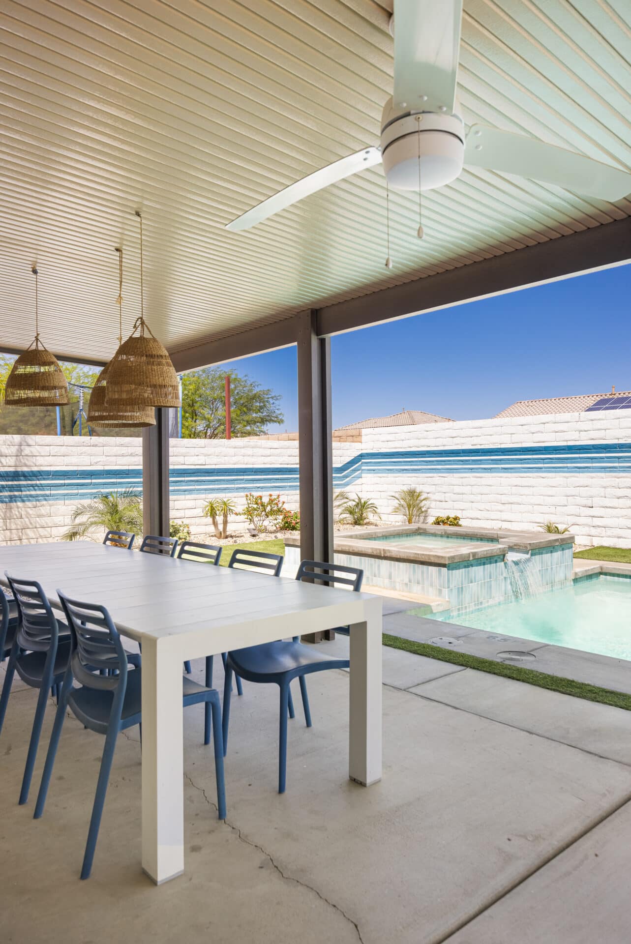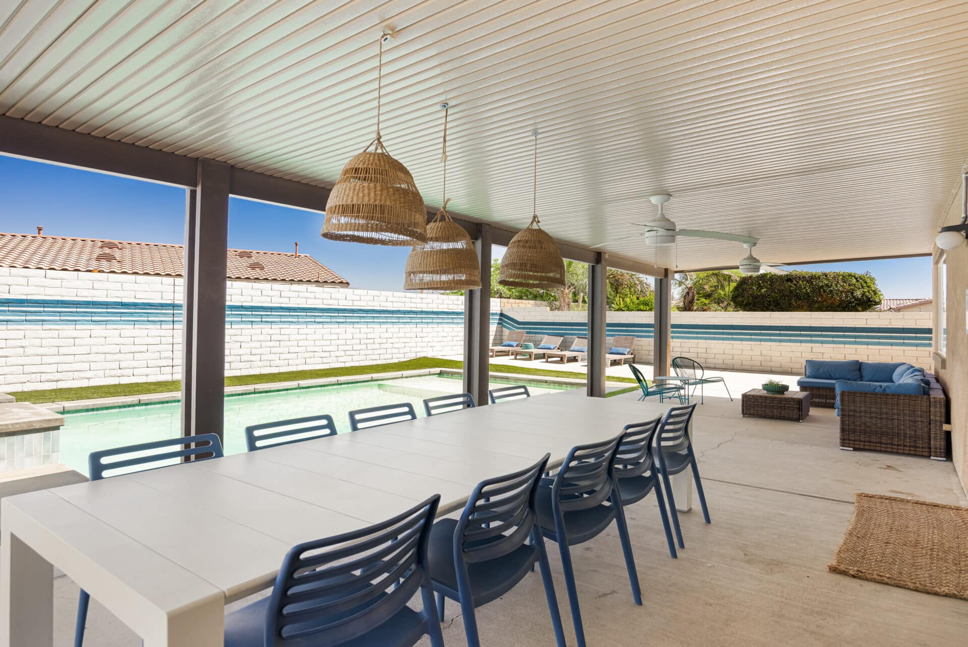 Out back, the private yard was made for entertaining anchored by a brand new pool with baja shelf, integrated spa, and a cascading waterfall. A large patio with dining for twelve beneath woven rattan pendants sets the scene for unforgettable al fresco meals, while a generous lounge area invites slow mornings or sunset cocktails.