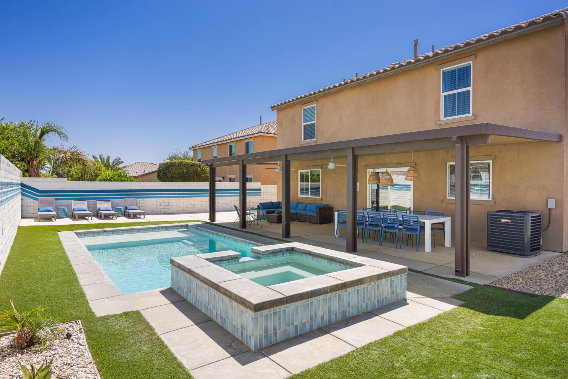 System upgrades include New HVAC, New Water Heater, New pool and spa, new smart technology pool equipment, new alumawood patio cover, and new irrigation system.