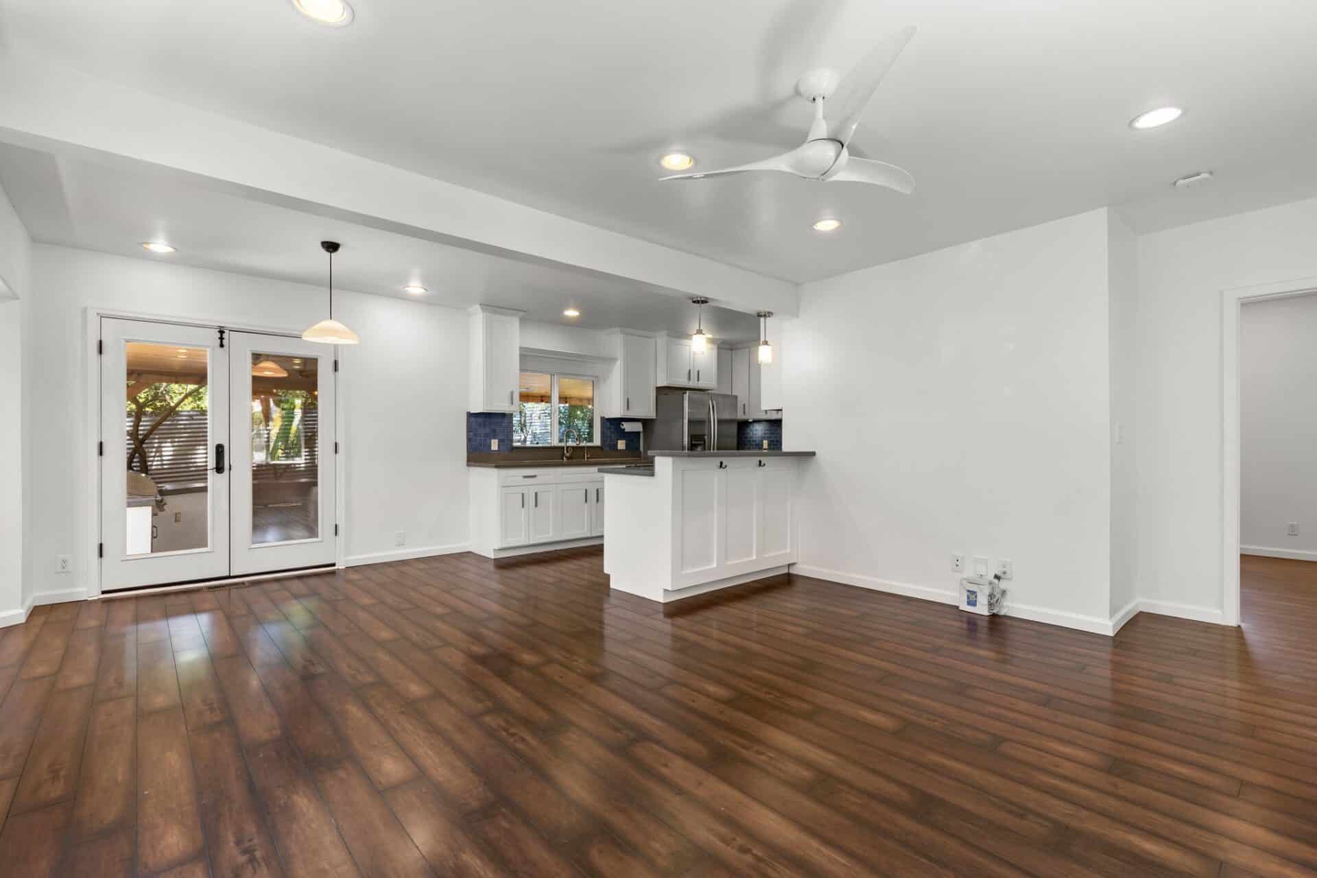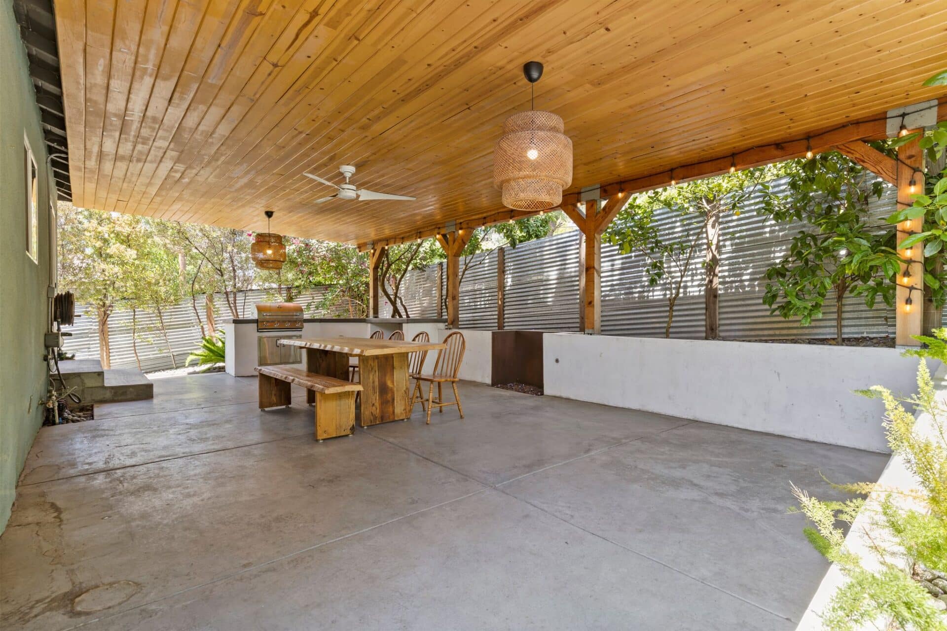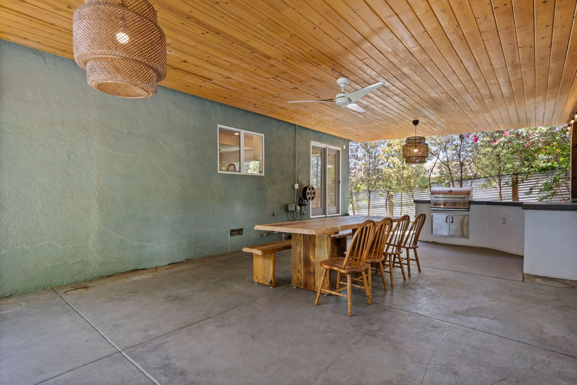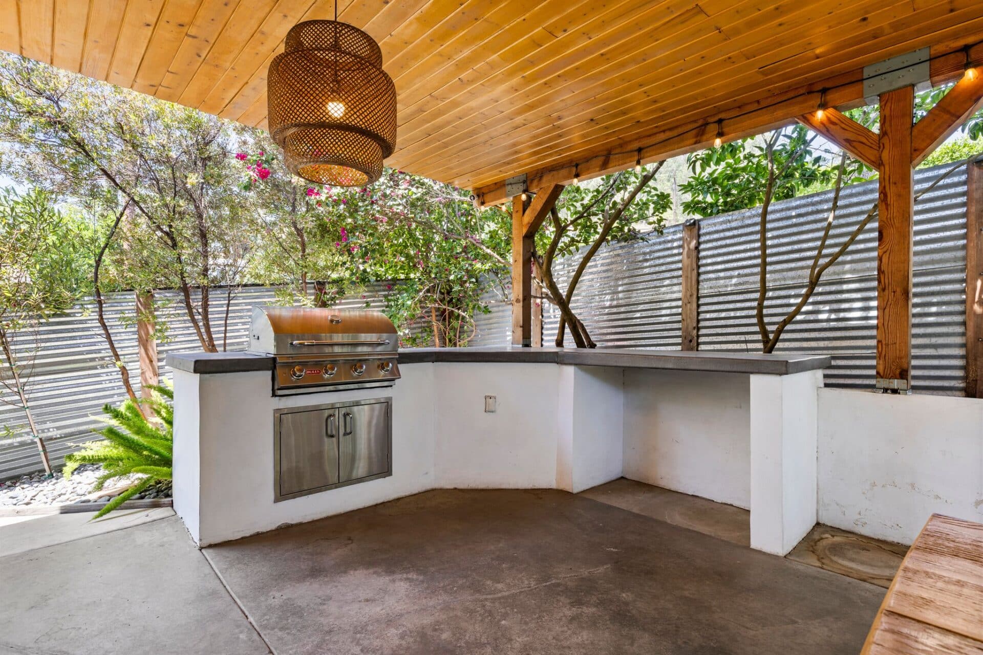 French doors lead you to a large covered patio with a gas fireplace, built-in grill, and oversized concrete countertop designed for relaxed evenings or lively gatherings under the stars.