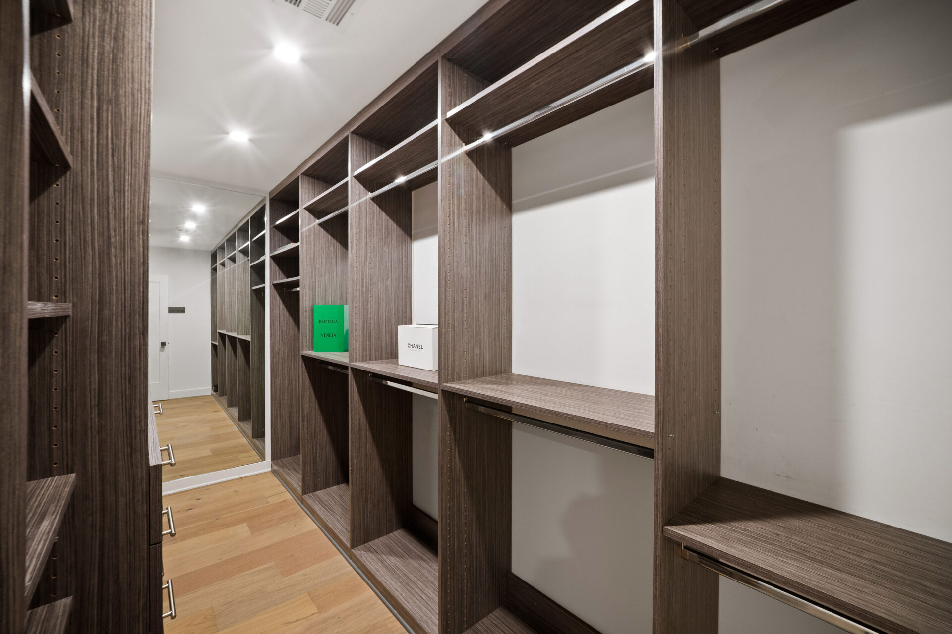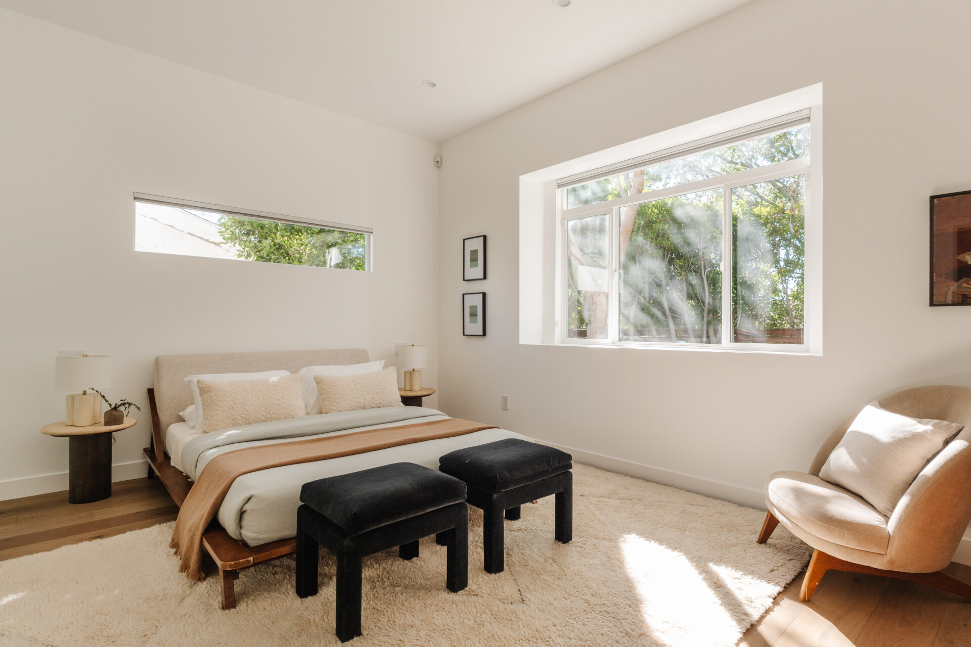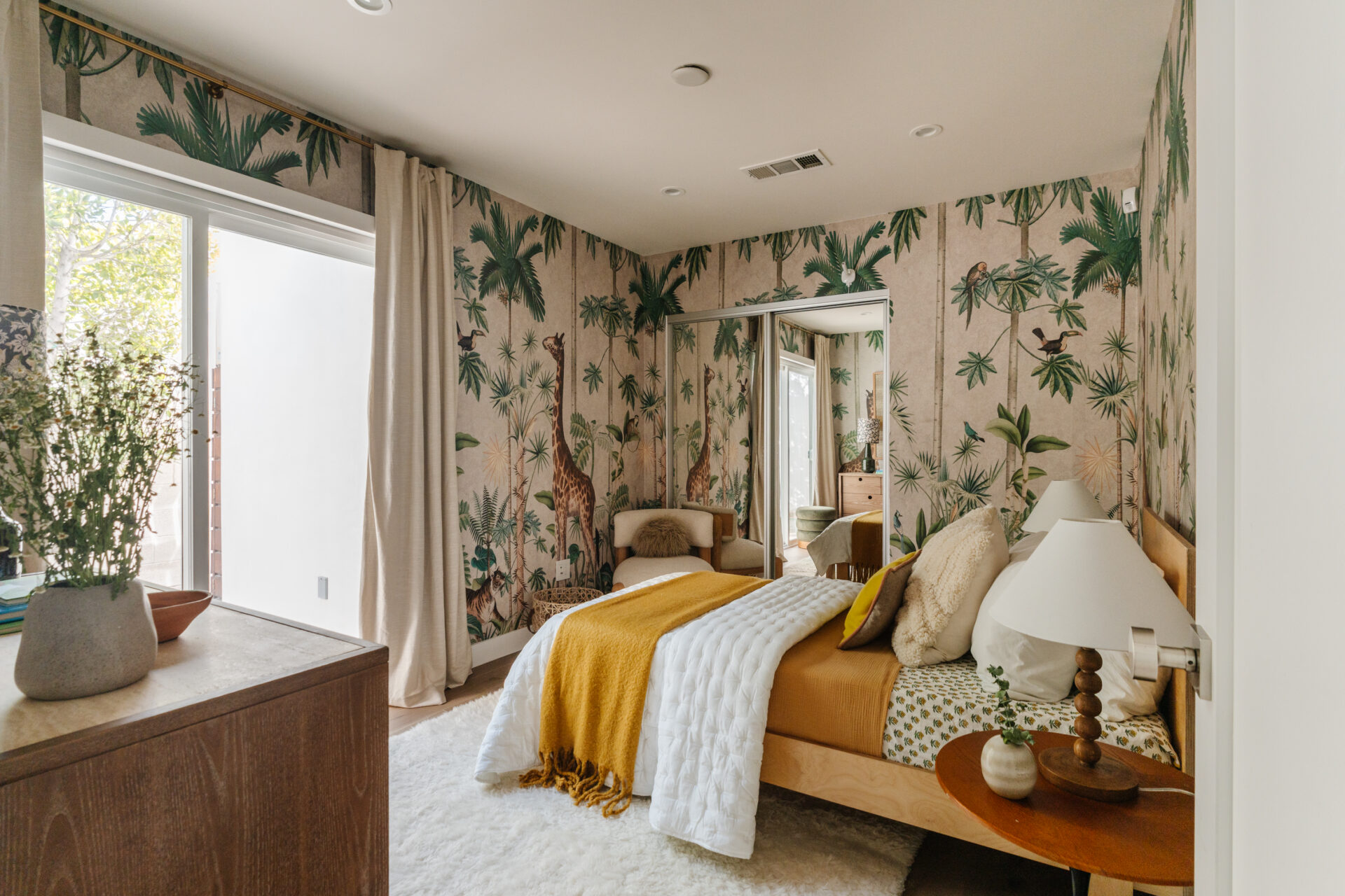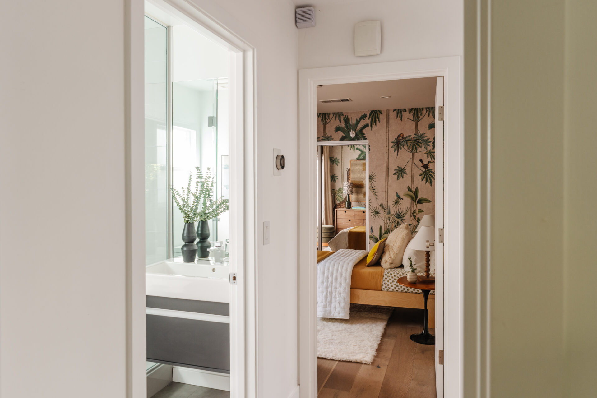 The primary suite is a proper retreat, complete with a large custom walk-in closet, a freestanding soaking tub, and a separate shower. A second bedroom also features its own ensuite bath, while the charming third bedroom is finished with designer wallpaper that gives it a personality all its own and a private patio making it perfect for guest’s enjoyment. Custom closets throughout offer ample storage to properly accommodate the modern lifestyle.