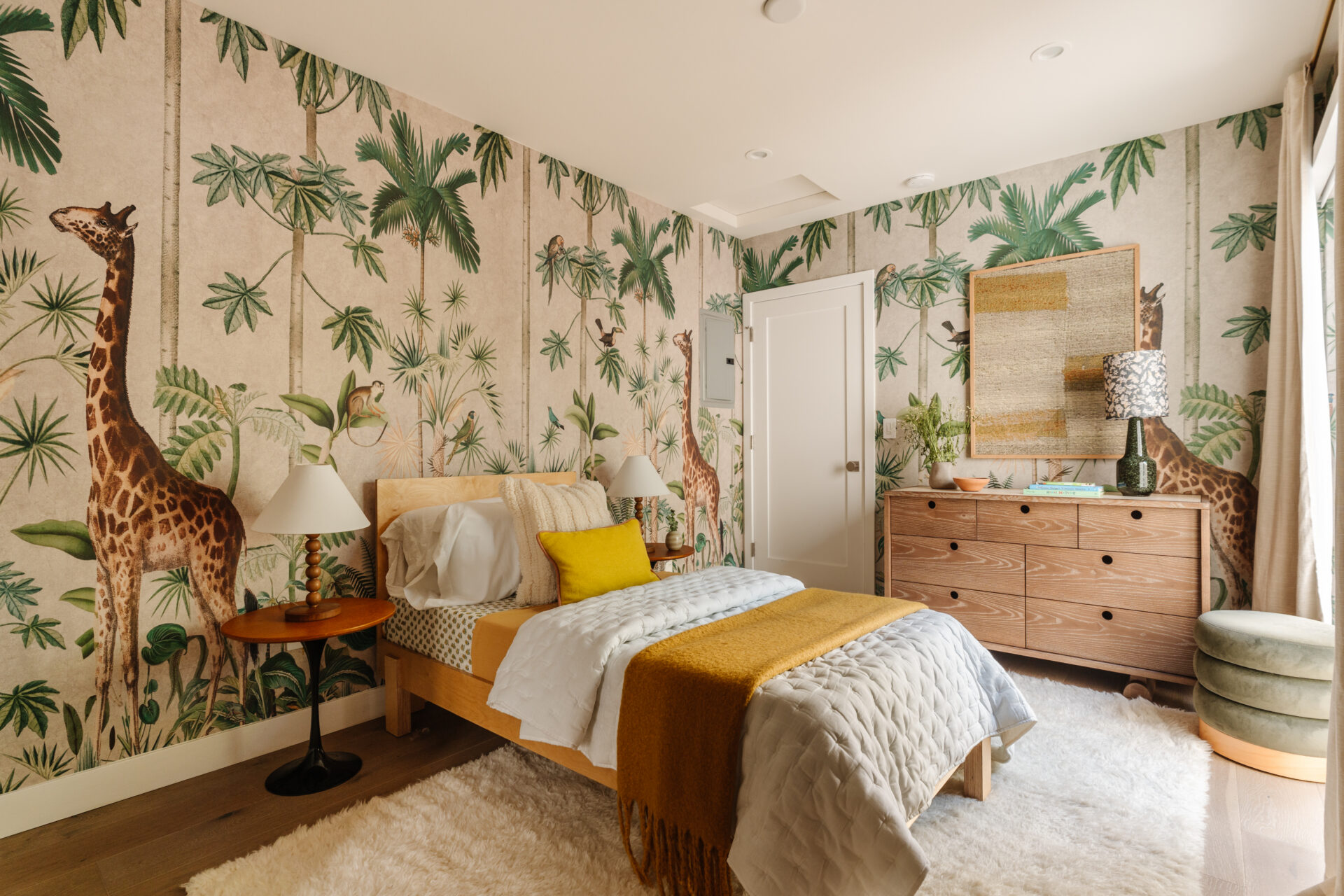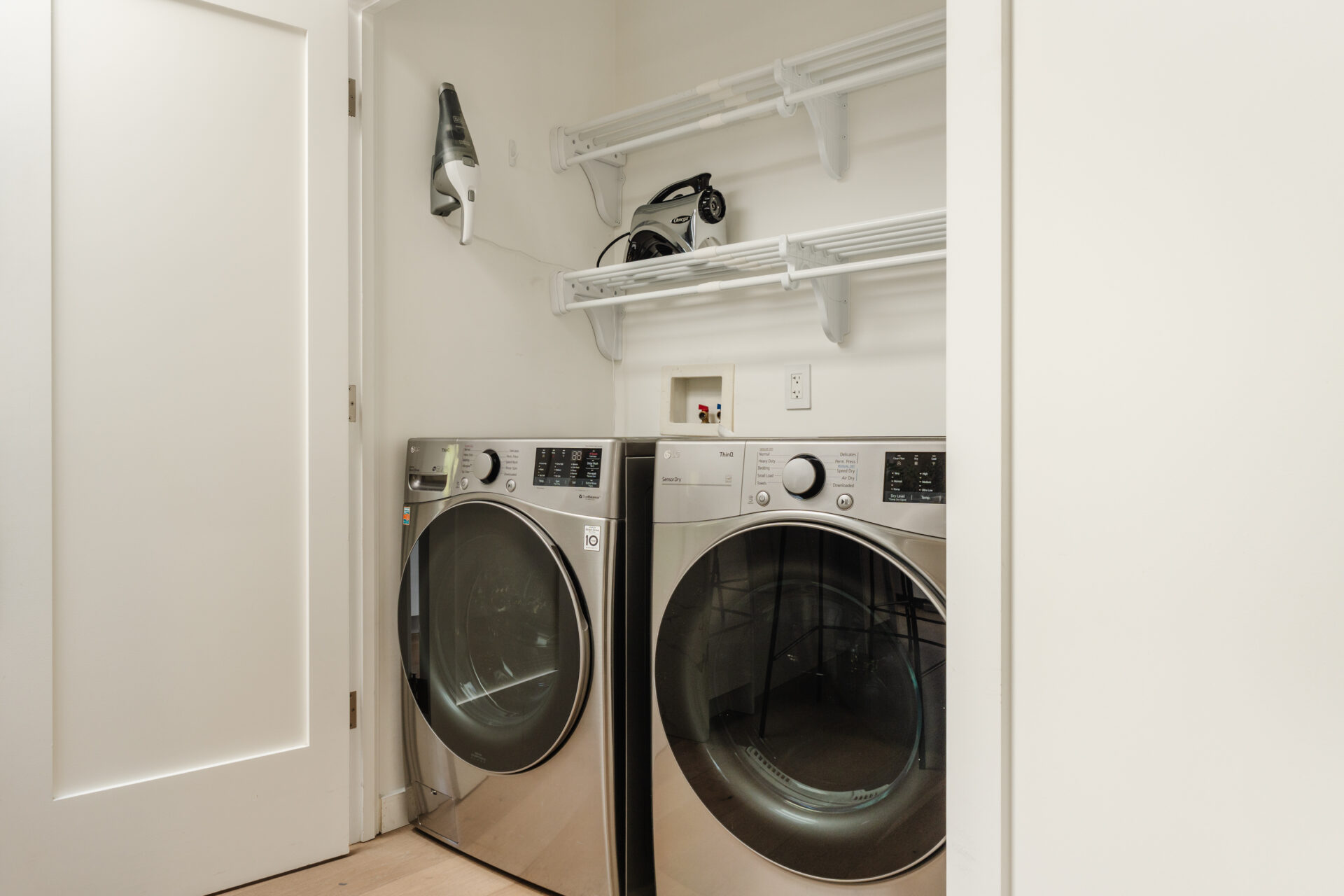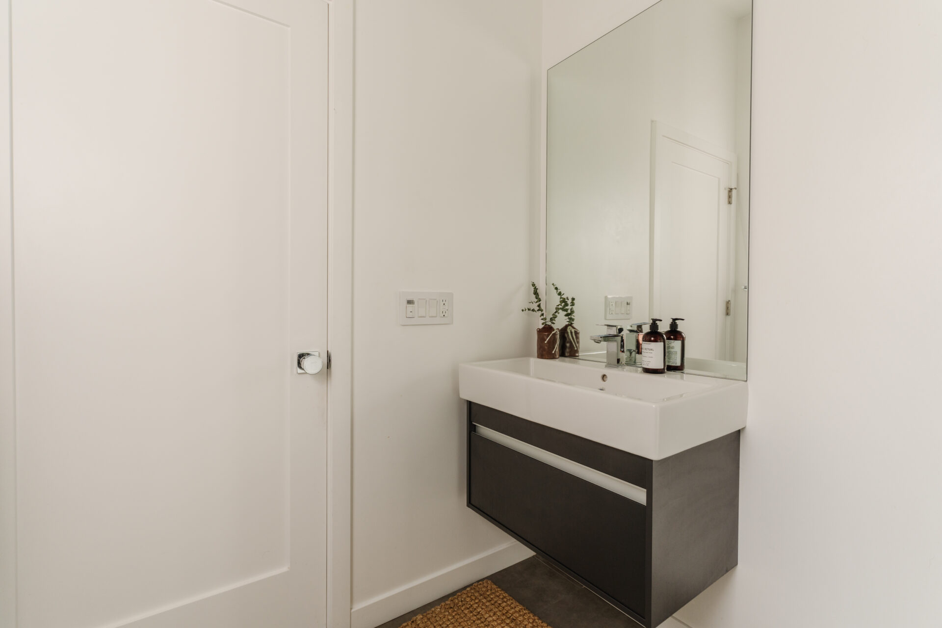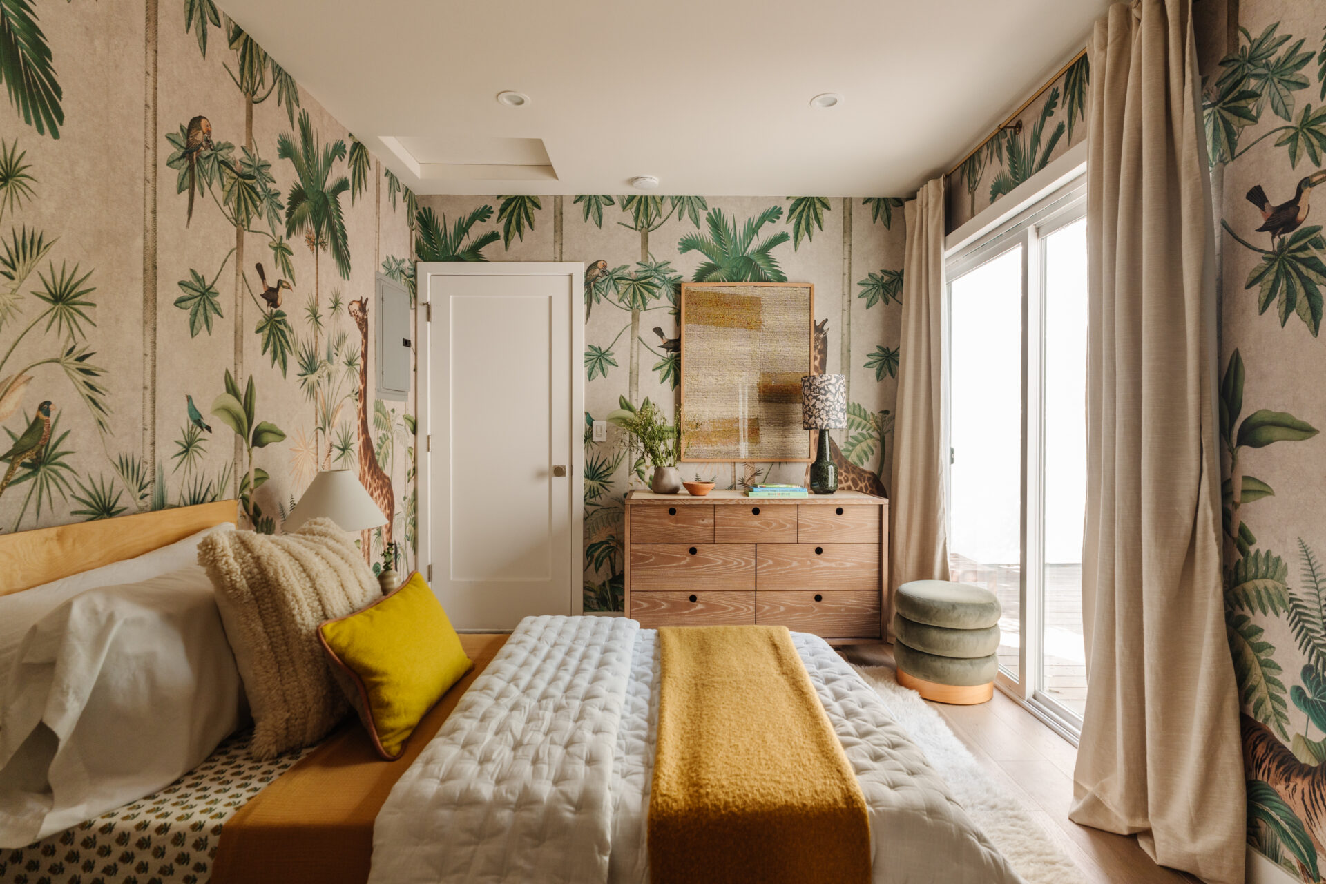 The primary suite is a proper retreat, complete with a large custom walk-in closet, a freestanding soaking tub, and a separate shower. A second bedroom also features its own ensuite bath, while the charming third bedroom is finished with designer wallpaper that gives it a personality all its own and a private patio making it perfect for guest’s enjoyment. Custom closets throughout offer ample storage to properly accommodate the modern lifestyle.