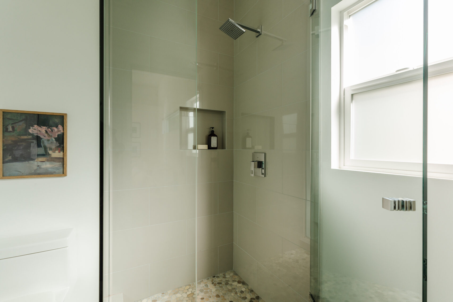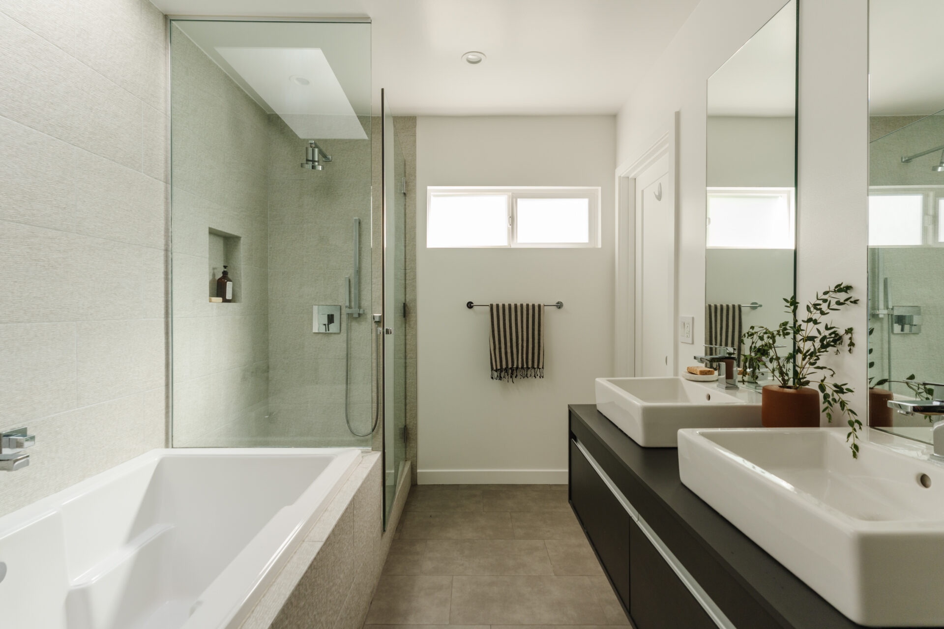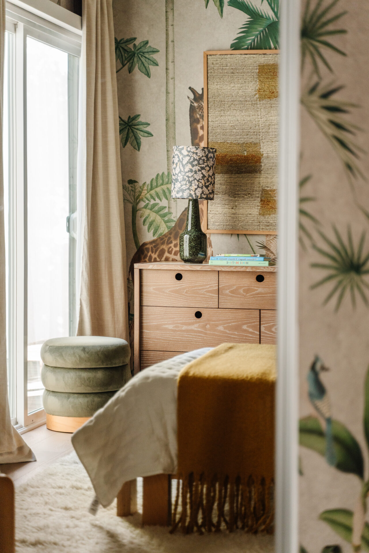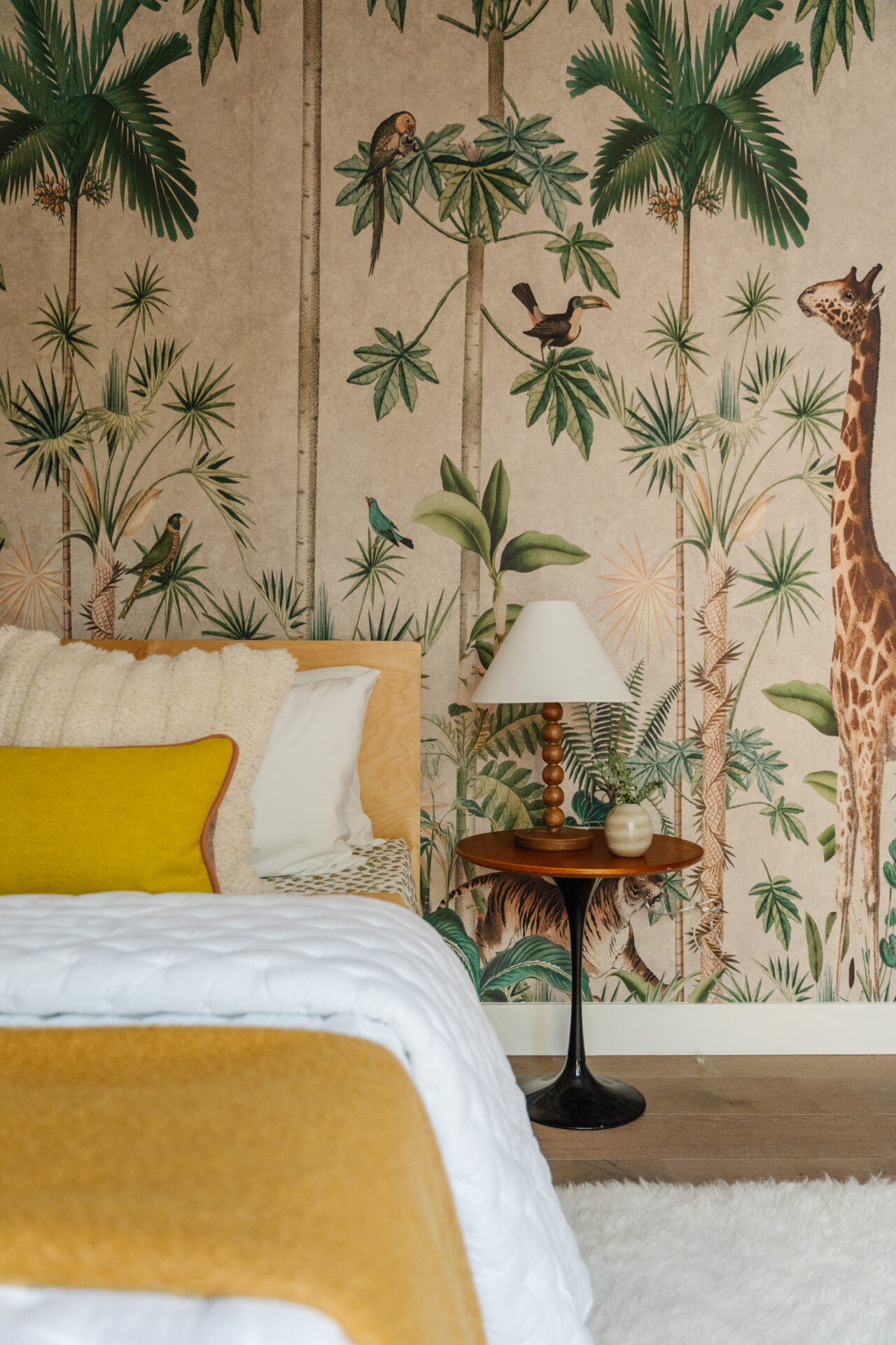 The primary suite is a proper retreat, complete with a large custom walk-in closet, a freestanding soaking tub, and a separate shower. A second bedroom also features its own ensuite bath, while the charming third bedroom is finished with designer wallpaper that gives it a personality all its own and a private patio making it perfect for guest’s enjoyment. Custom closets throughout offer ample storage to properly accommodate the modern lifestyle.