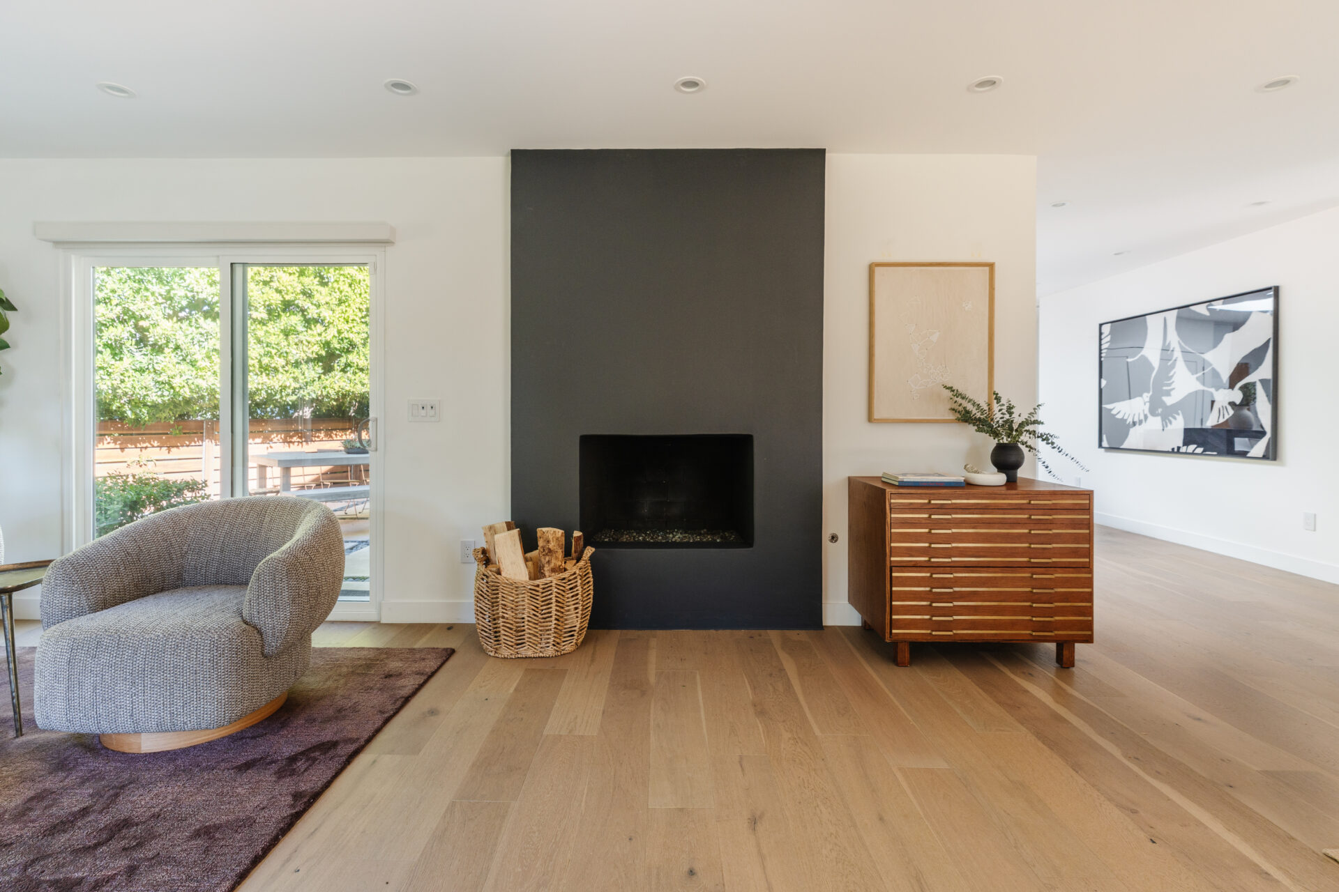 Step inside and the home opens up with the clean lines and considered proportions of true architectural design. A fireplace in the entry makes an immediate statement, setting a warm and dramatic tone from the moment you cross the threshold.