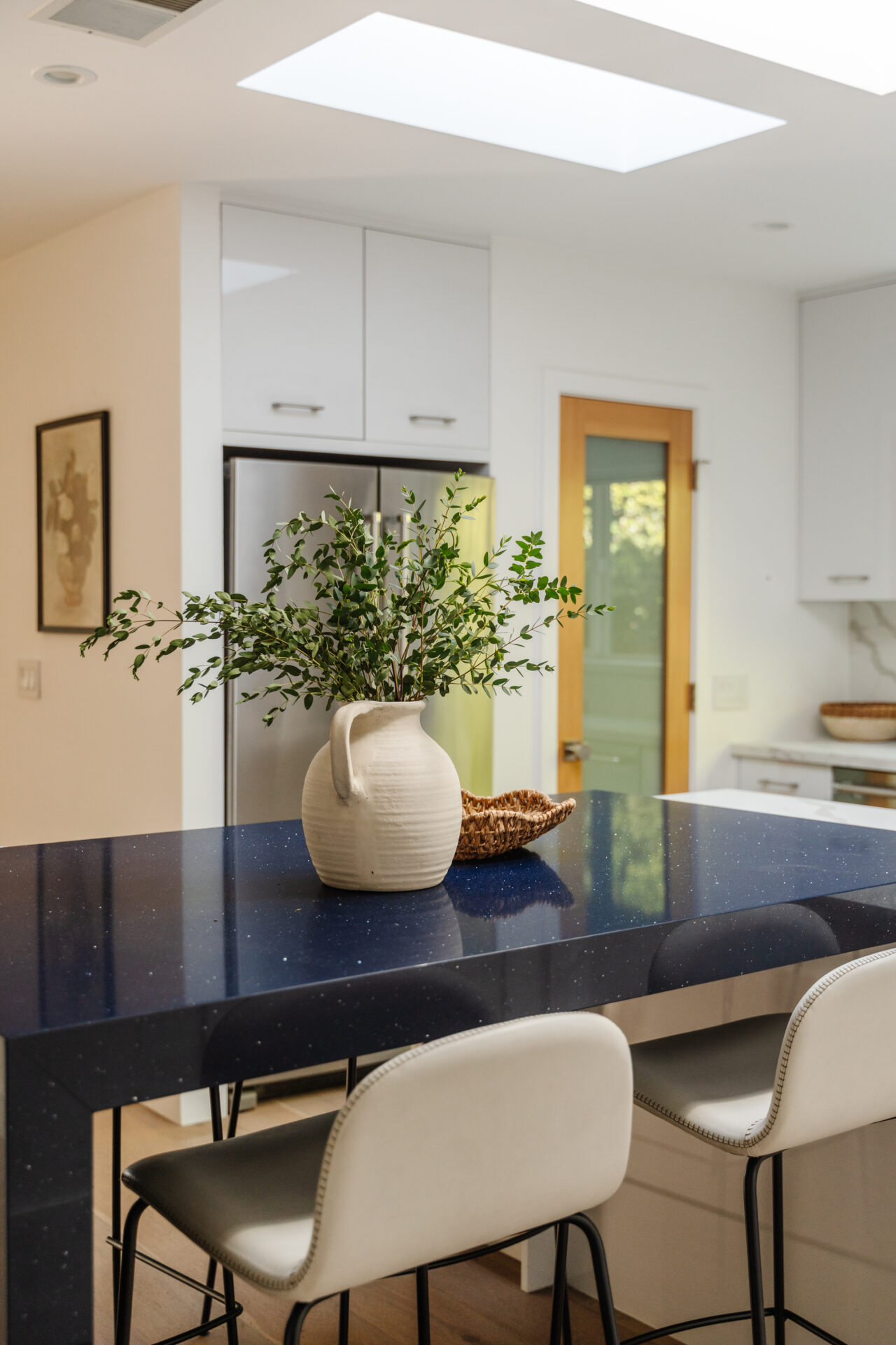 Freshly installed engineered hardwood floors run throughout, lending warmth and continuity to every room. The renovated kitchen is a standout — outfitted with stainless steel appliances, stone countertops, and an oversized eat-in island that invites casual dining and easy conversation. A full formal dining room means the home is equally equipped for the dinner party as it is for the weeknight meal.