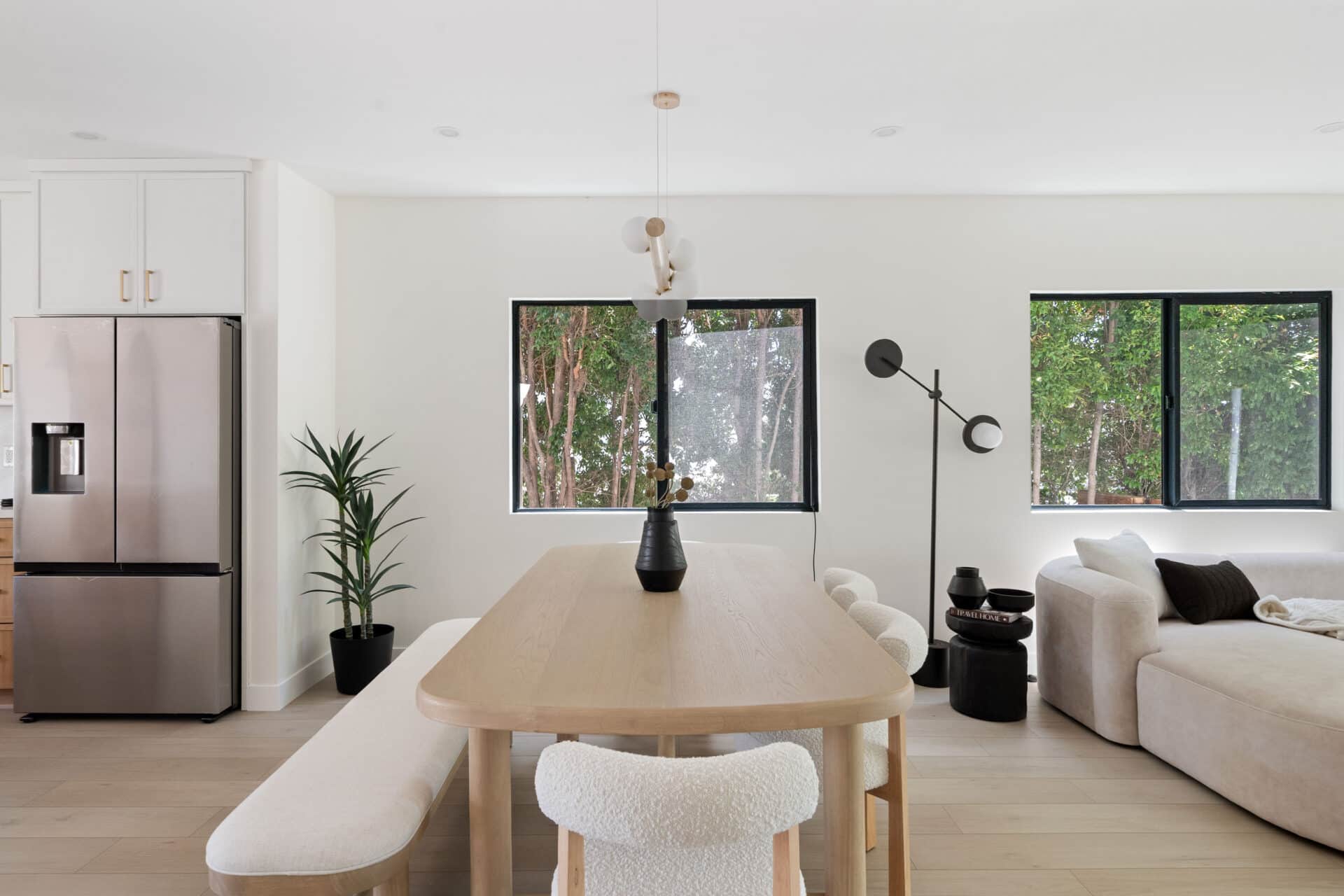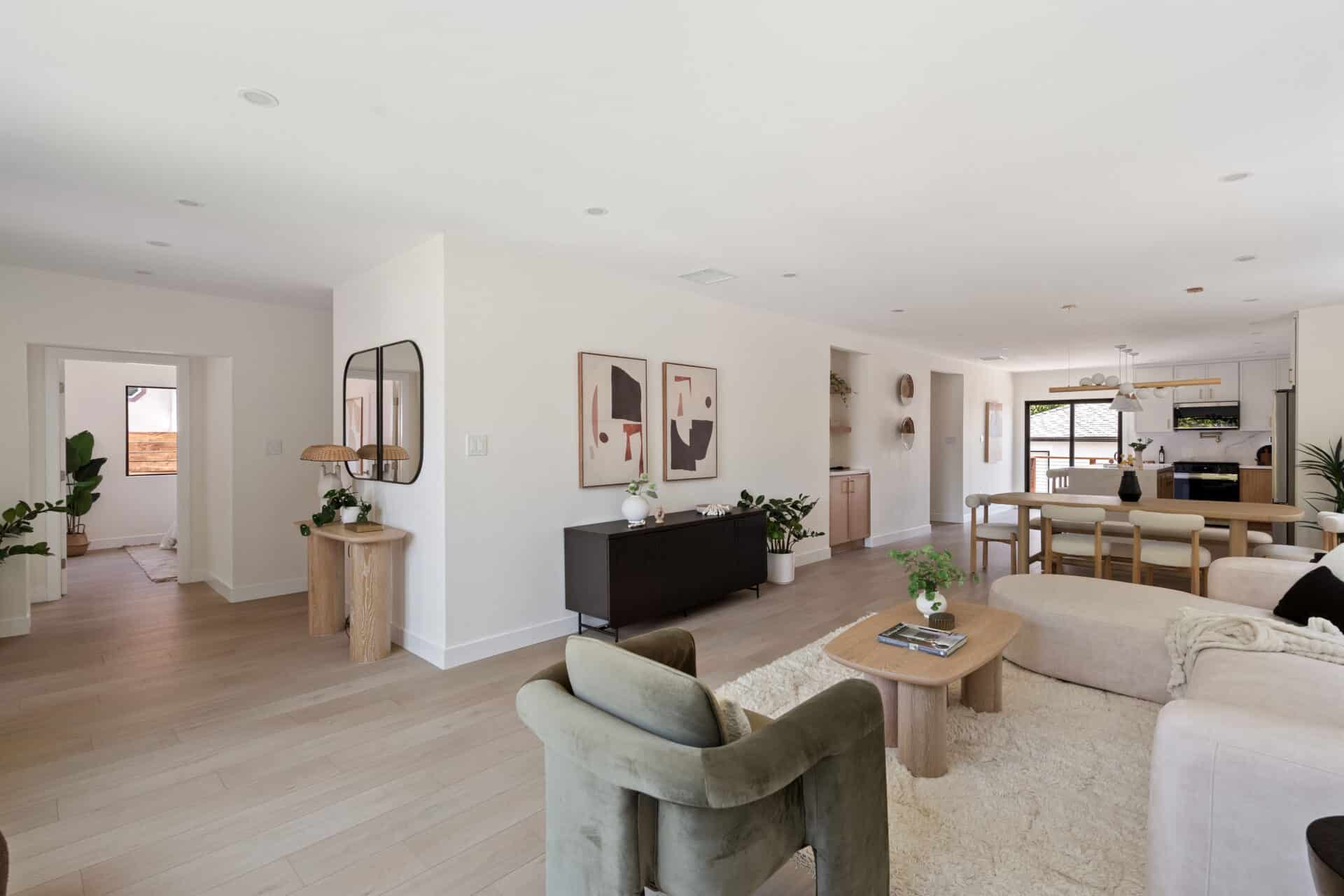 The heart of this home, the custom-designed kitchen, is a place where culinary artistry meets every day ease. Imagine effortless entertaining around the large center island with built-in storage. Custom white oak cabinetry with exquisite wood-finished interiors and soft-close drawers provides both beauty and function, while complimented by soft, feminine quartz countertops. High quality stainless appliances, including a brand-new gas range, oven, and a refrigerator/freezer with water/ice, make every meal a masterpiece. Adjacent to this culinary haven, the dining room isn’t an afterthought, but a statement, featuring custom white oak built-in cabinets + shelves perfect for displaying your favorite pieces. And the bathrooms? They are pure sanctuaries. Each is a spa-like escape with new wood vanities, quartz countertops, modern fixtures, and exhaust fans with built-in WiFi/Bluetooth speakers. You’ll love the sophisticated tile flooring and the dramatic impact of the floor-to-ceiling tiled accent walls.