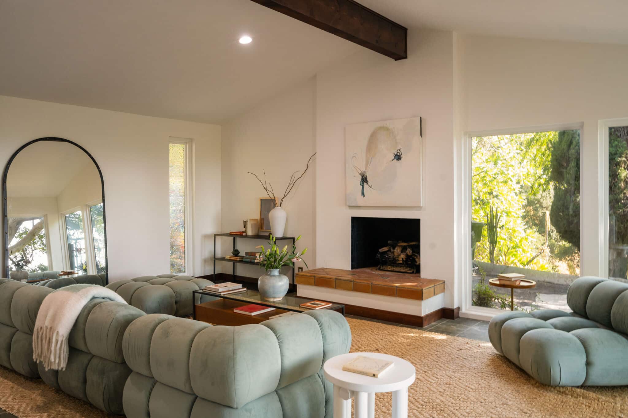 The vaulted living room ceiling, striking fireplace, and expansive windows draw in natural light and lush views, creating a seamless indoor-outdoor flow that invites you to slow down and settle in.