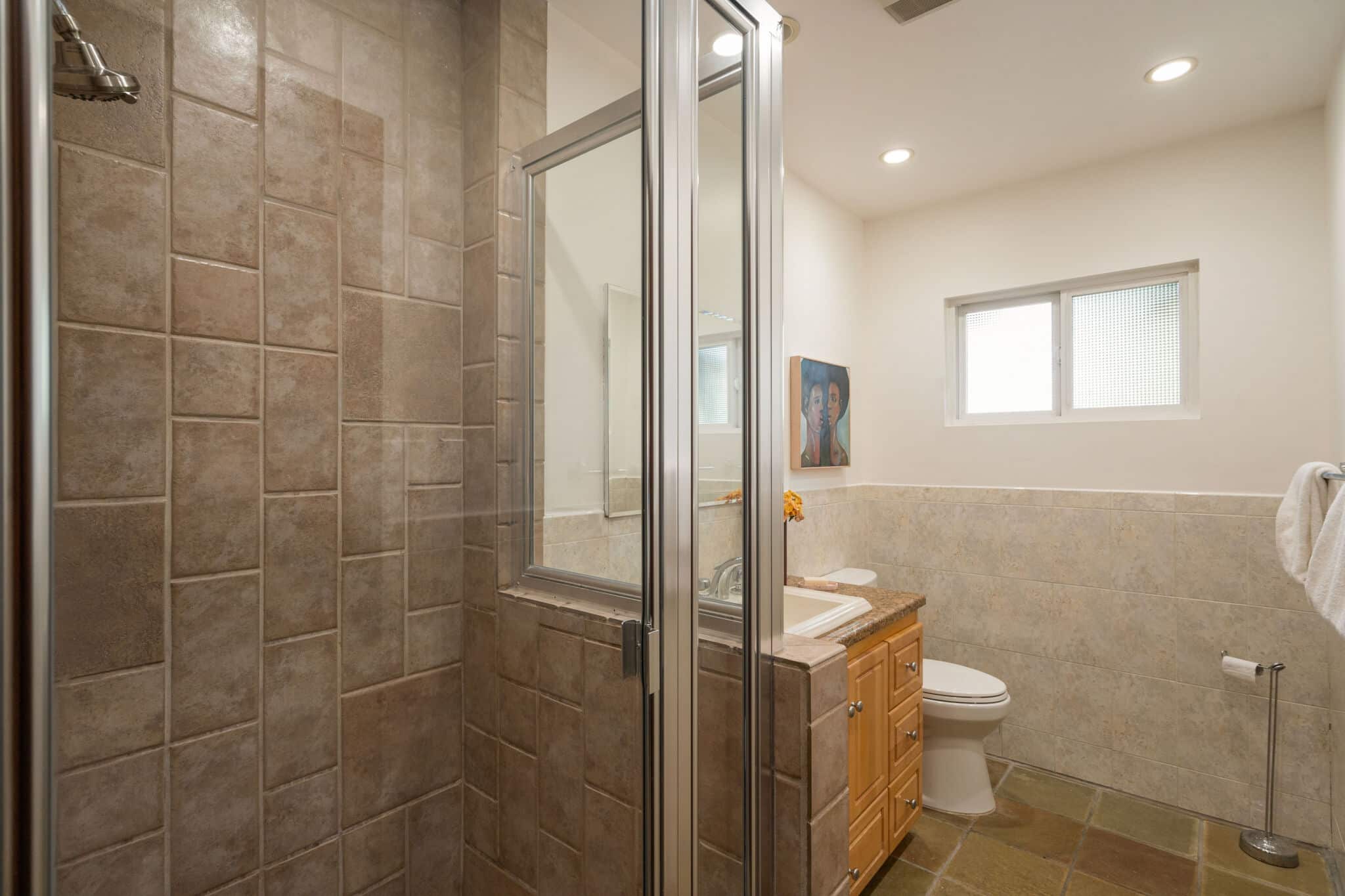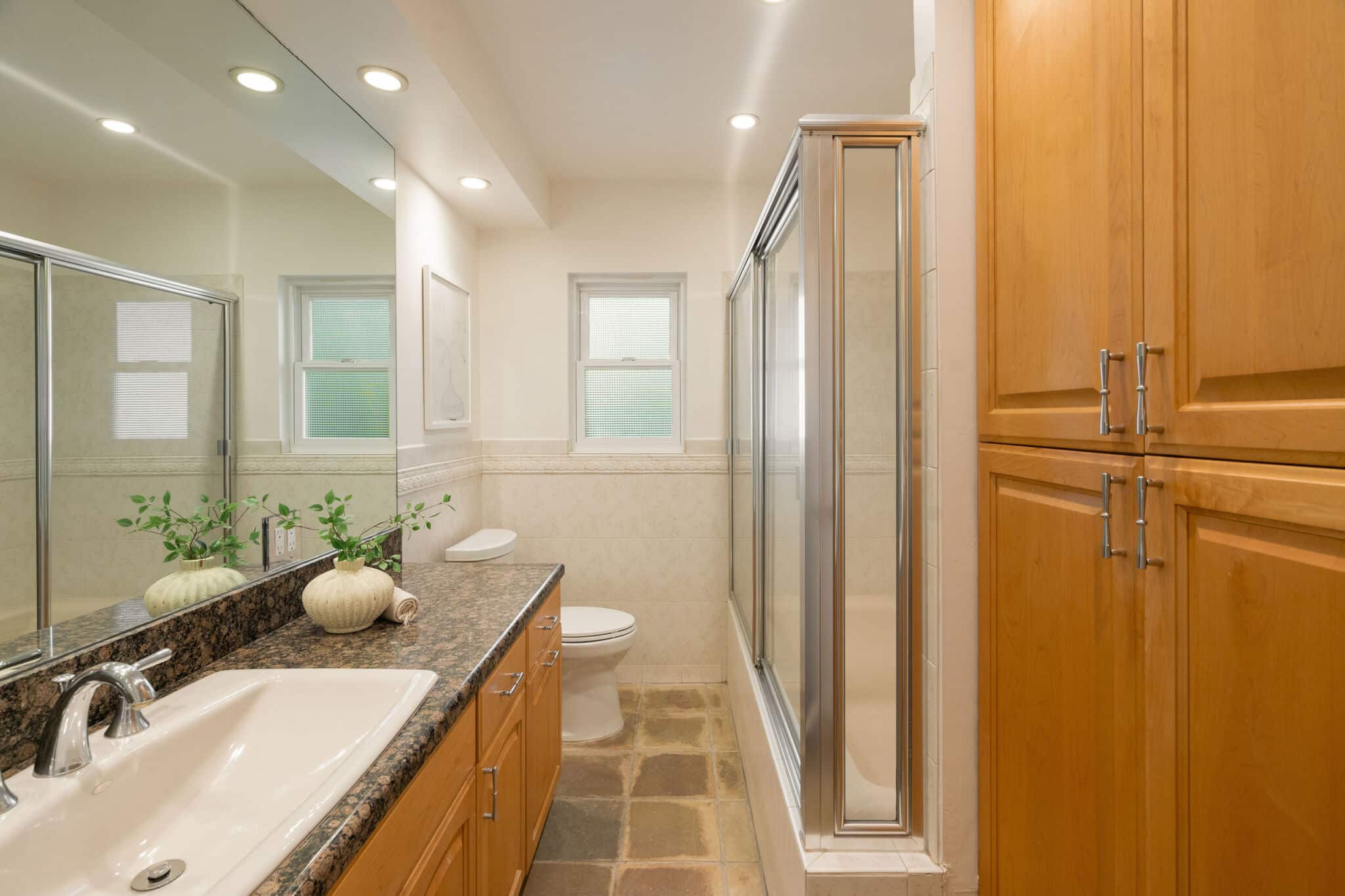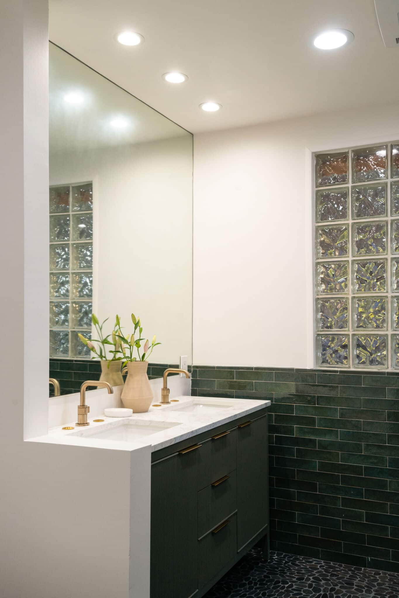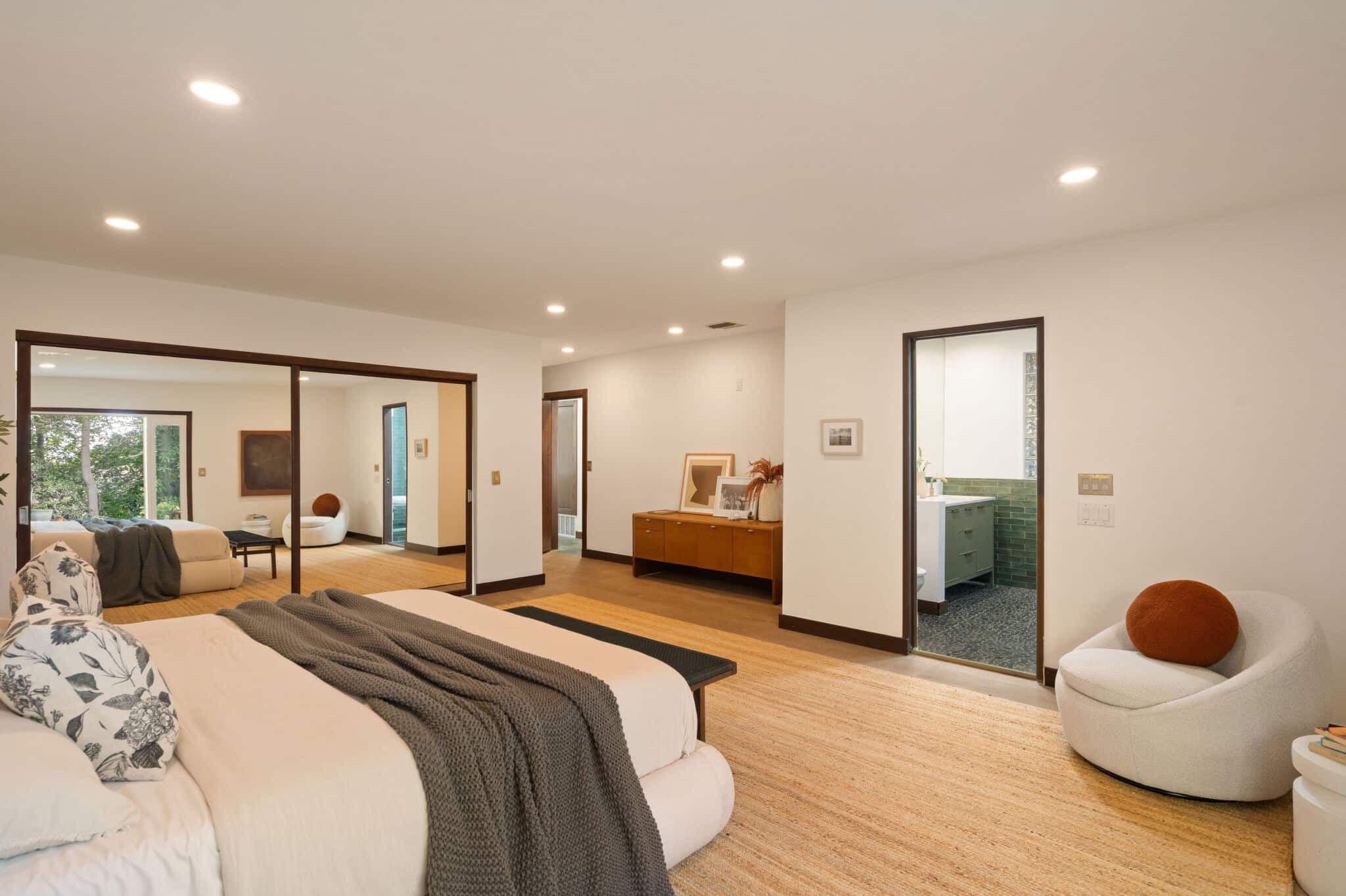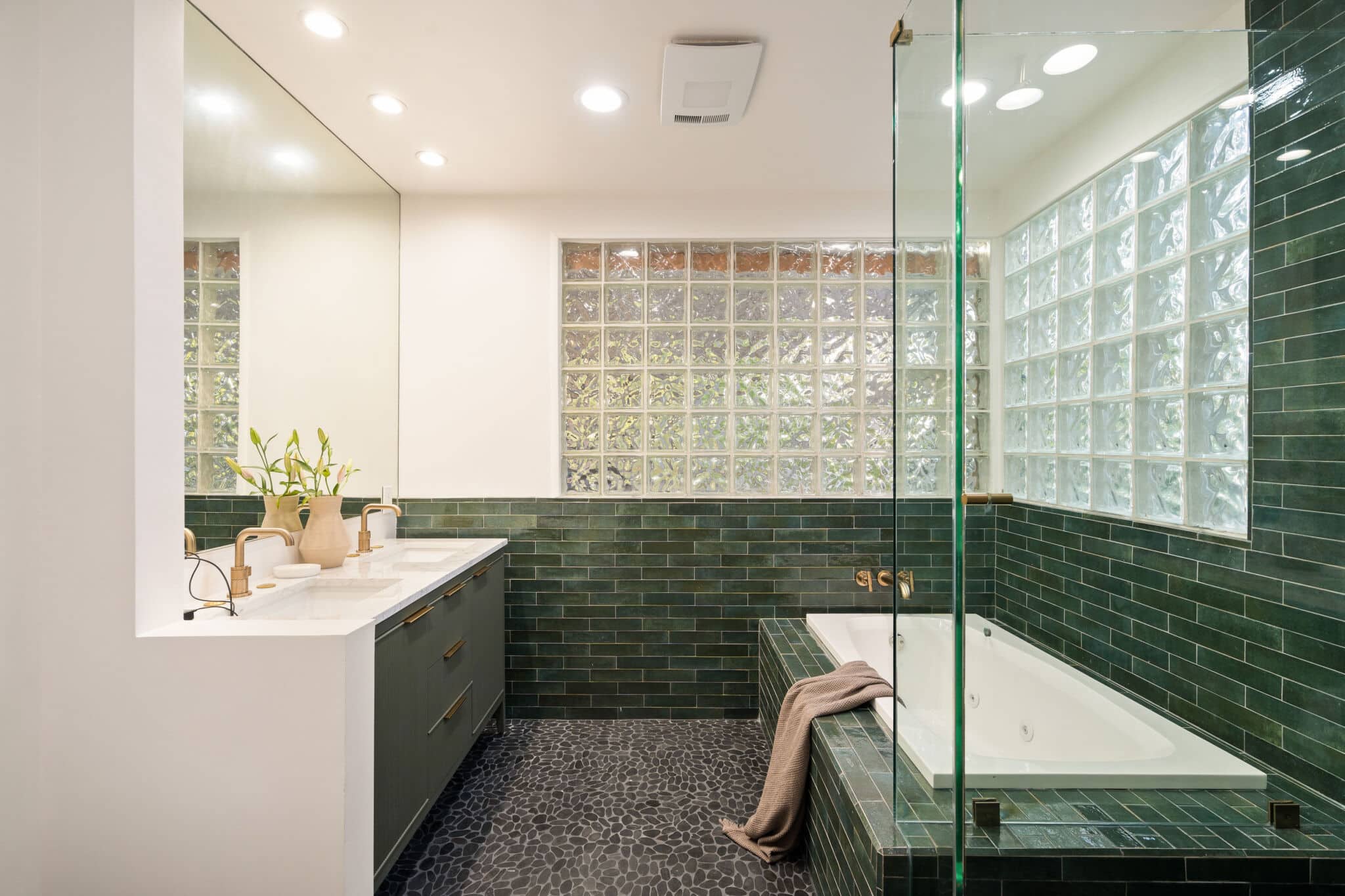 The oversized primary suite is a true escape, featuring a beautifully renovated en-suite bath that nods to its mid-century roots. A dramatic block glass wall adds architectural texture, while the large walk-in shower and separate soaking tub offer a spa-like experience.