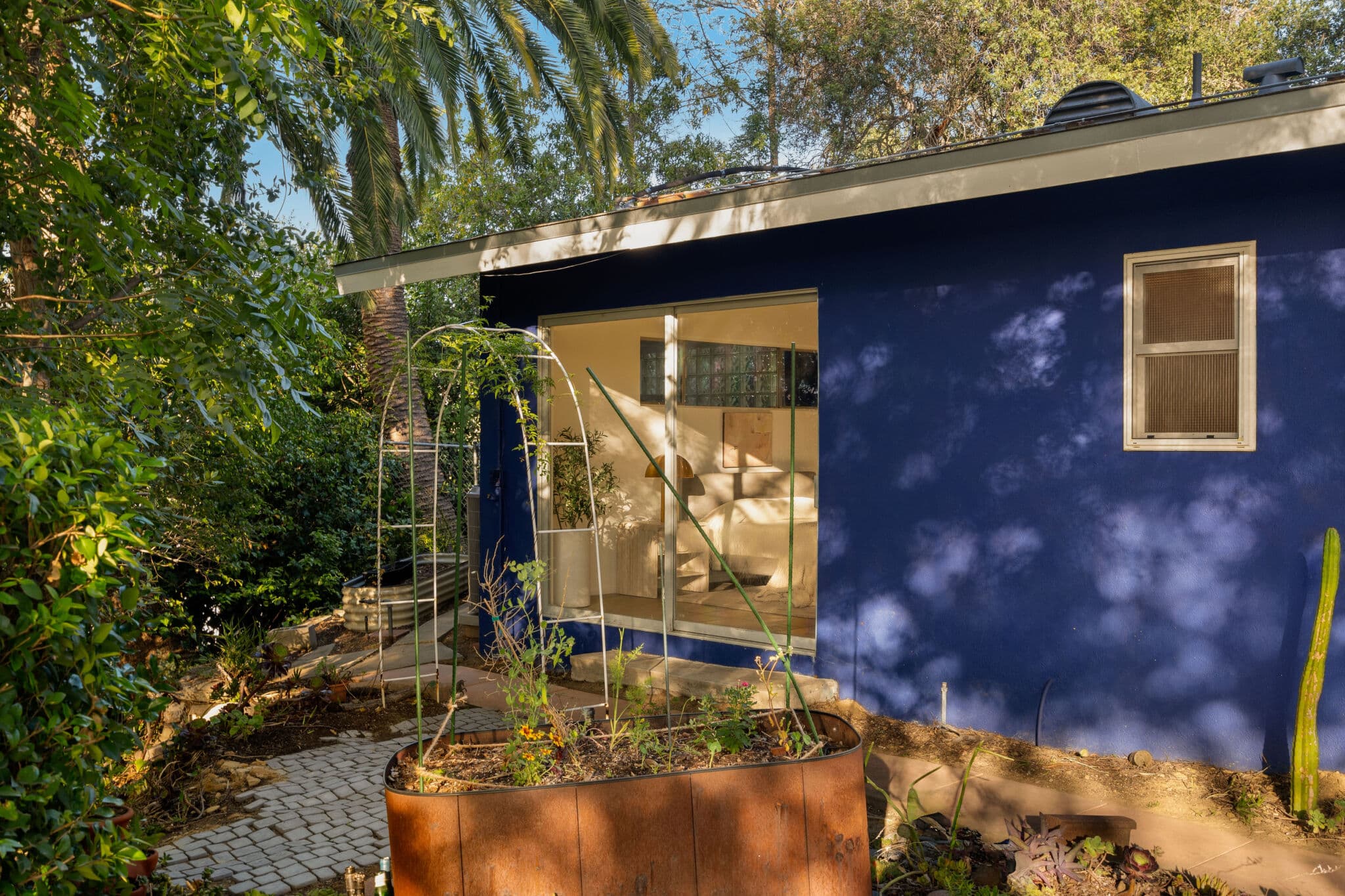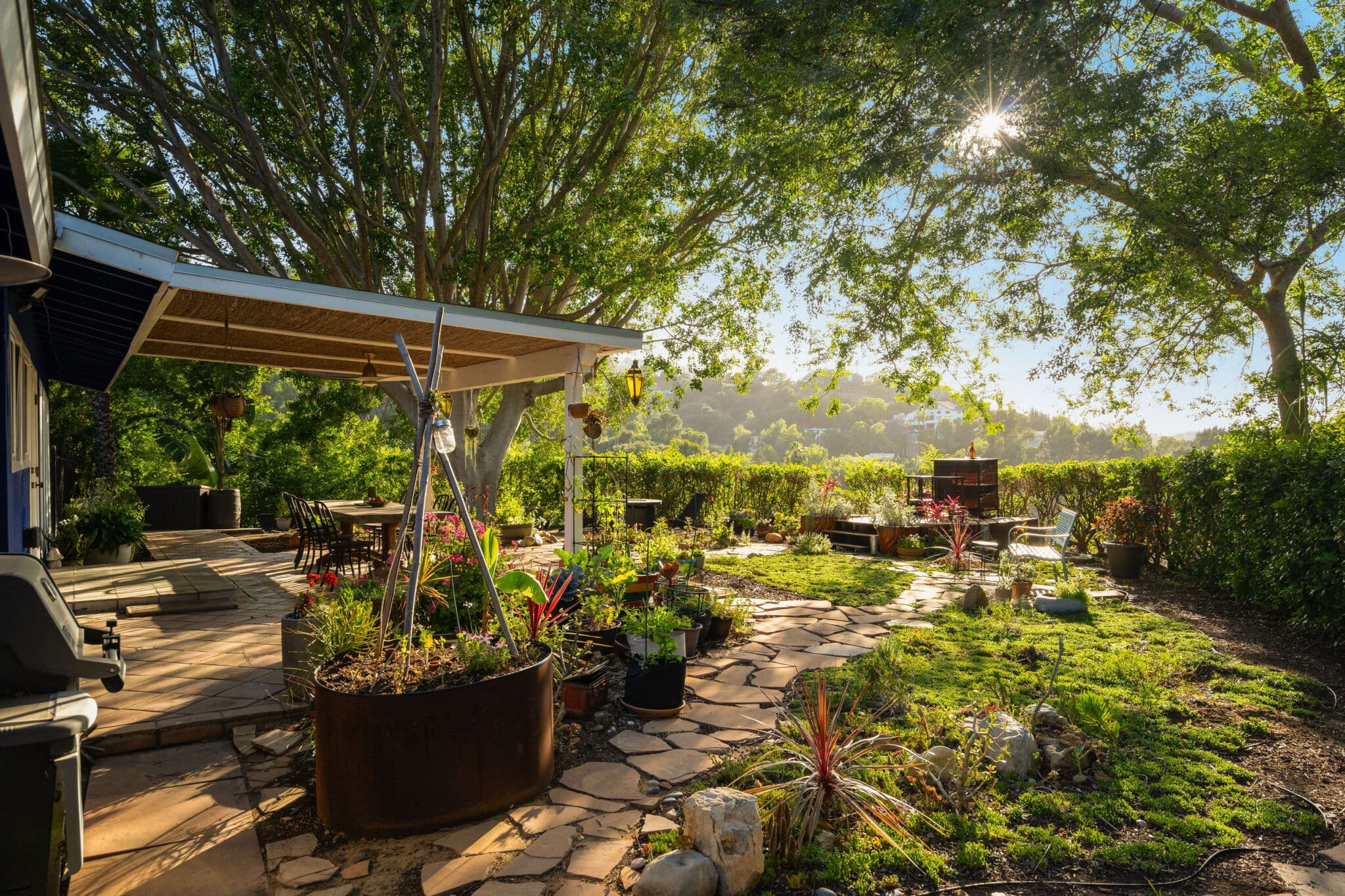 Outdoors, it gets even more special: a sprawling yard with a dedicated firepit area, a platform currently used as a tiki bar (wired for the use of a hot tub if you prefer), and even a catio—a custom enclosure perfect for your feline friends. Towering trees and canyon breezes surround you, making it feel like a peaceful mountain retreat, yet you’re just moments from city essentials.