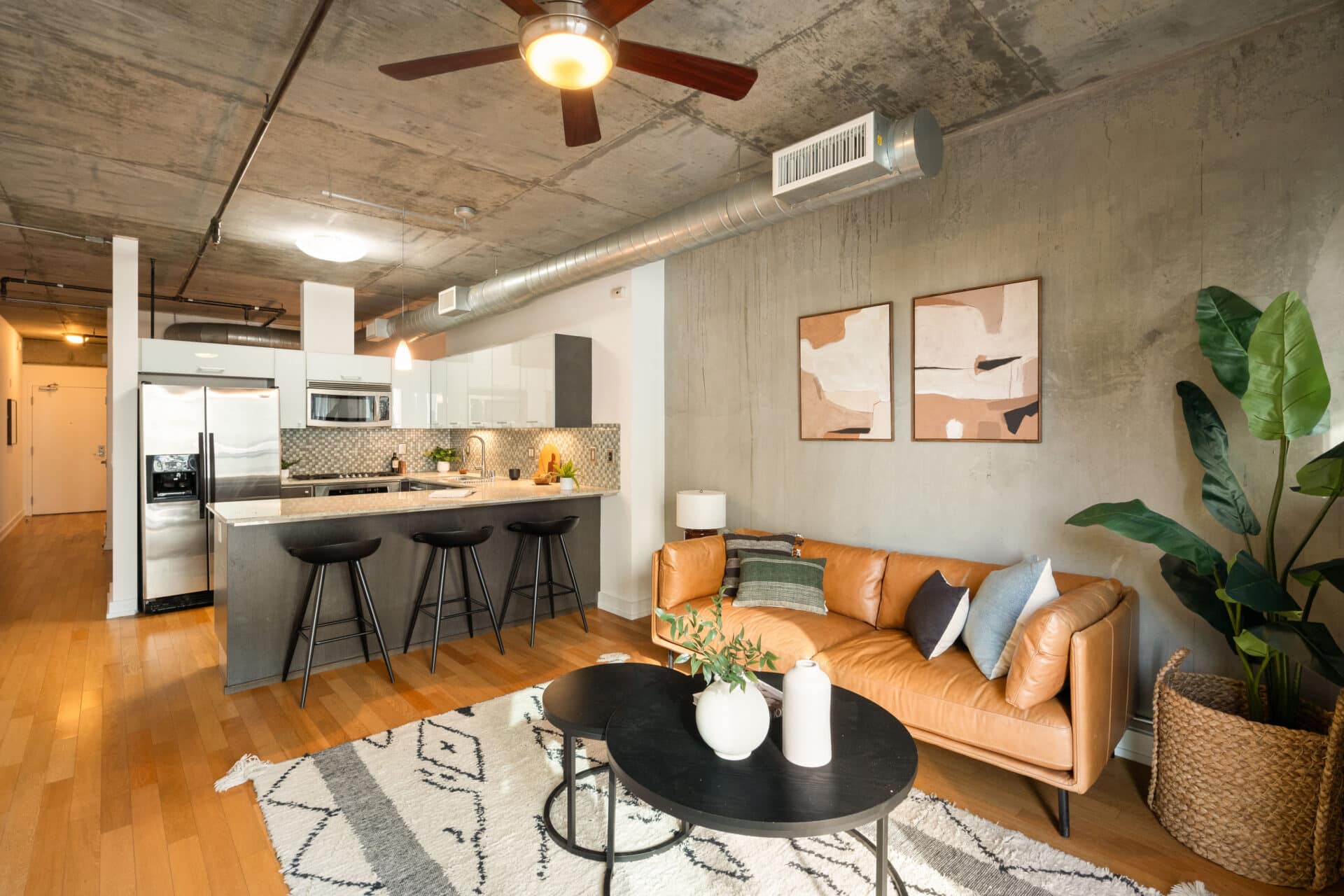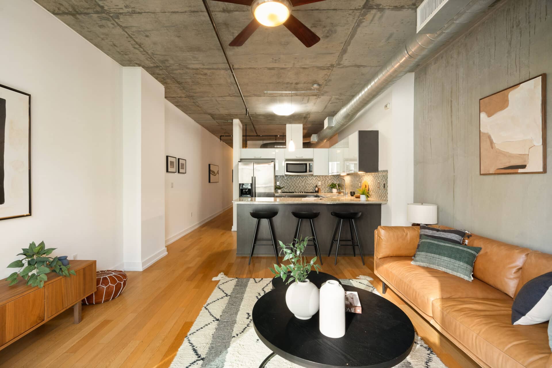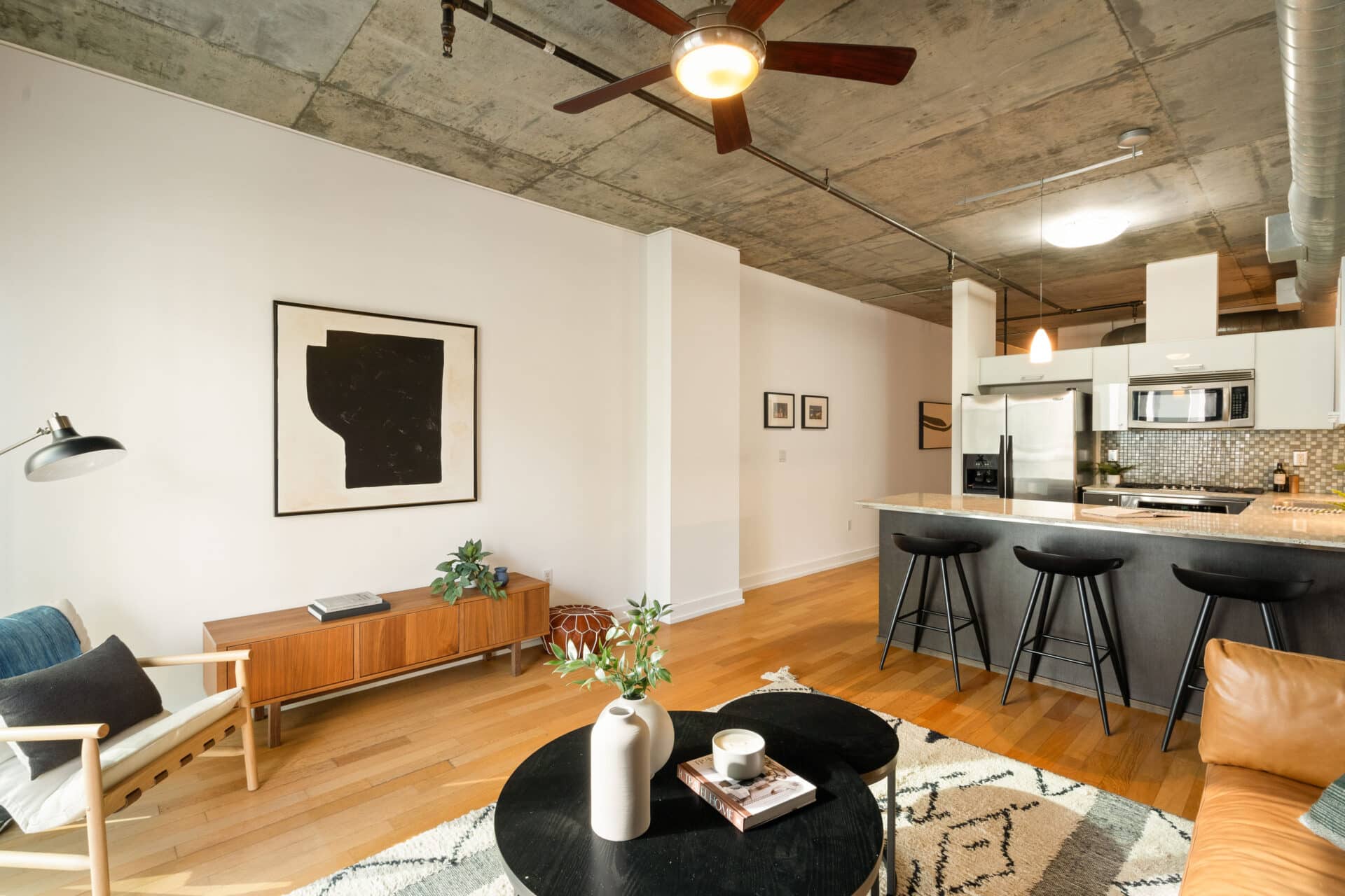 High ceilings and expansive windows flood the loft with natural light, creating an airy and inviting atmosphere.