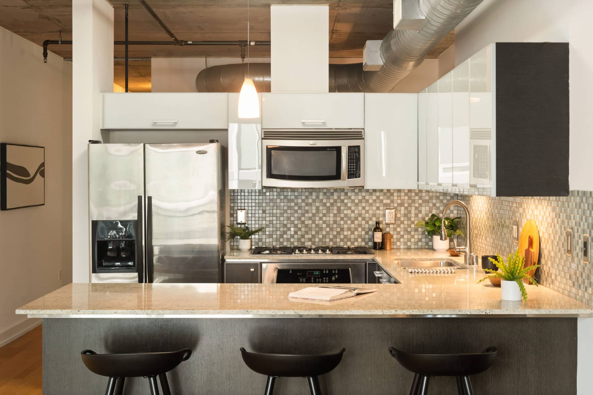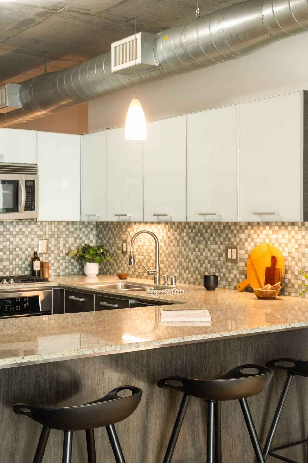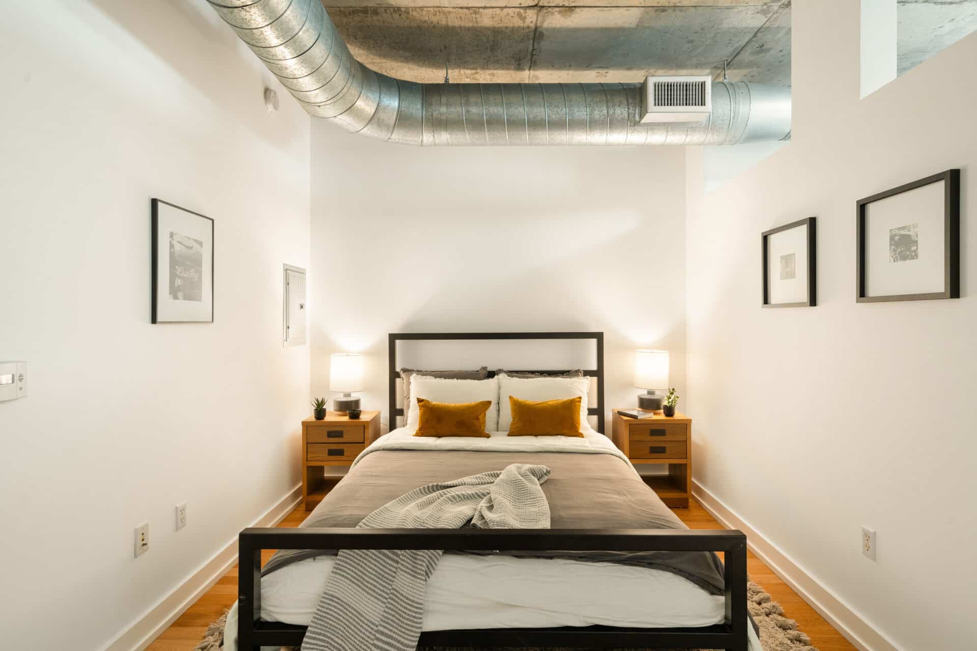 High ceilings and expansive windows flood the loft with natural light, creating an airy and inviting atmosphere.
