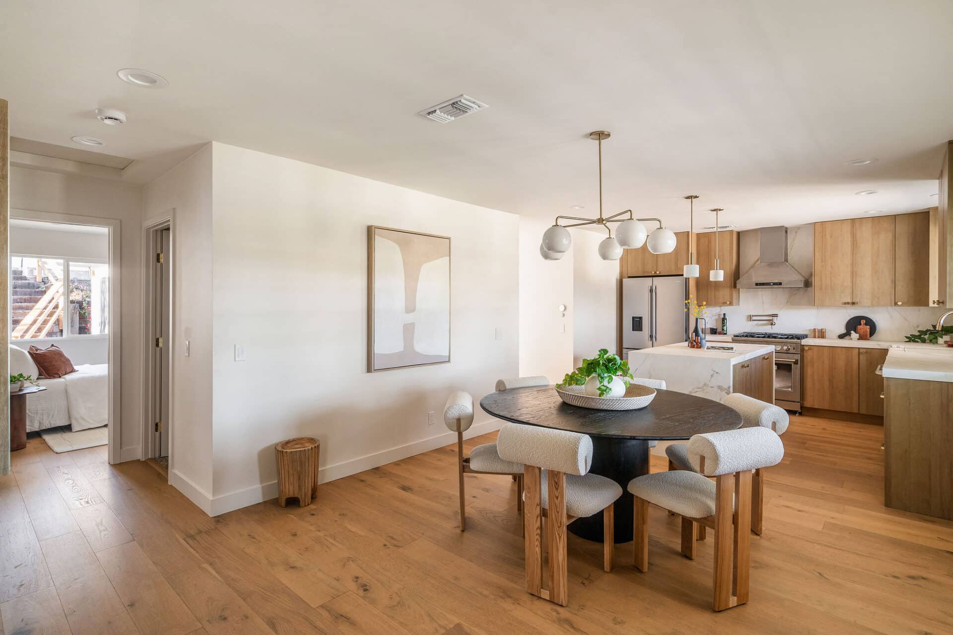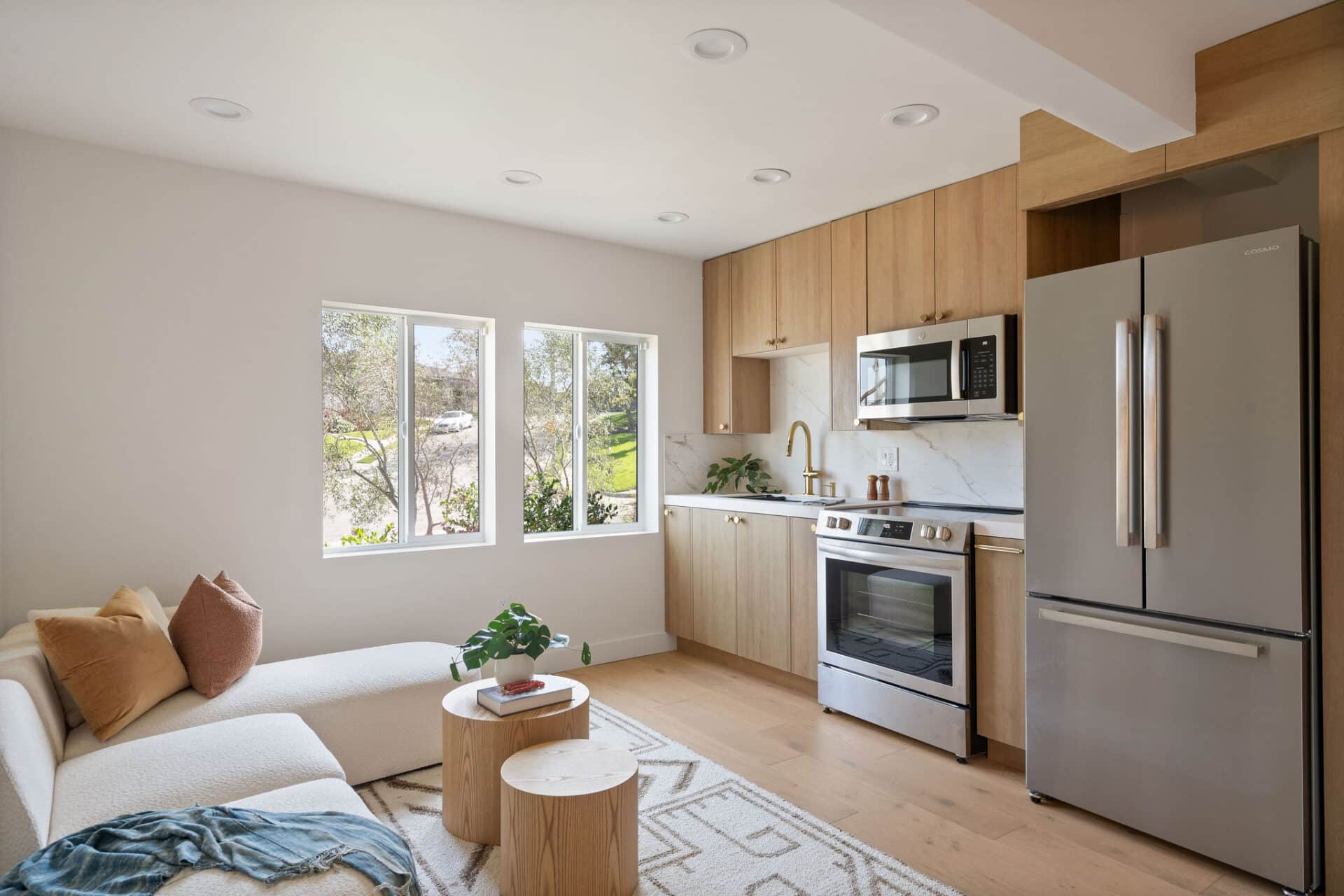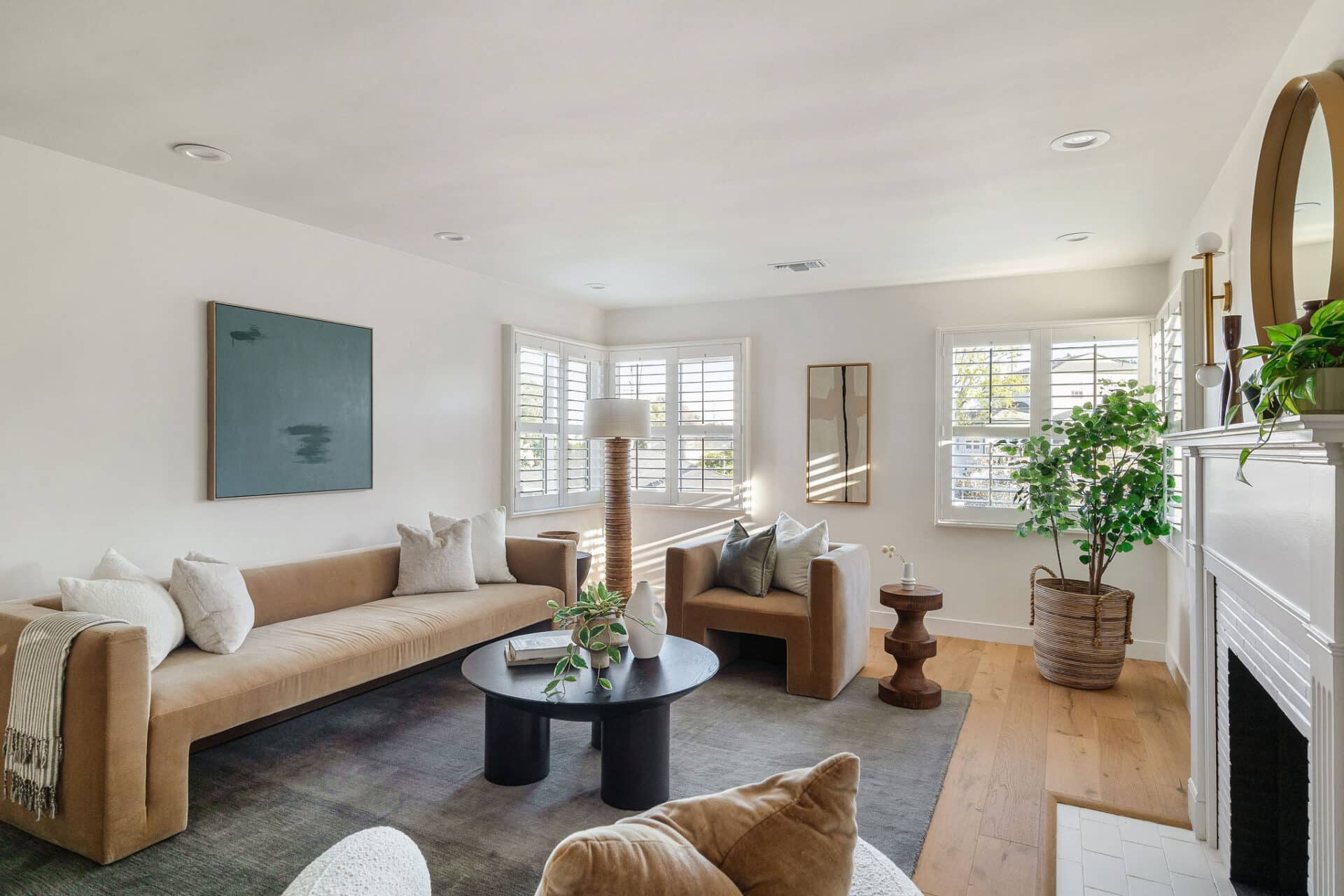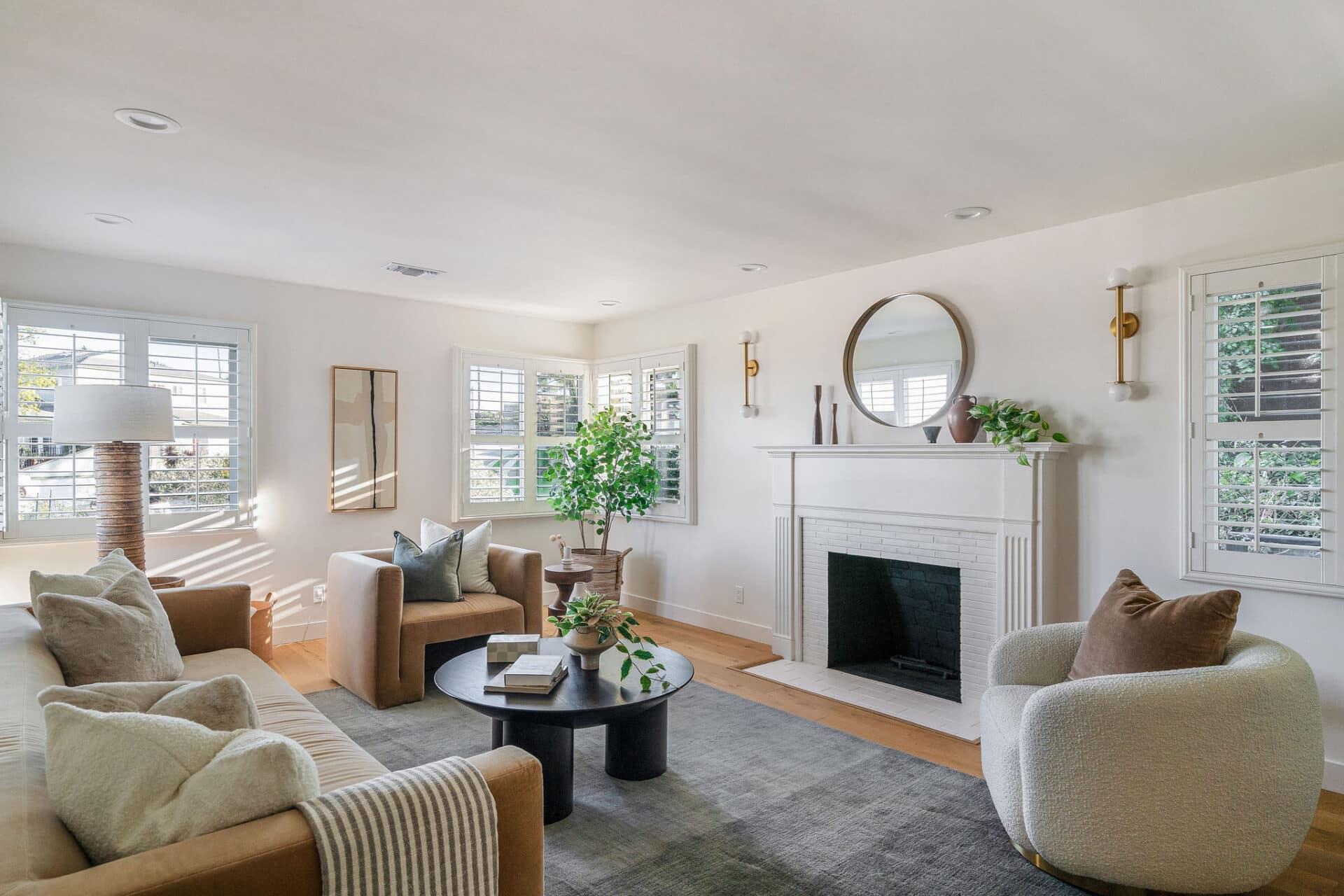 Upon entering, you step inside to discover the open dining room and kitchen outfitted with high-end stainless steel appliances, custom cabinetry, and elegant Bedrosian porcelain countertops–this kitchen is as functional as it is stylish. The large center waterfall countertop island offers ample space for meal preparation and socializing. Pendant lighting and a chic full-height porcelain backsplash add sophistication to the space. The large living room, with its classic fireplace and front-facing windows, is the perfect place to relax with family and friends, and gives holiday entertaining vibes.