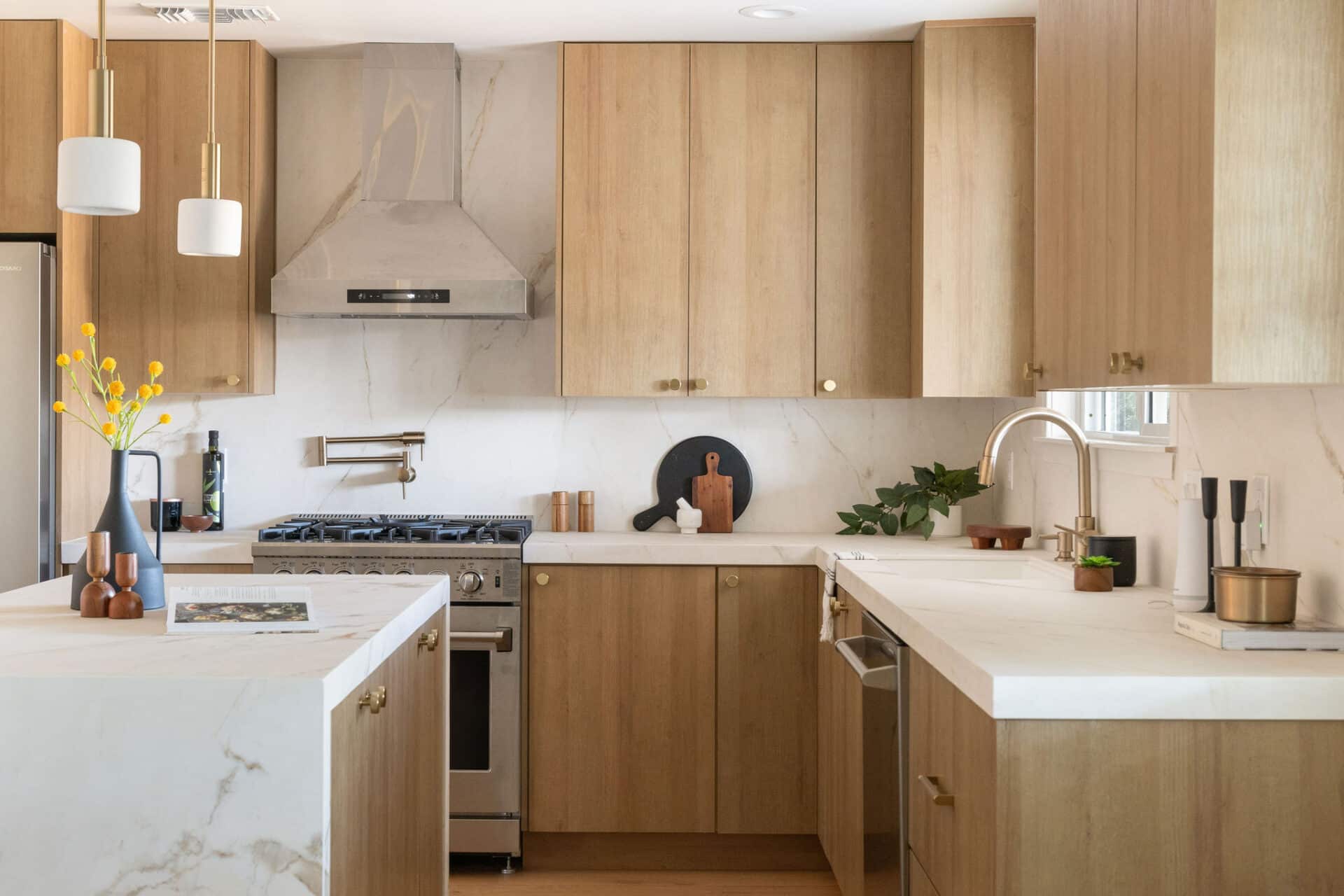 The large center waterfall countertop island offers ample space for meal preparation and socializing. A chic full-height porcelain backsplash add sophistication to the space.