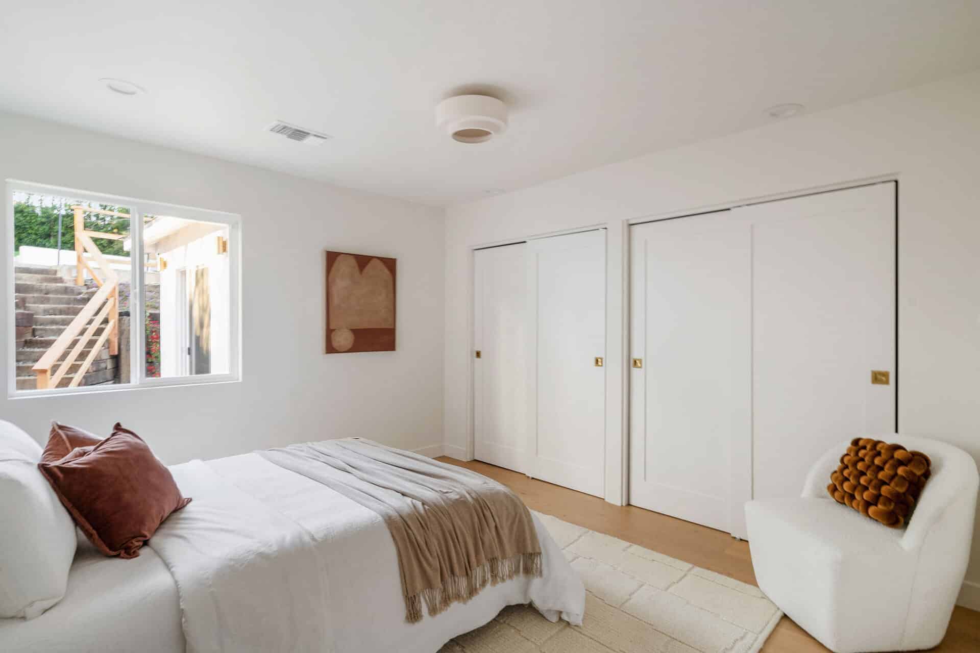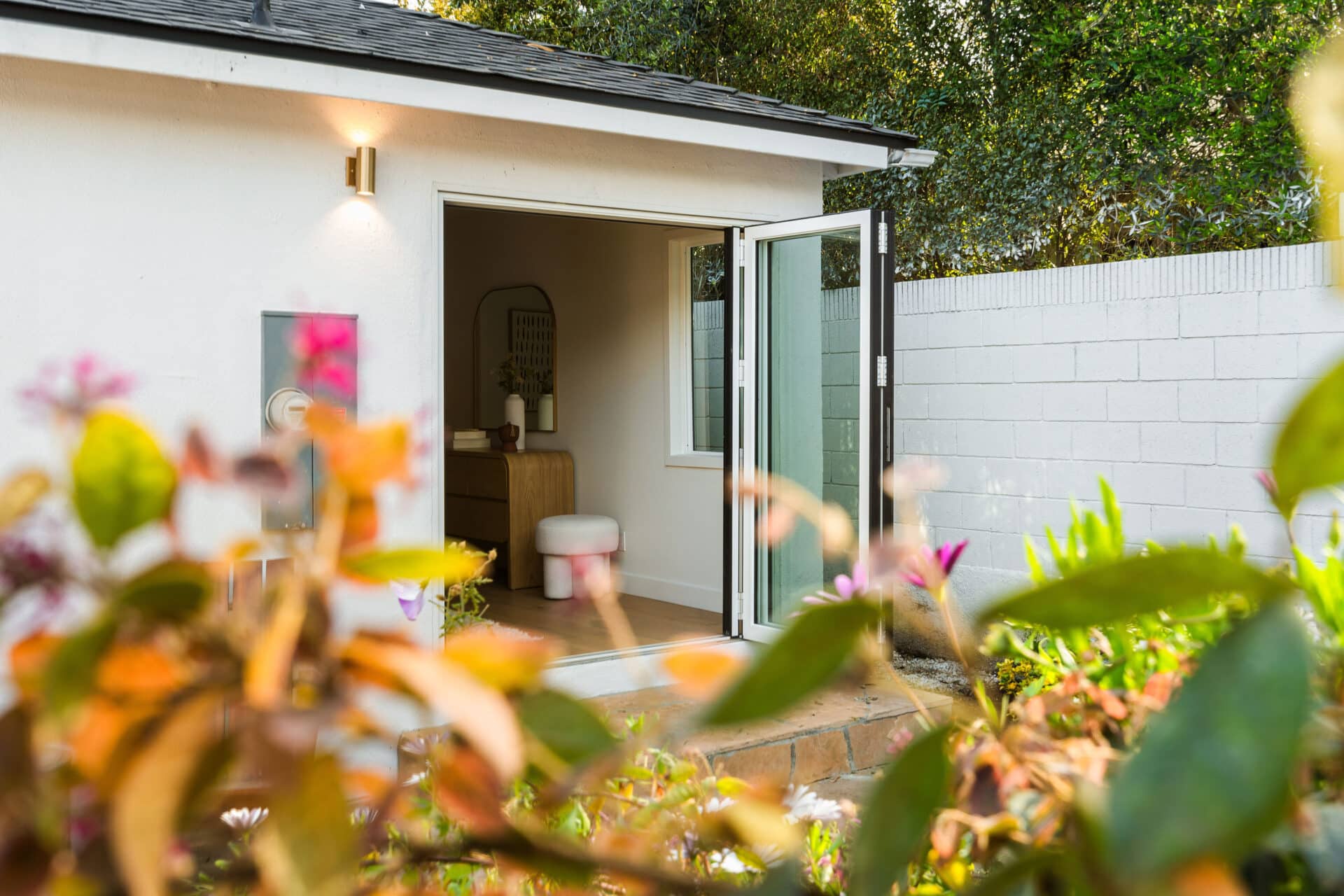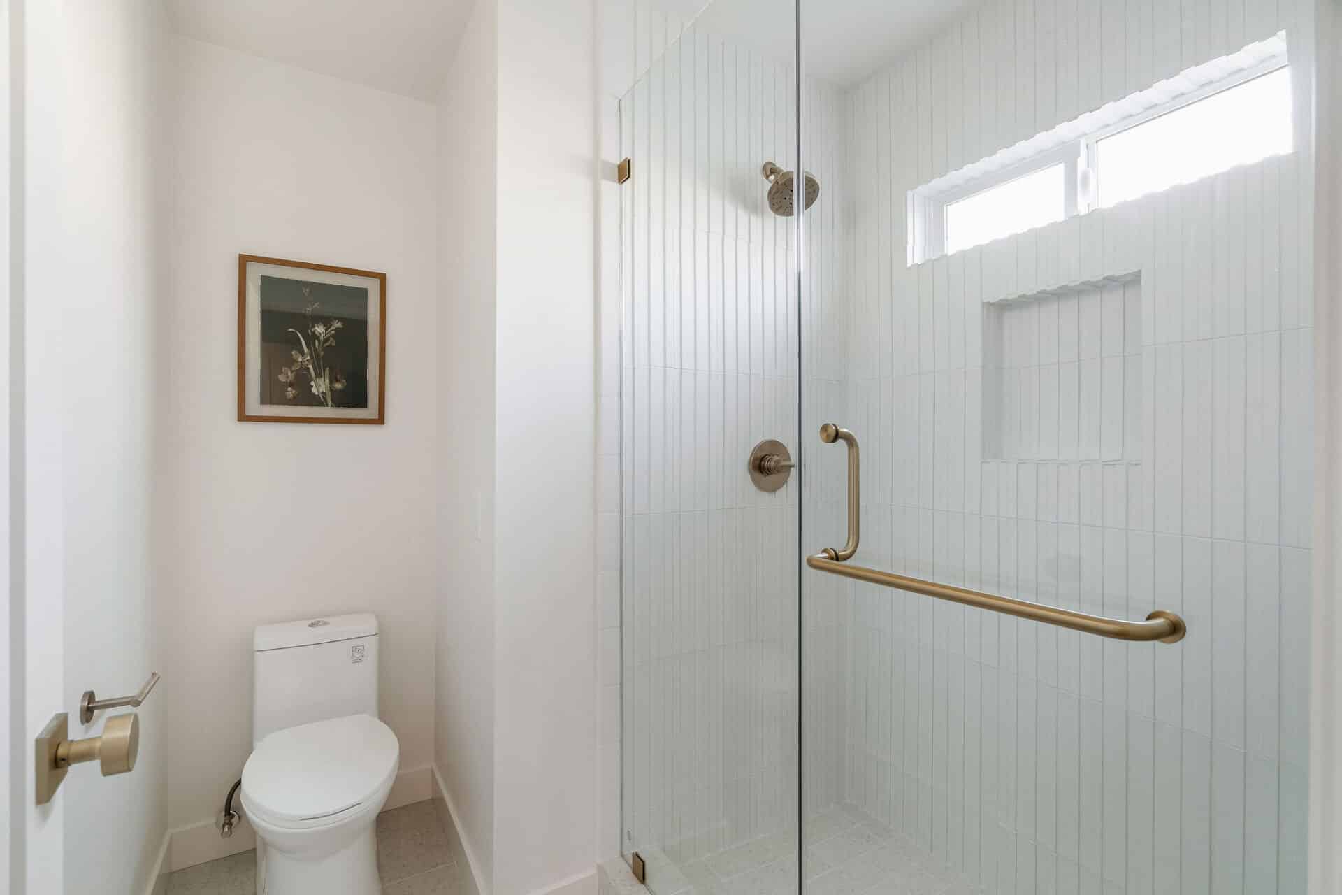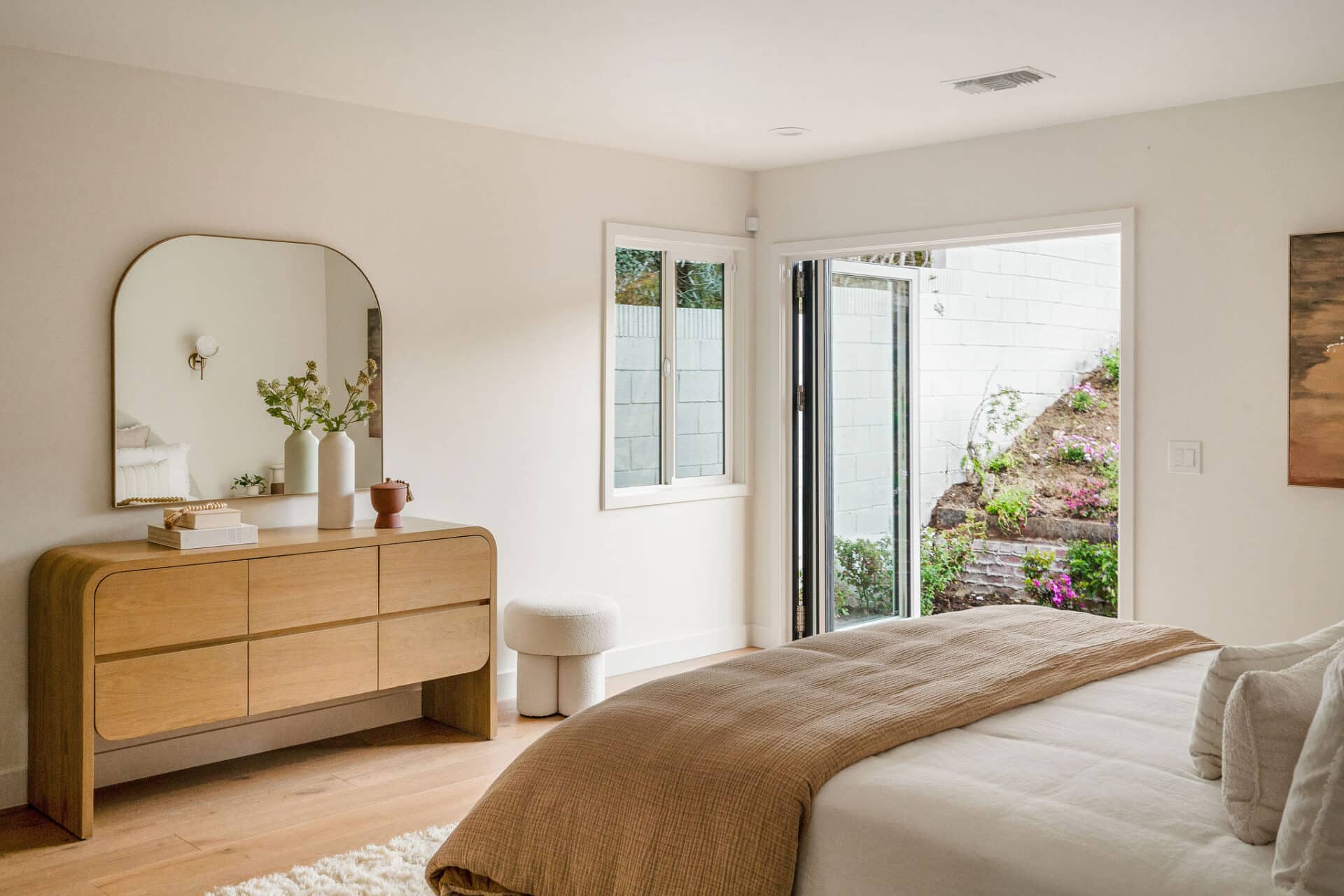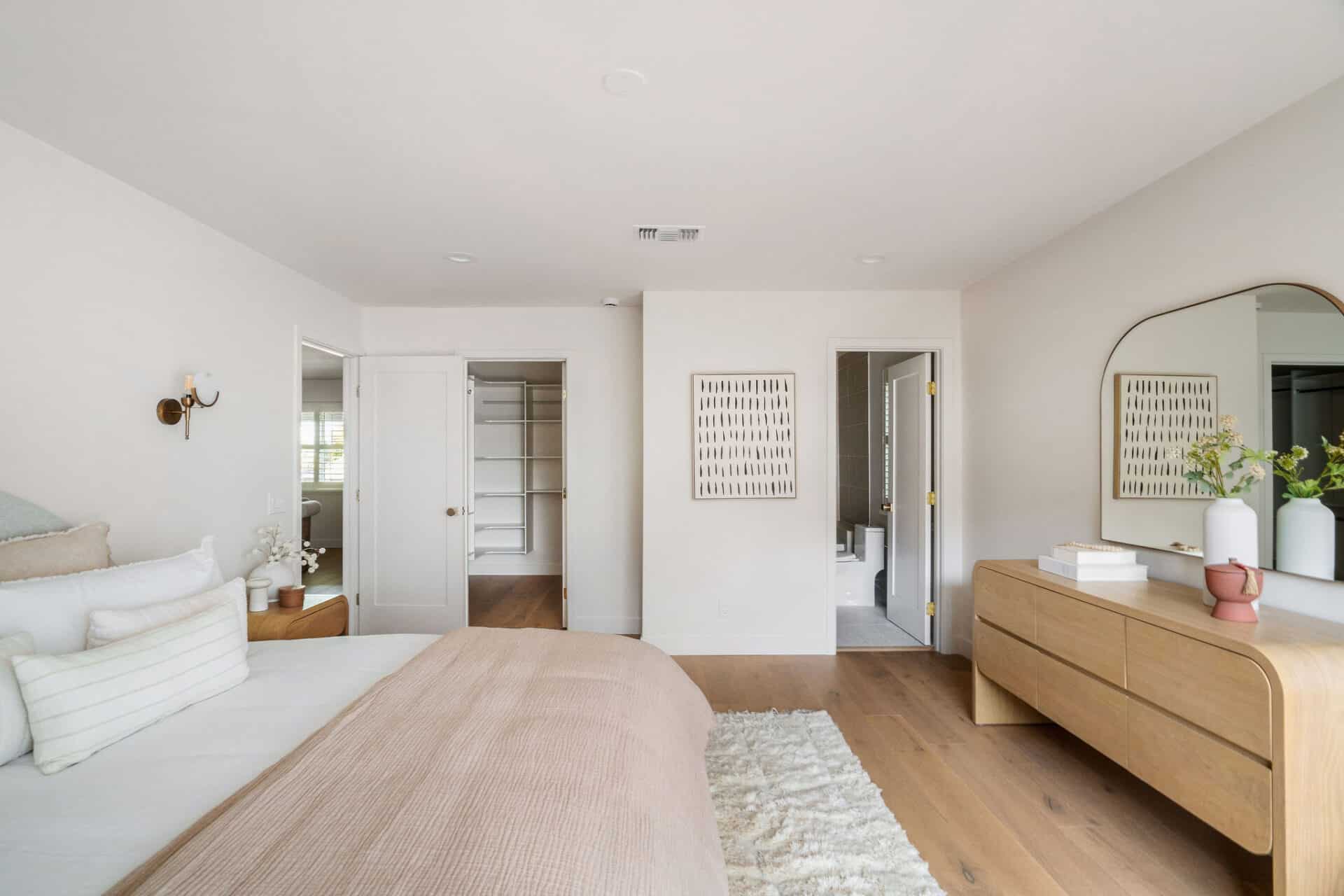 The spacious primary suite is a true retreat, featuring a large walk-in closet with ample built-in storage, and a generous en-suite bathroom with double vanity and a large shower over deep soaking tub. Begin your day by taking in the serene backyard viewed through bi-fold doors. Fresh tile work and brushed brass details add to the overall elegance.