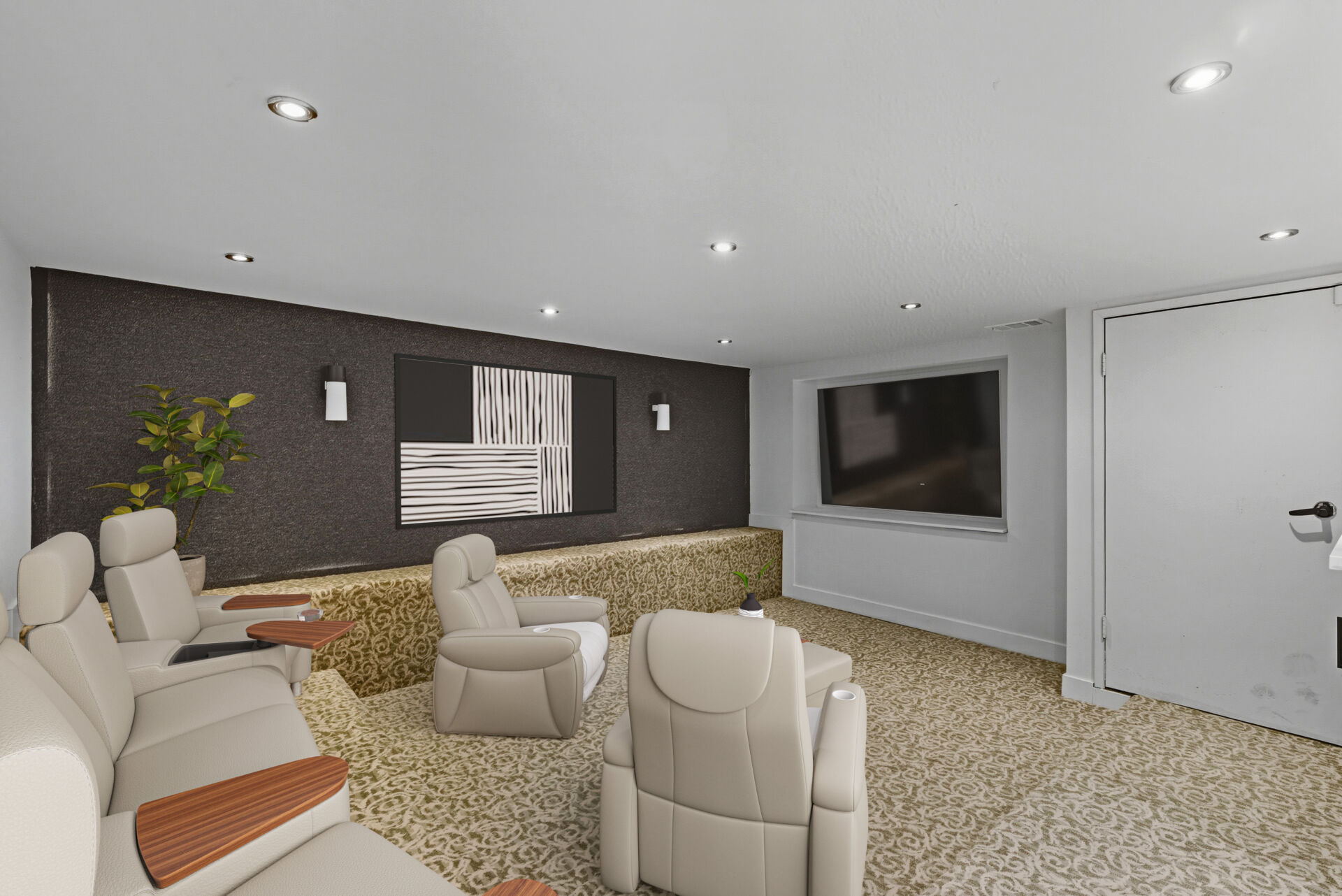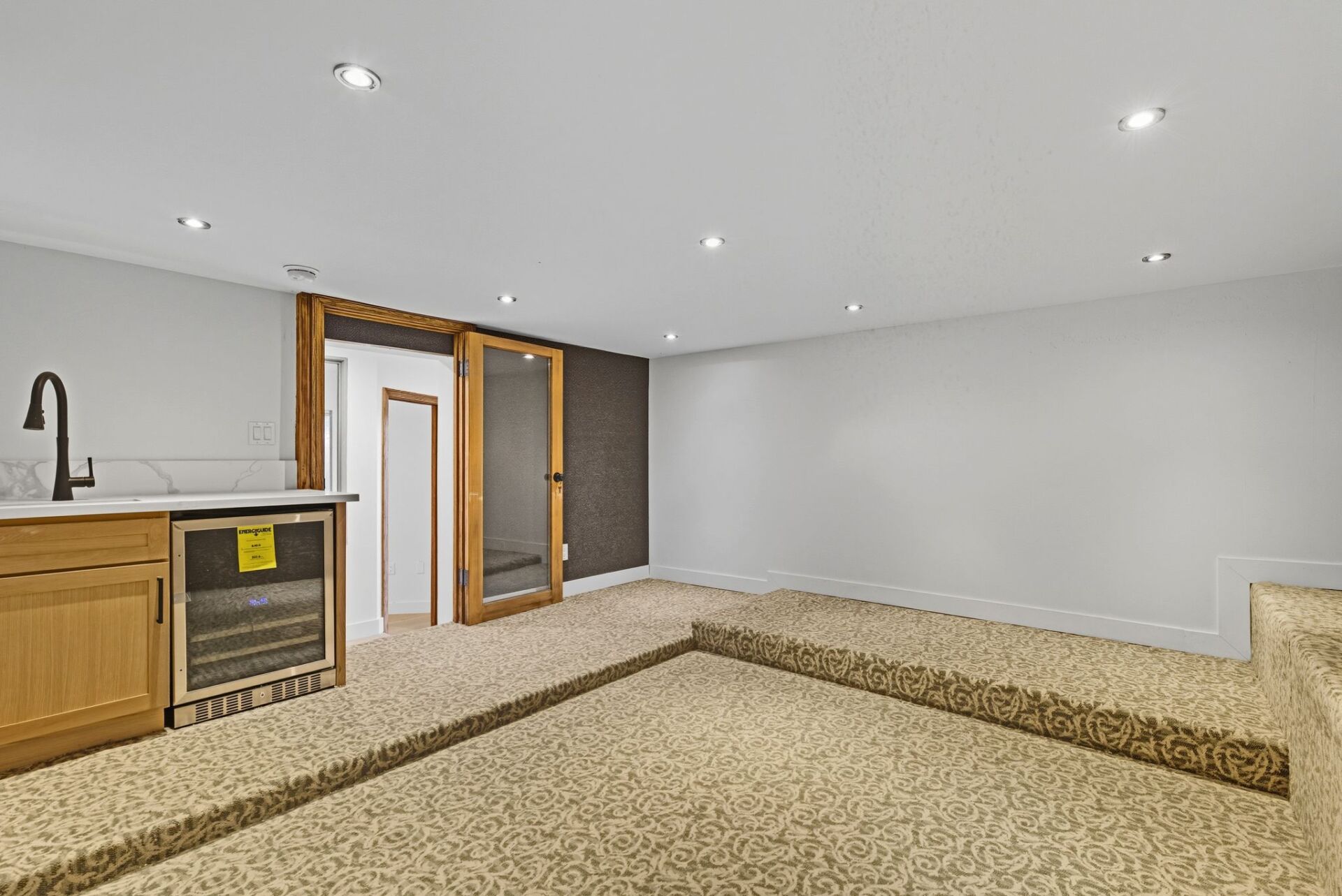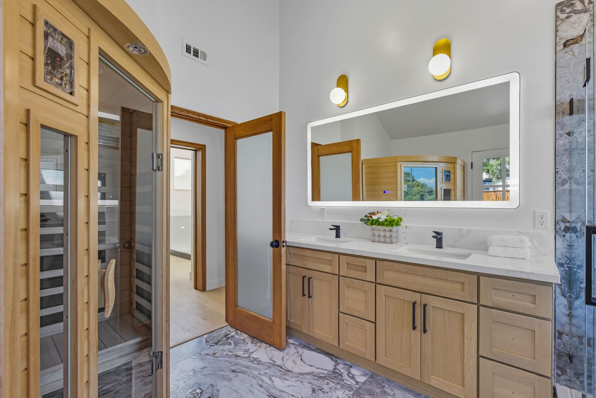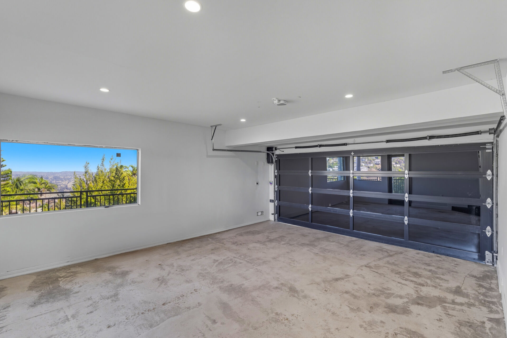 The entire third level is devoted to the primary suite, a private sanctuary above a crooning canyon. Floor-to-ceiling windows frame sweeping views, while a private balcony captures the glow of dawn. A vaulted wood-clad ceiling, fireplace, and spa-like bath with book-matched marble, dual vanities, glass-enclosed shower, freestanding tub, and freestanding sauna complete the retreat. On the lower level, a versatile studio and dedicated screening room provide creative and practical flexibility, complemented by additional bedrooms and baths for family or guests. Multiple terraces and balconies extend the living space outdoors, connected by a striking spiral staircase. Whether for sunset cocktails or stargazing, each space offers a new perspective of the canyon and city skyline.