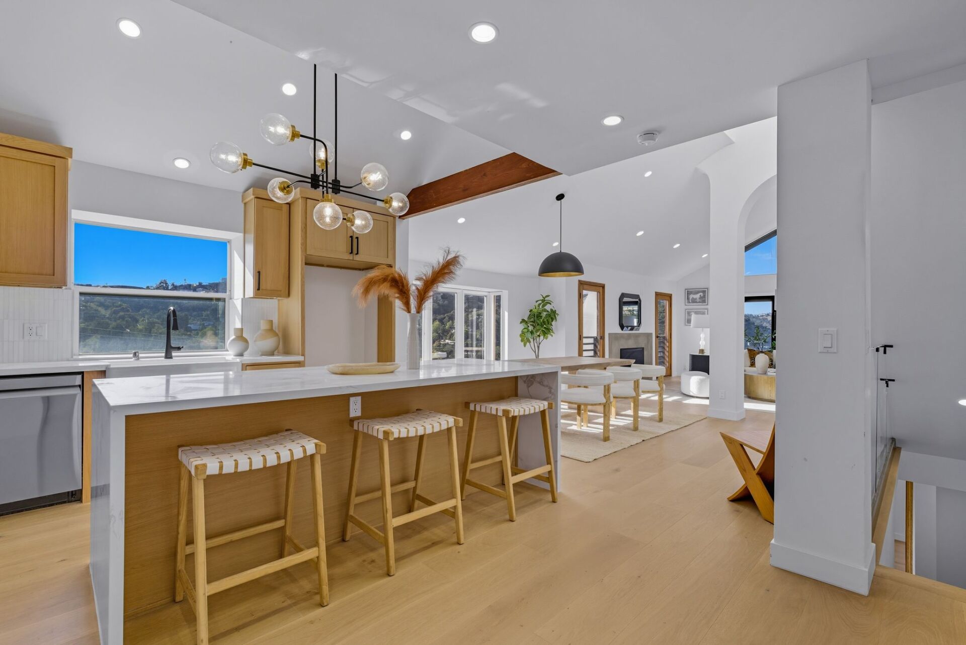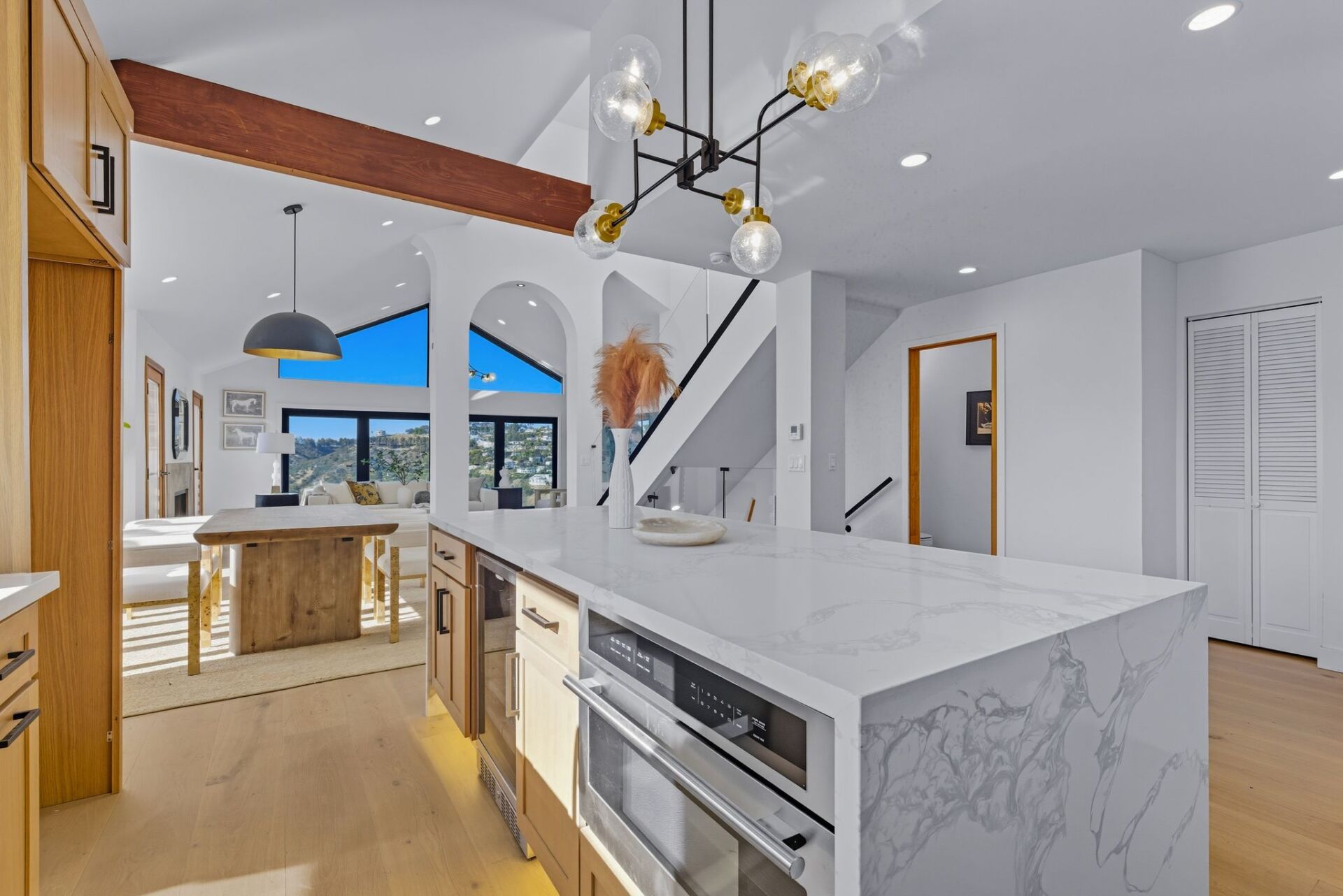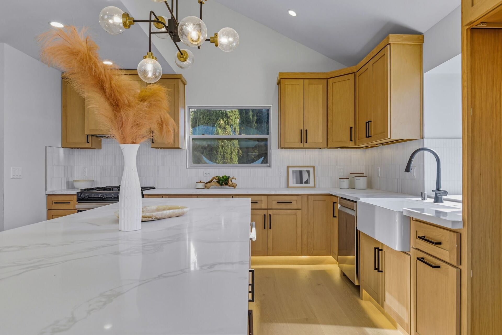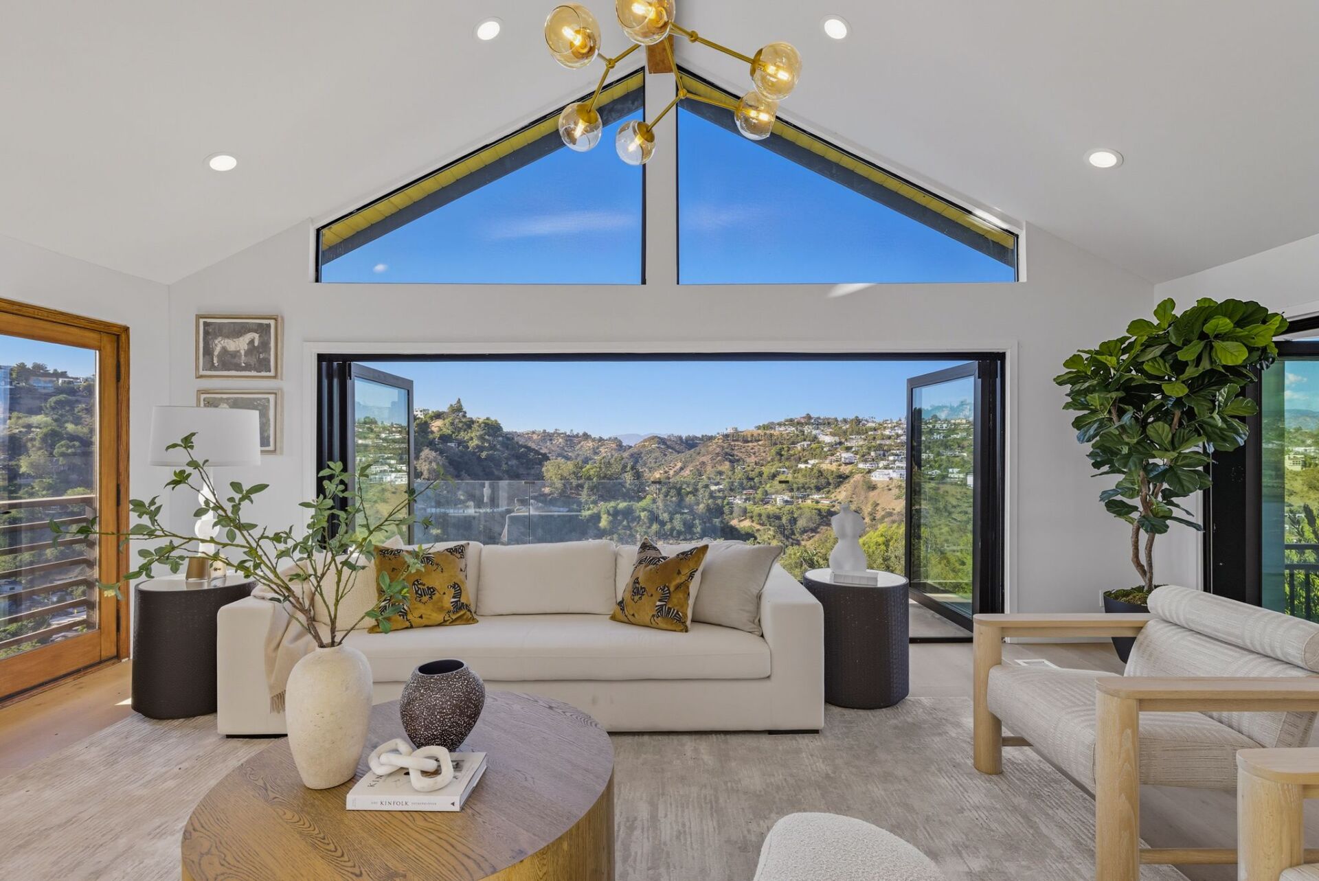 Dramatic Laurel Canyon luxe retreat with sweeping views! This newly reimagined Spanish 3-bedroom, 3.5-bath retreat offers 2,309 square feet of elevated living, blending timeless charm with modern sophistication. Arrive through a private gated drive and leave the world behind. Inside, the vaulted great room welcomes with airy proportions and natural light. The chef’s kitchen is a true centerpiece, anchored by an expansive waterfall island perfect for gatherings. Custom white oak cabinetry, quartz counters, under-cabinet lighting, and brand-new stainless appliances make this space as functional as it is beautiful. The living room impresses with soaring ceilings and walls of glass, where French doors seamlessly dissolve indoor and outdoor boundaries. A sleek fireplace and warm oak accents create a setting equally suited for entertaining or quiet evenings at home.