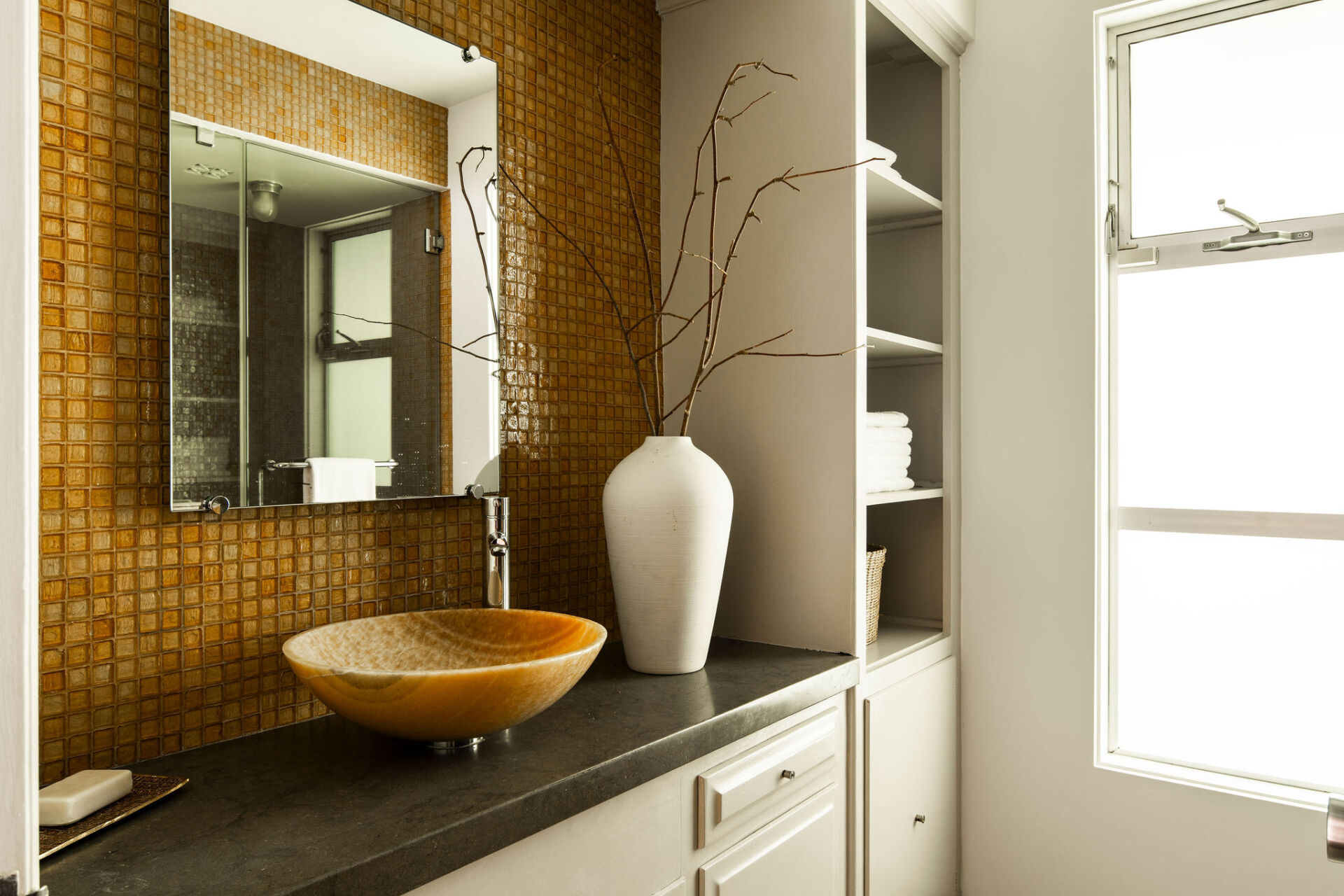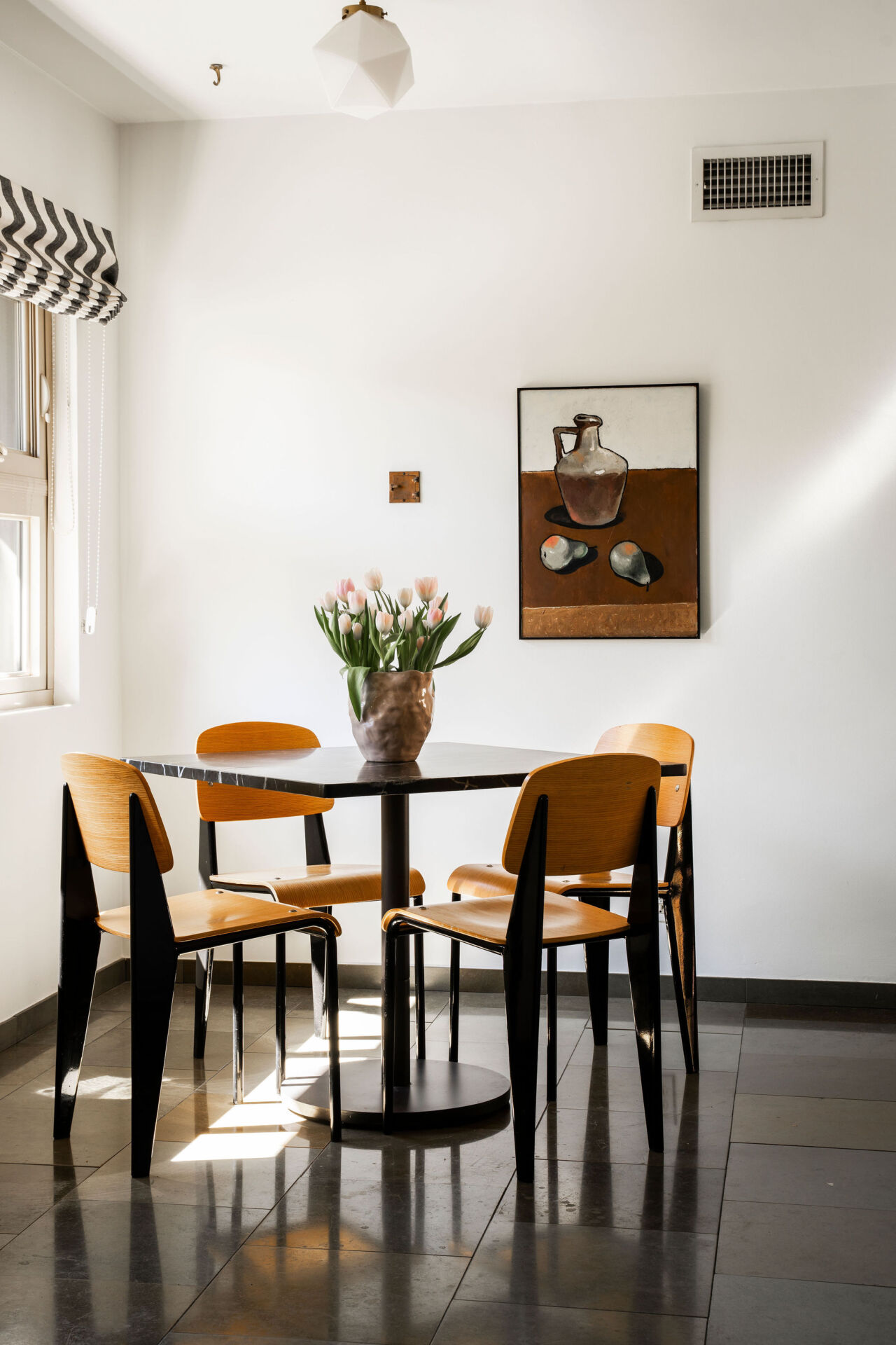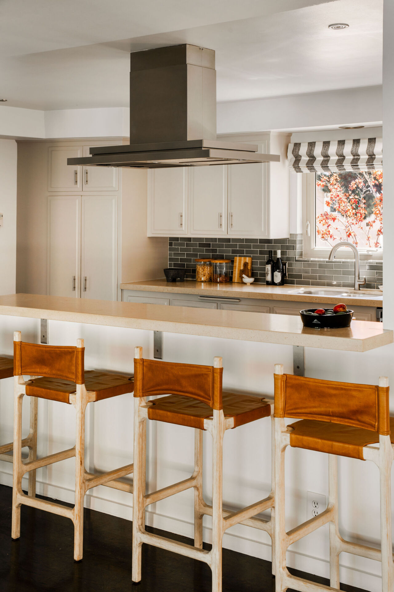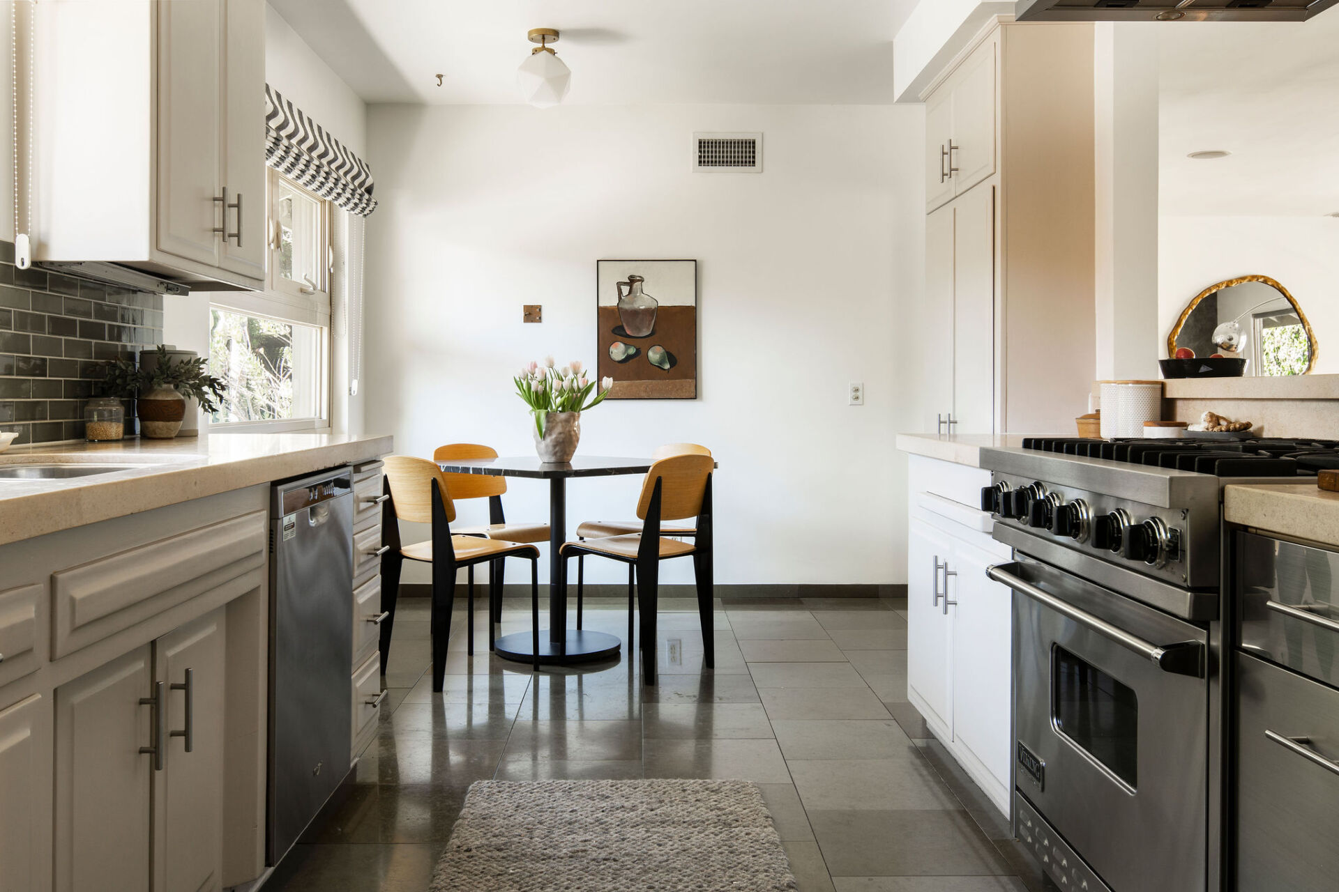 The open kitchen overlooks it all, featuring slate floors, Heath Ceramics tile, limestone island, and an inviting breakfast nook perfect for a quiet morning coffee or catching up over a casual bite.