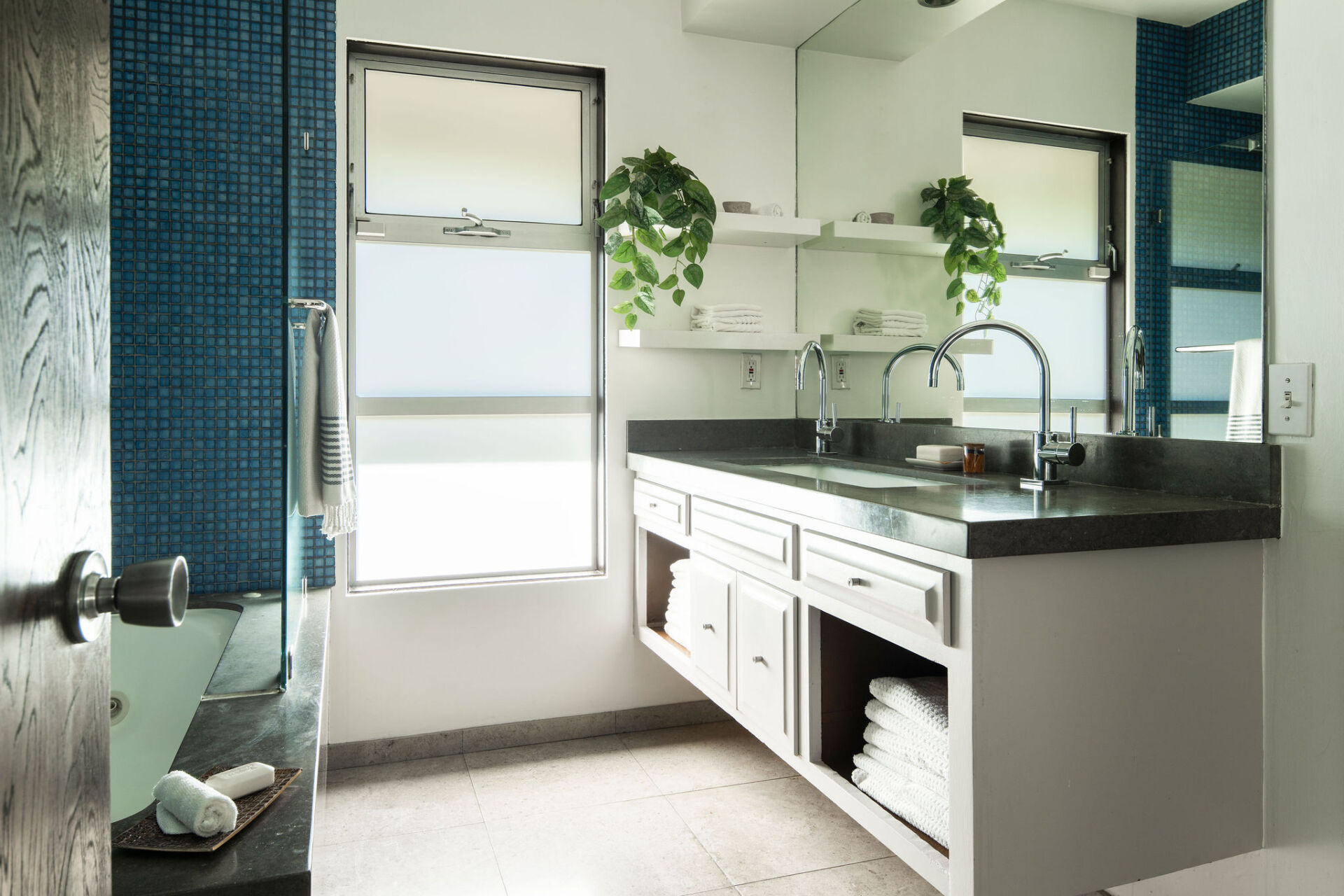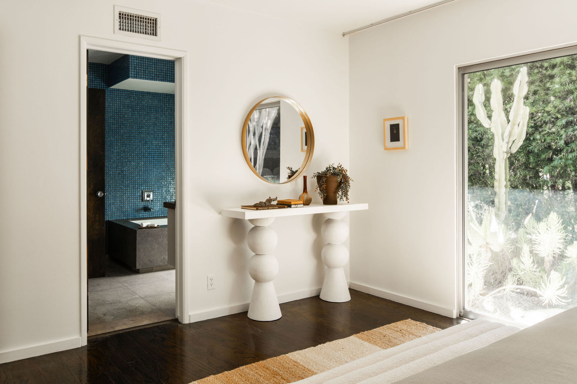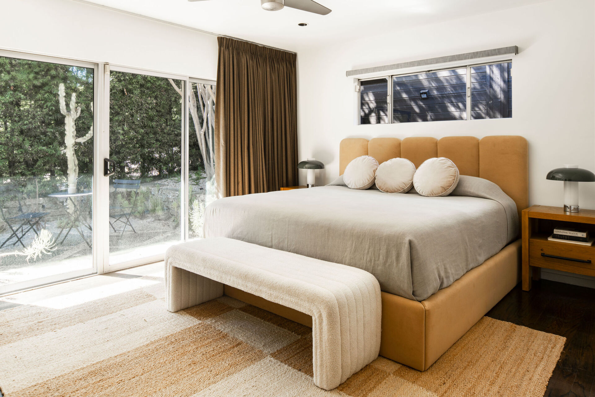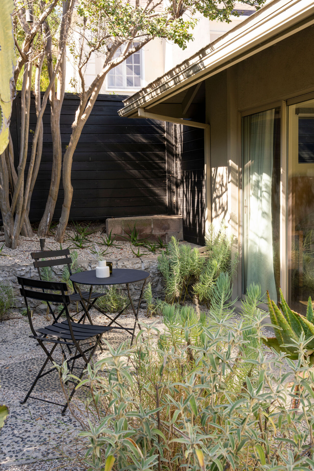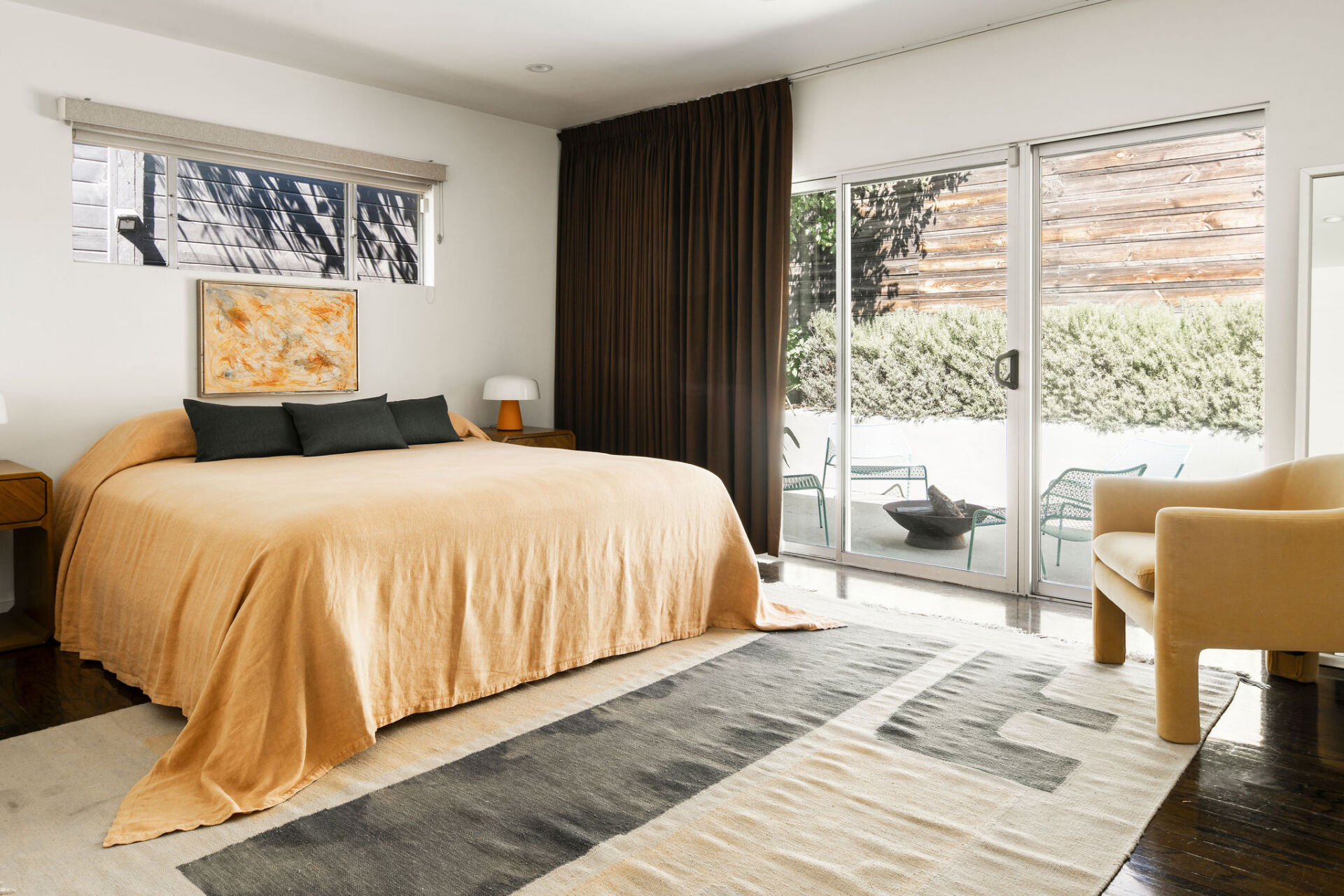 In one wing, the primary suite offers calm and privacy, with oversized sliders that open to the lush front courtyard and a spa-like bath with dual vanity and a deep soaking tub-shower. A second bedroom, almost like a second primary in size, also opens to the backyard. The third bedroom and a stylish hall bath with chic glass tile shower are located in the opposite wing, creating flexibility and privacy for guests or work-from-home needs.