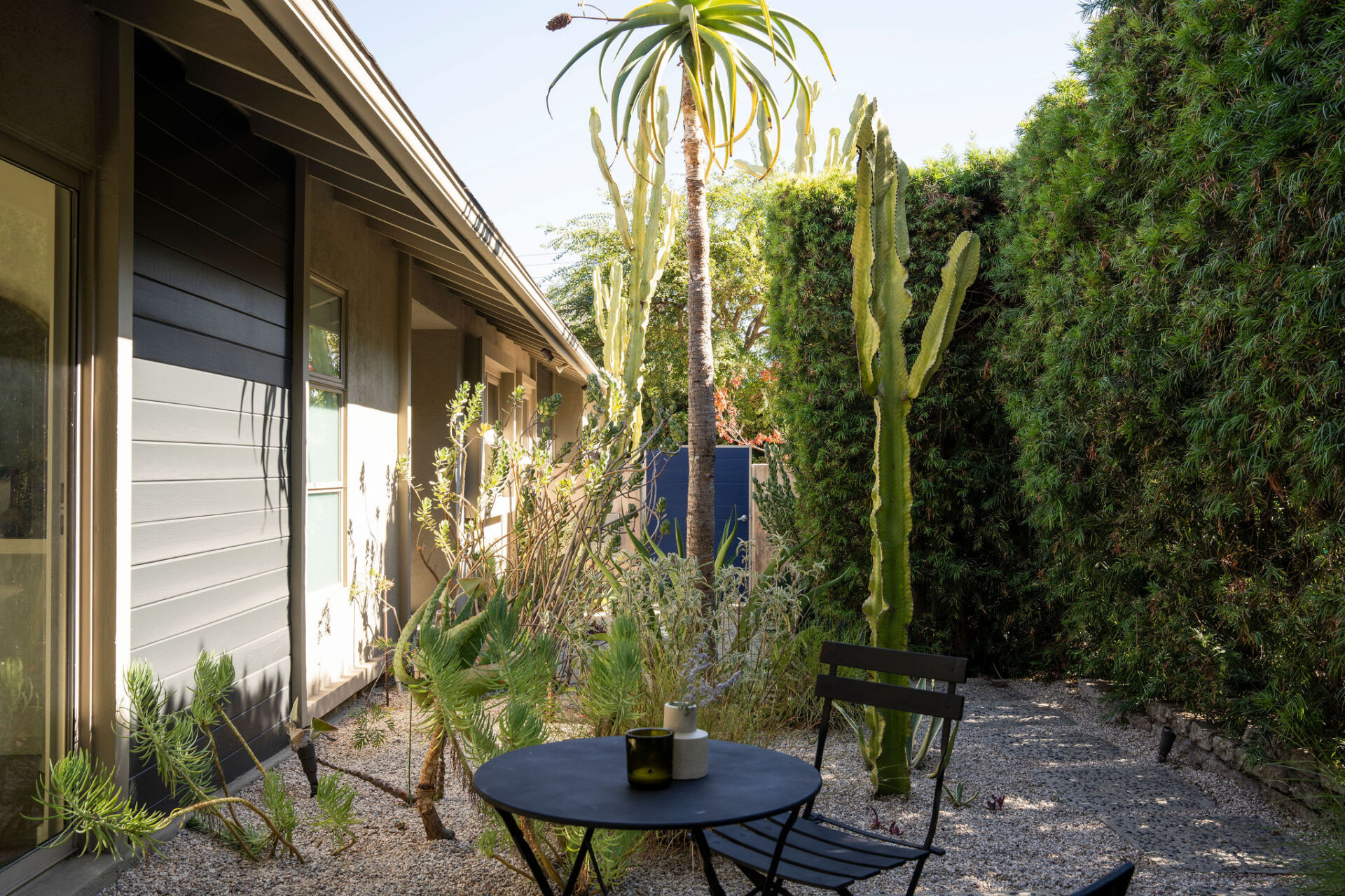 Tucked behind gates, hedges, and a lush tapestry of native, drought-tolerant plants and sculptural cacti, this private mid-century oasis in prime Los Feliz blends timeless design with tranquility. A majestic Japanese maple and zen-like courtyard with a babbling fountain set the tone, while stone paths, gravel walkways, and layered greenery invite you in before you’ve even stepped inside.