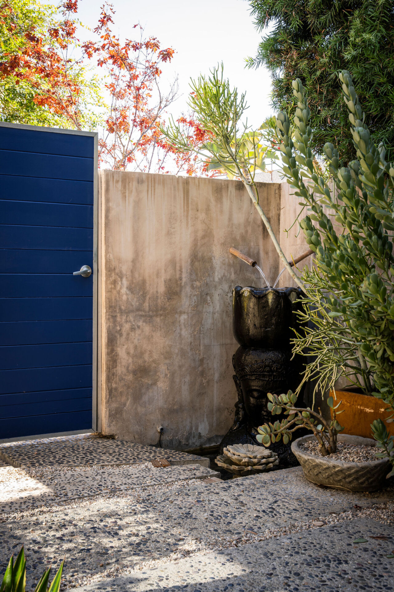 A majestic Japanese maple and zen-like courtyard with a babbling fountain set the tone, while stone paths, gravel walkways, and layered greenery invite you in before you’ve even stepped inside.