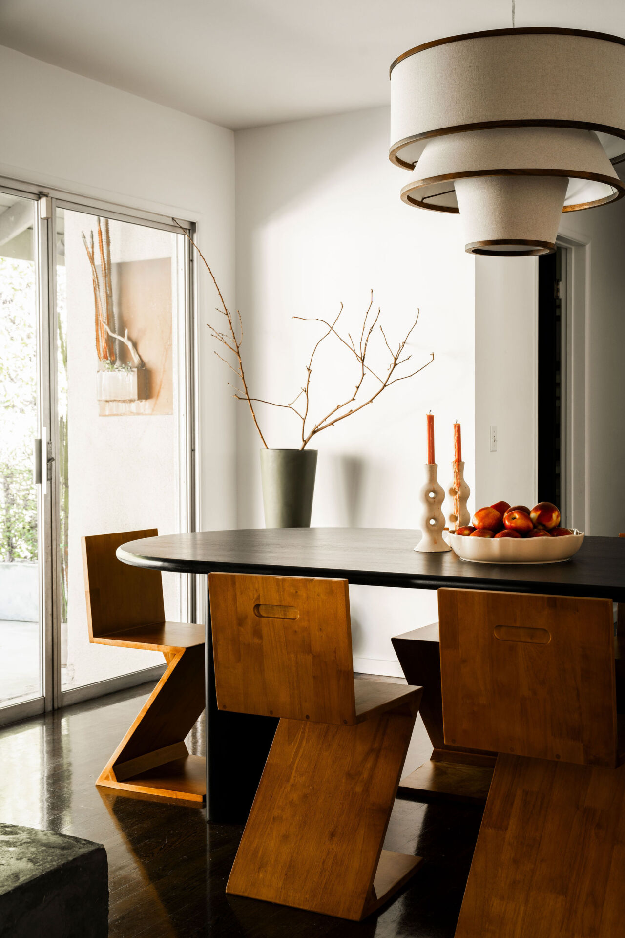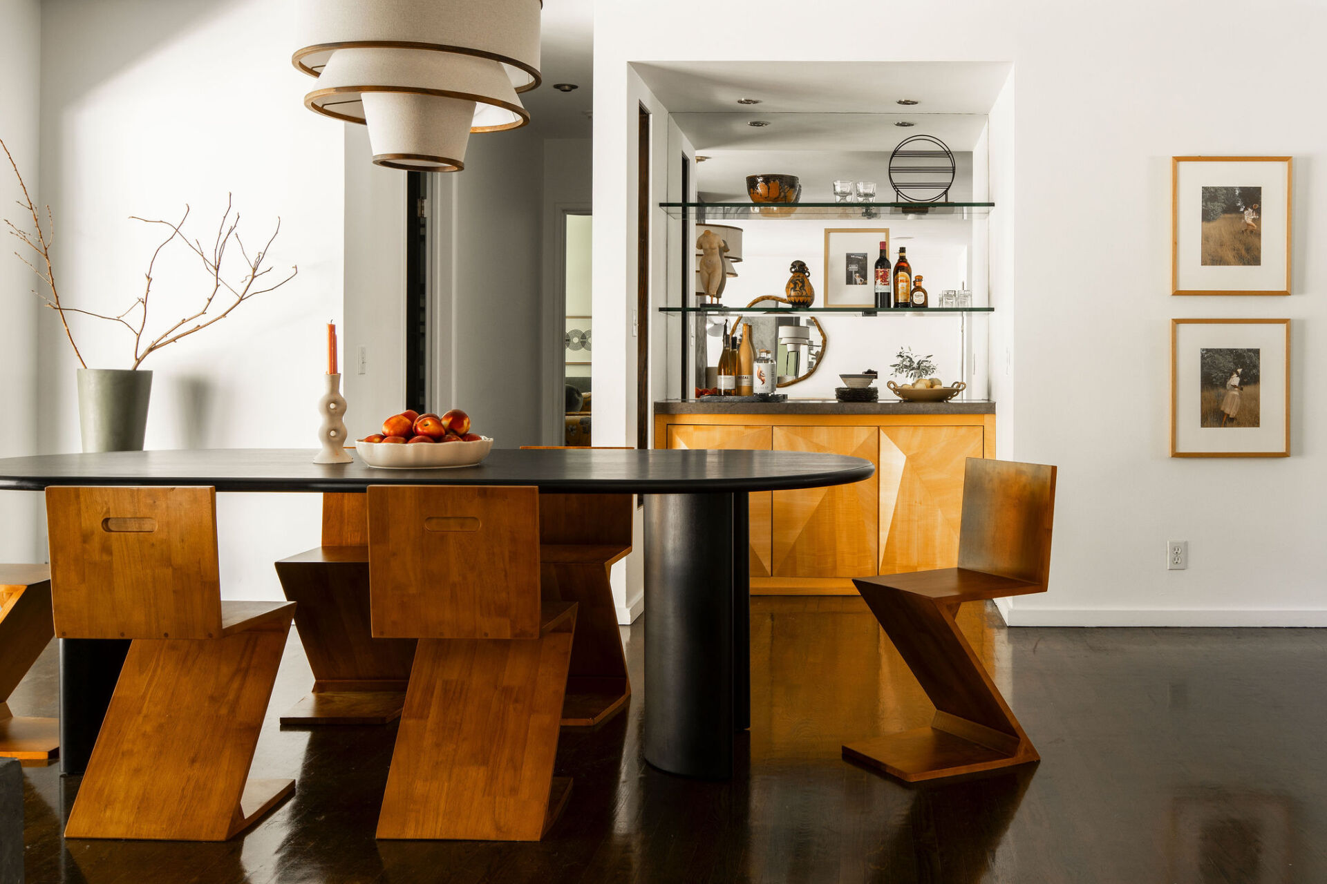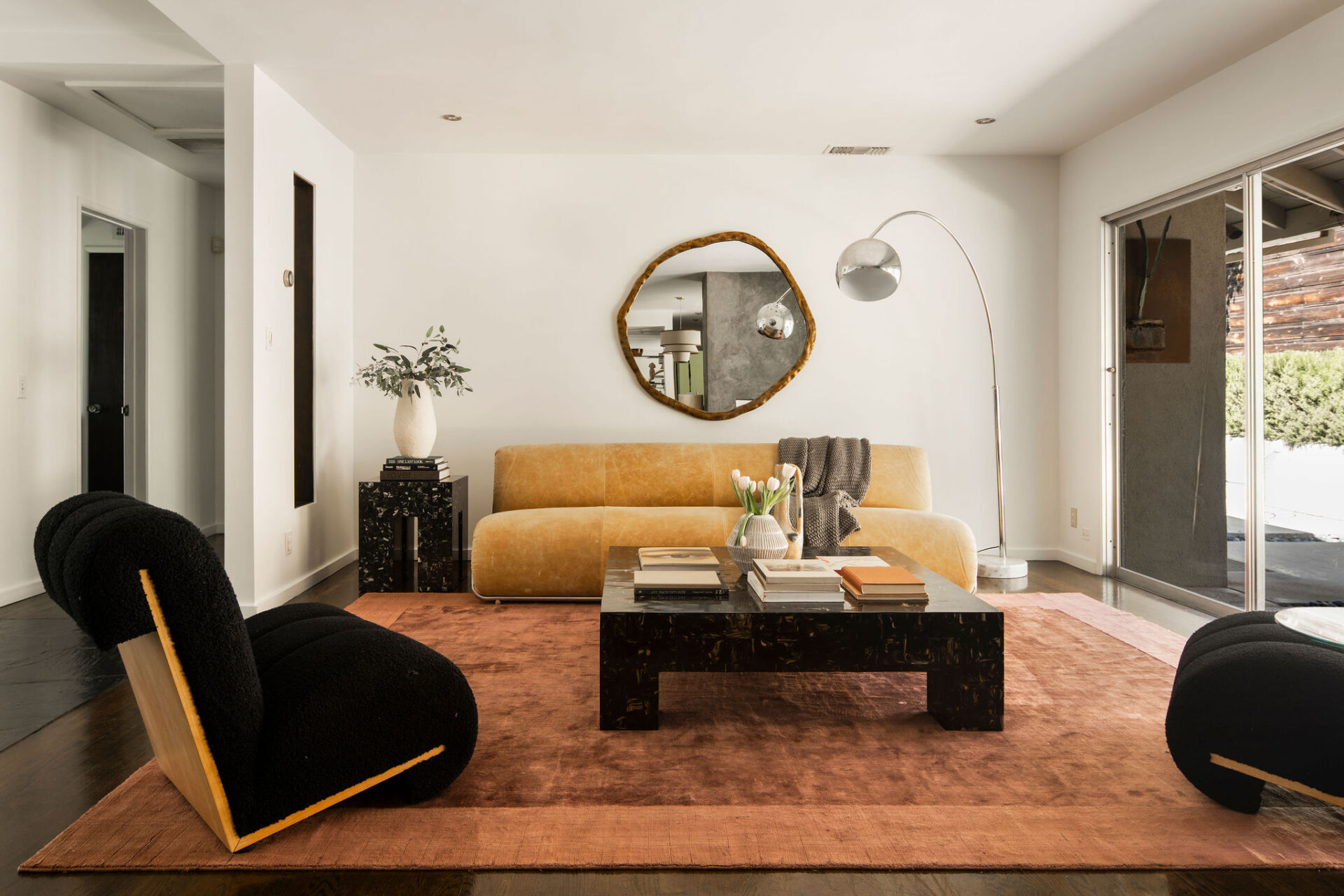 The entryway opens to a wide, light-filled layout anchored by rich dark wood floors and a full wall of glass that brings the outdoors in—true to mid-century ideals.