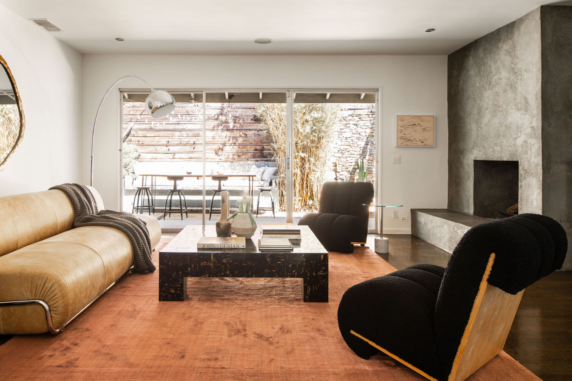 The entryway opens to a wide, light-filled layout anchored by rich dark wood floors and a full wall of glass that brings the outdoors in—true to mid-century ideals. The spacious living room flows into a generous dining area and a custom bar, with a sleek double-sided concrete fireplace offering warmth and subtle separation between spaces.