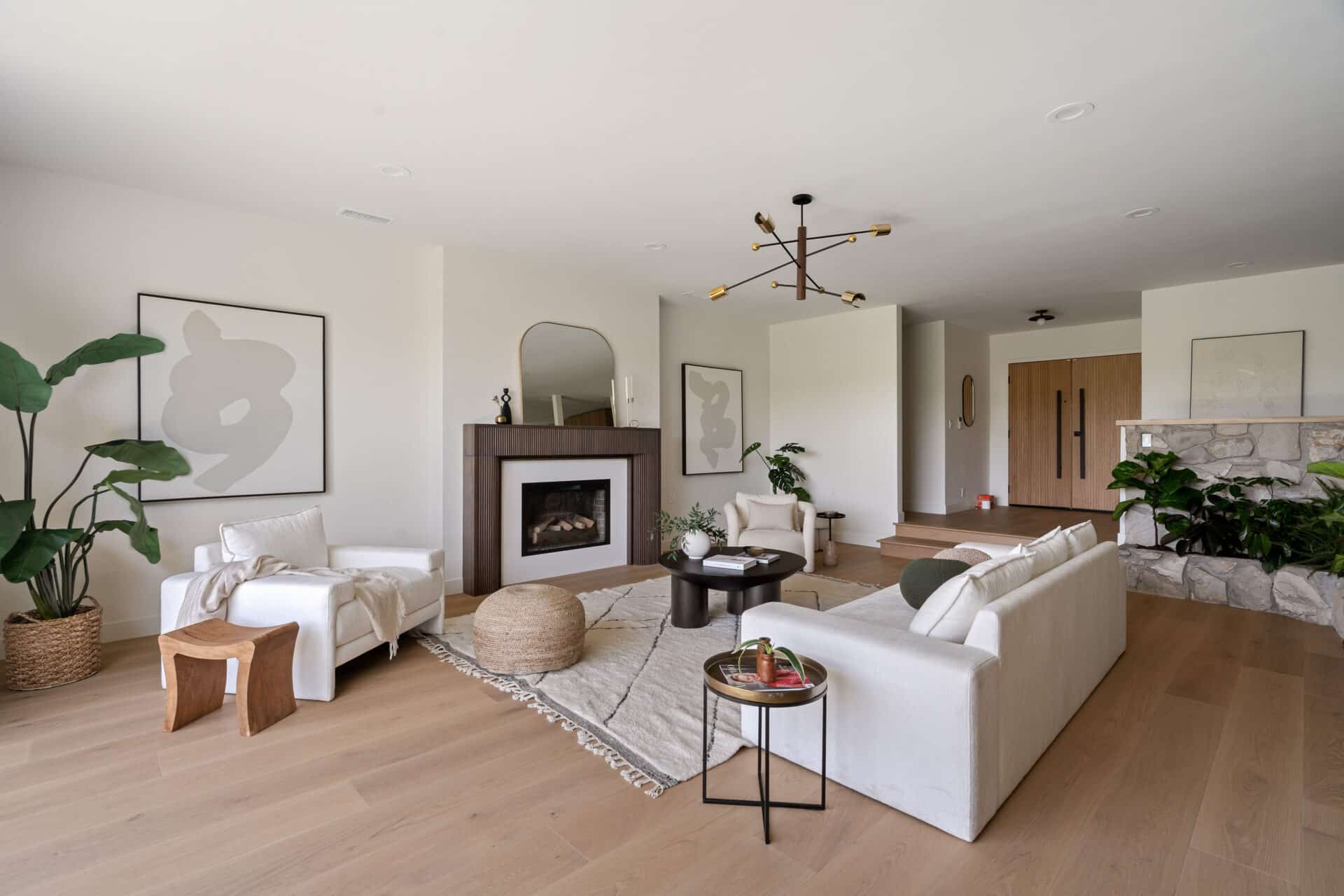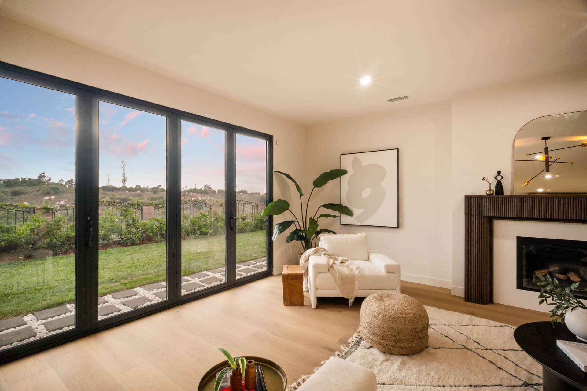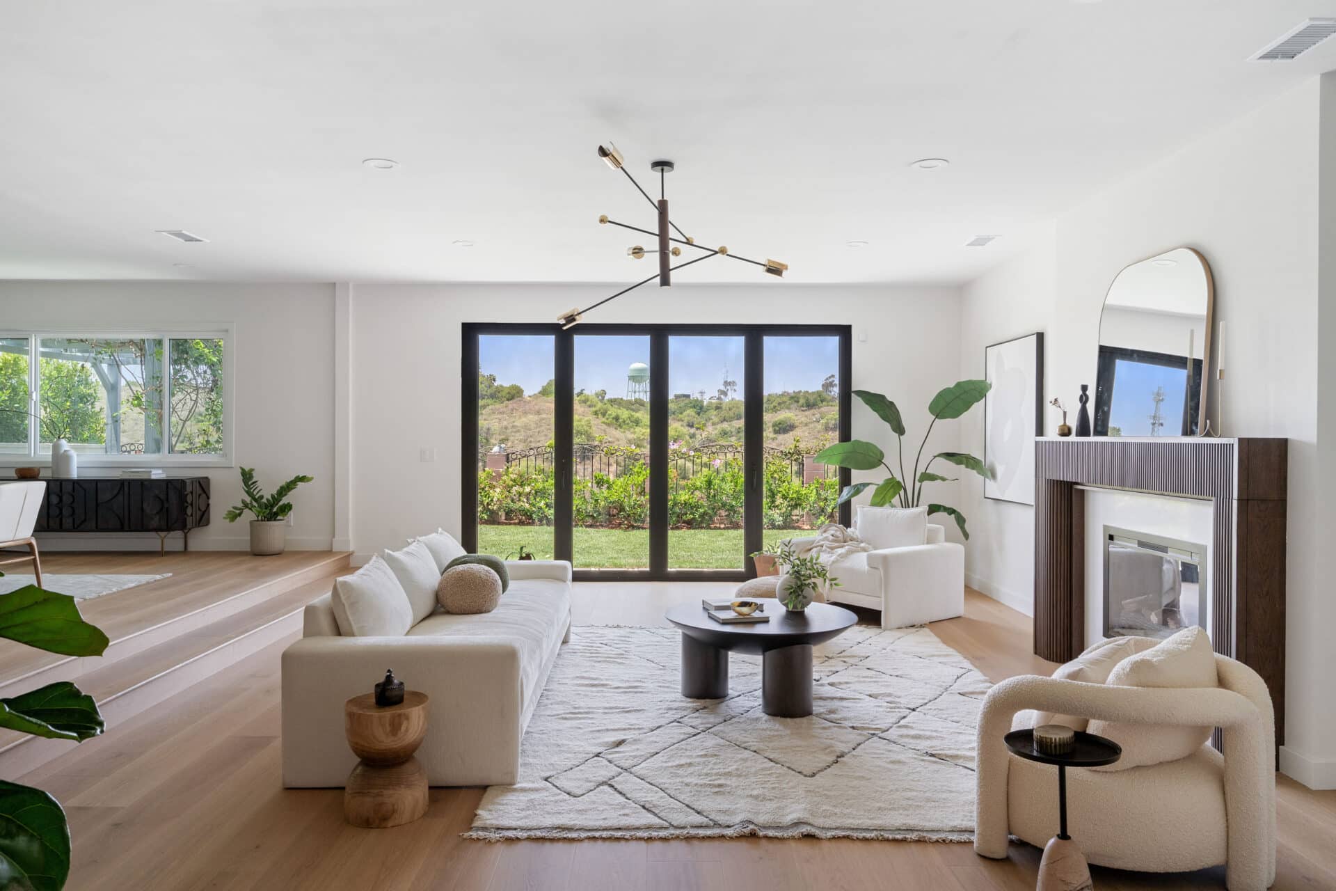 Anchored by a sleek custom mantle and an original flagstone planter that nods to the home’s Mid-Century roots, the living room opens through expansive folding doors, inviting natural light and breezes from the West.