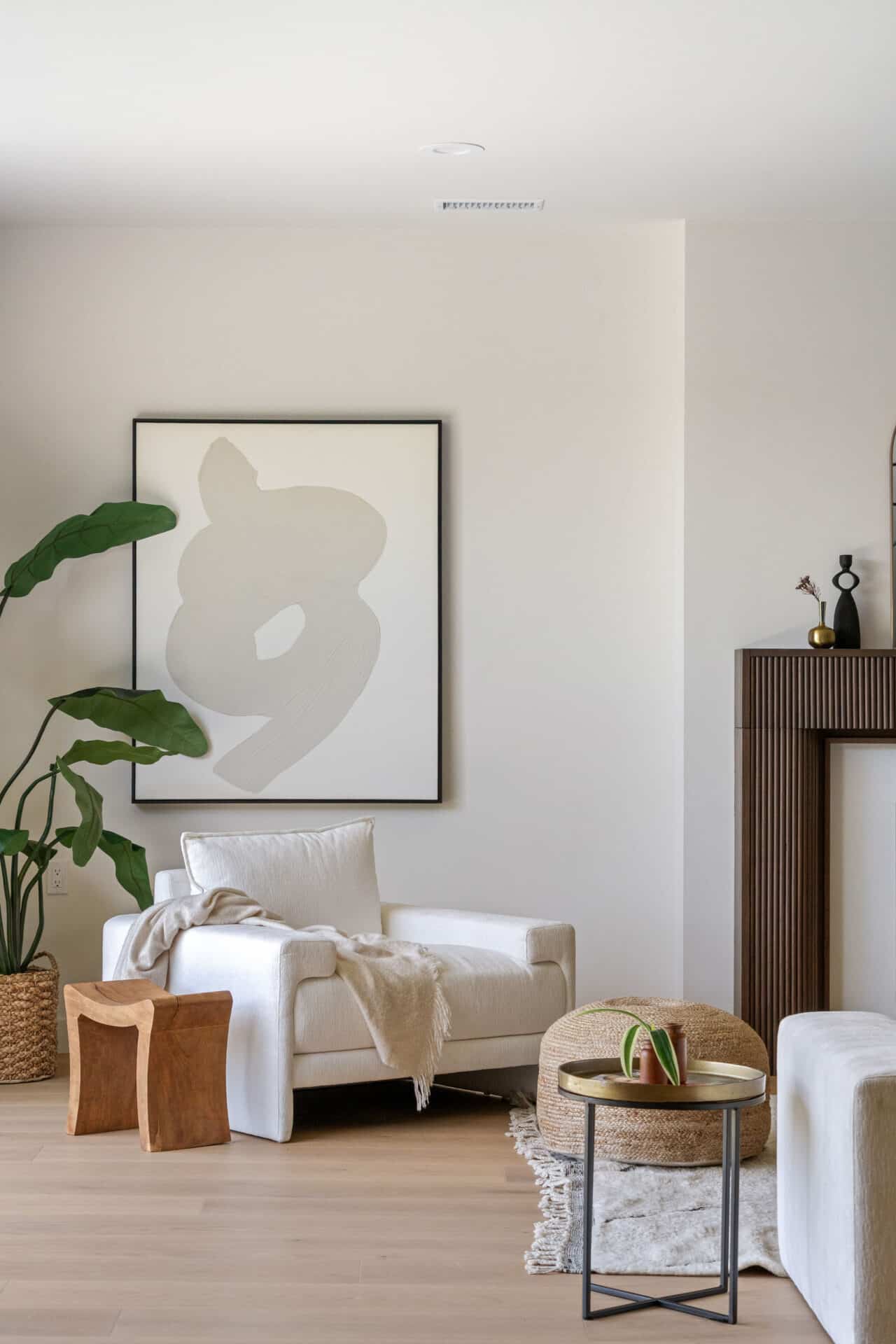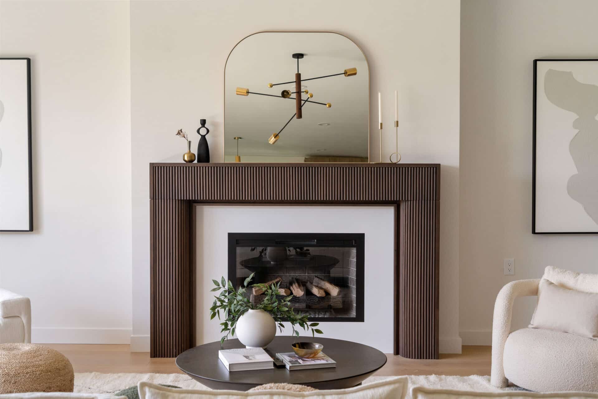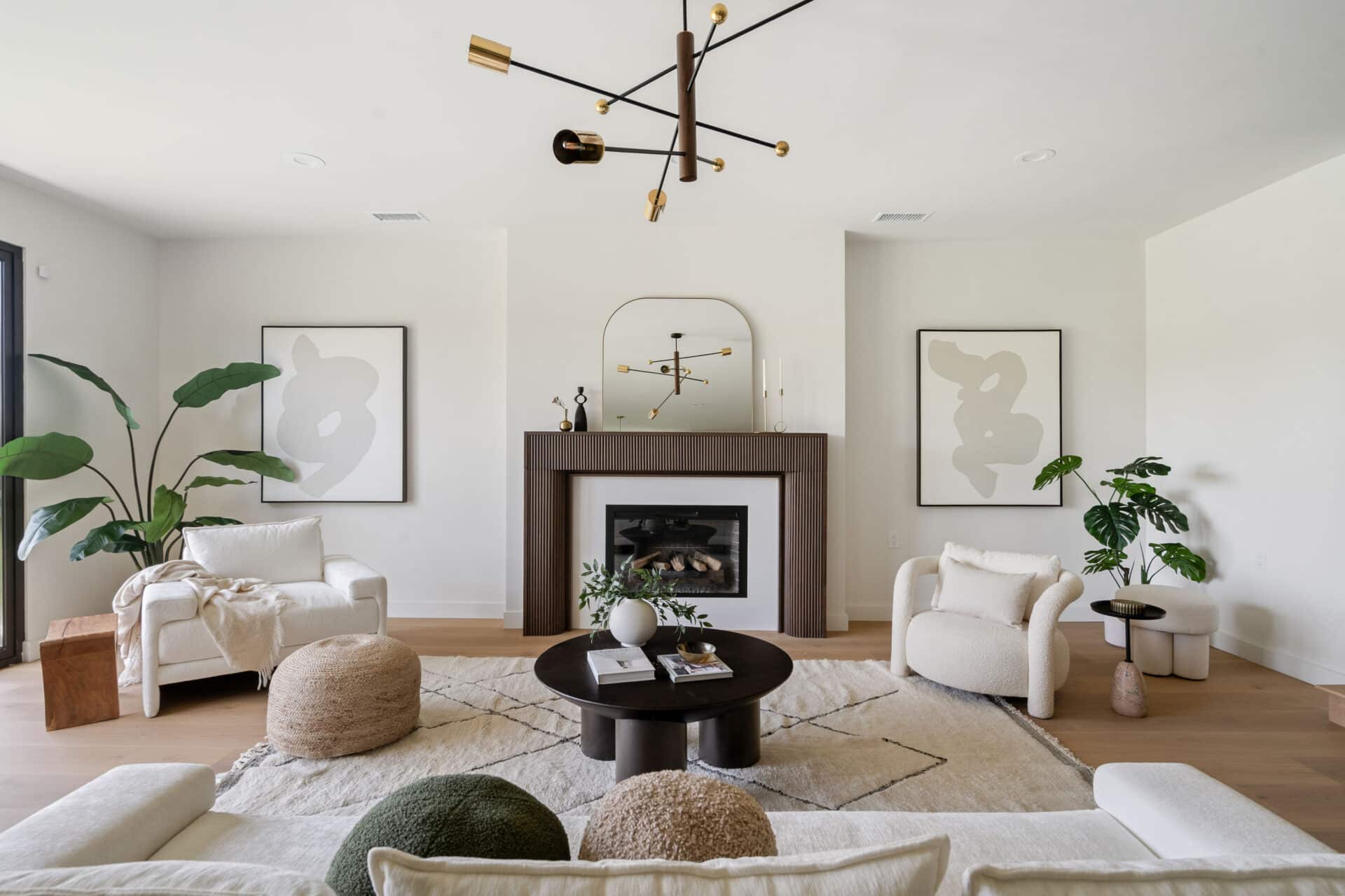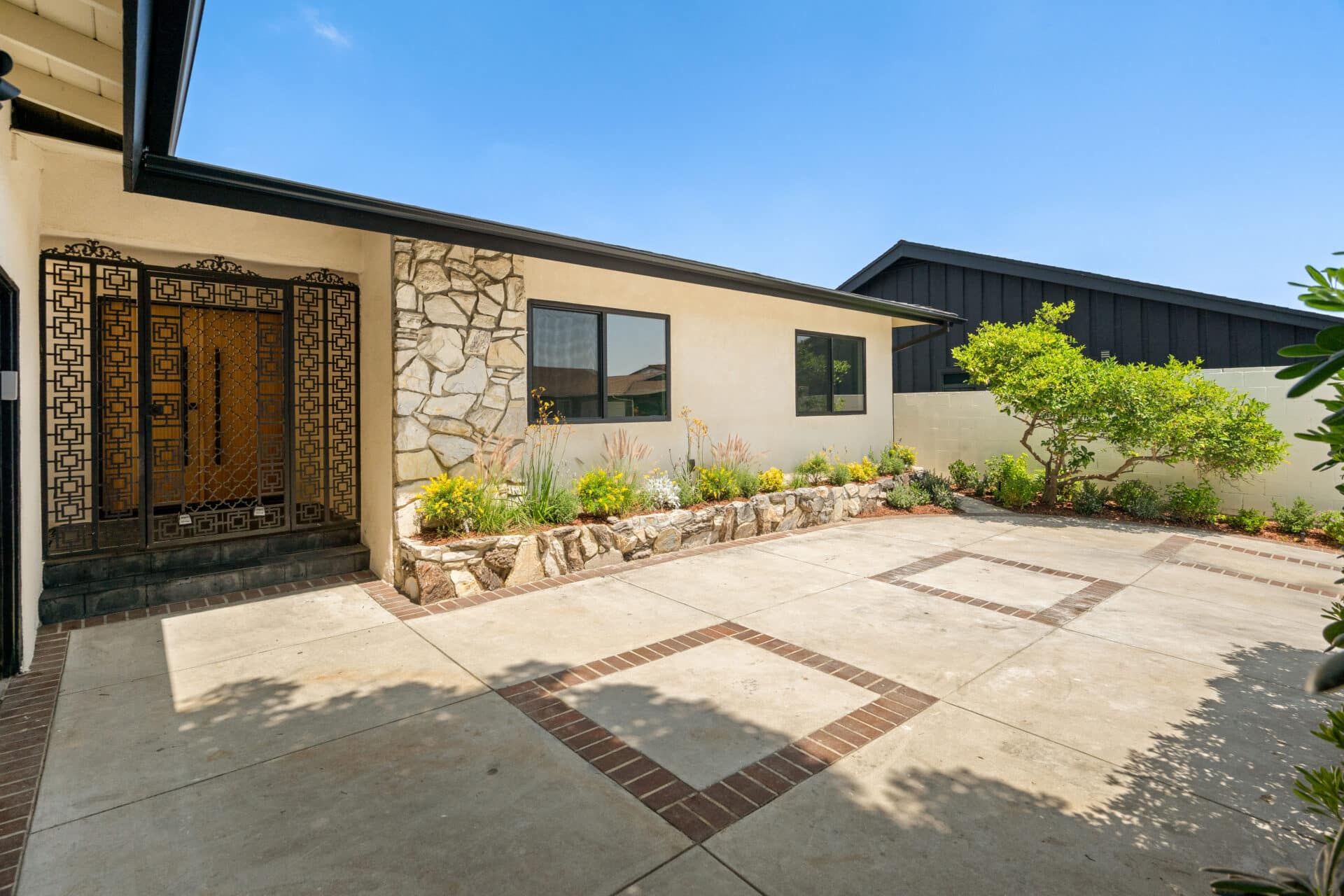Anchored by a sleek custom mantle and an original flagstone planter that nods to the home’s Mid-Century roots, the living room opens through expansive folding doors, inviting natural light and breezes from the West.