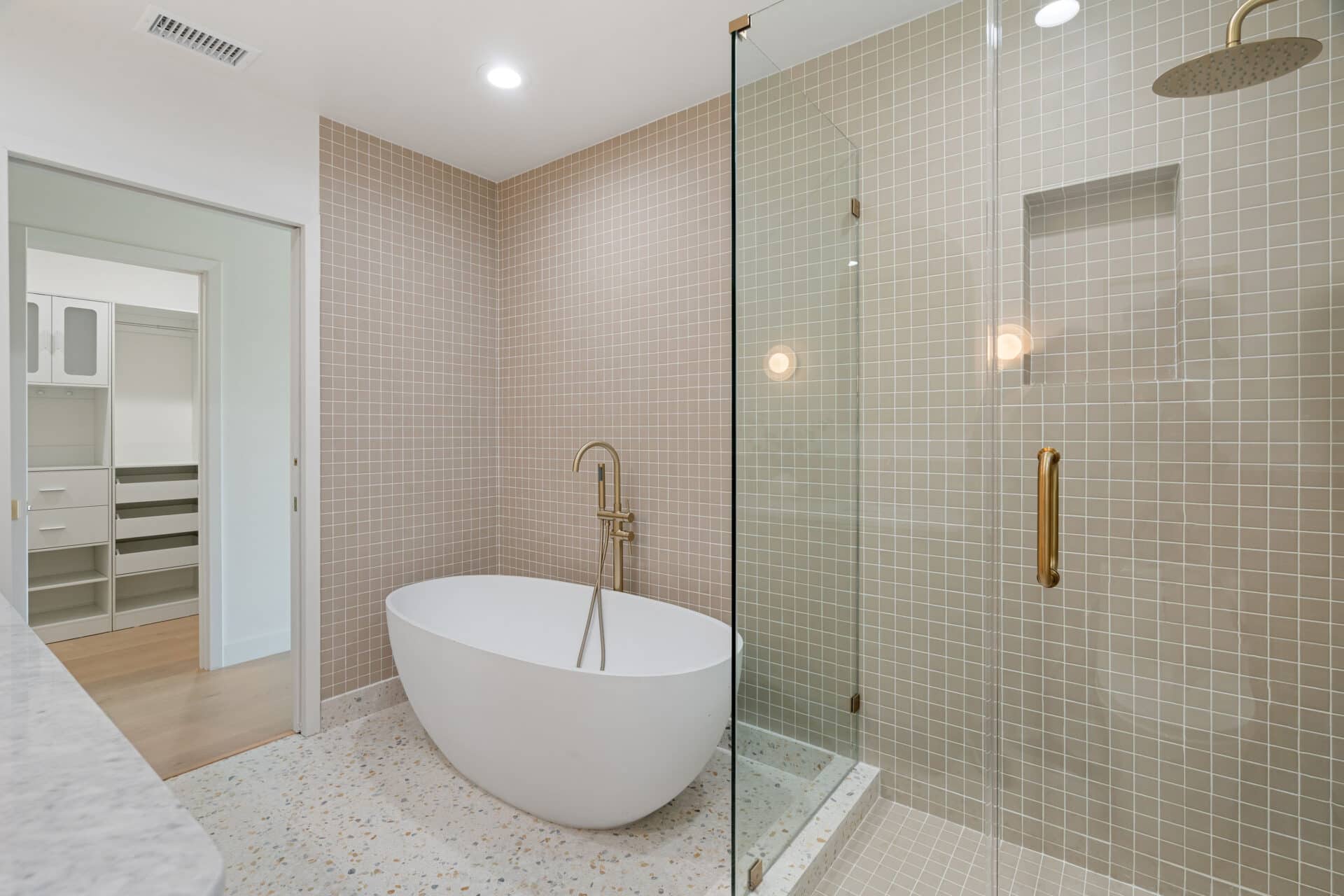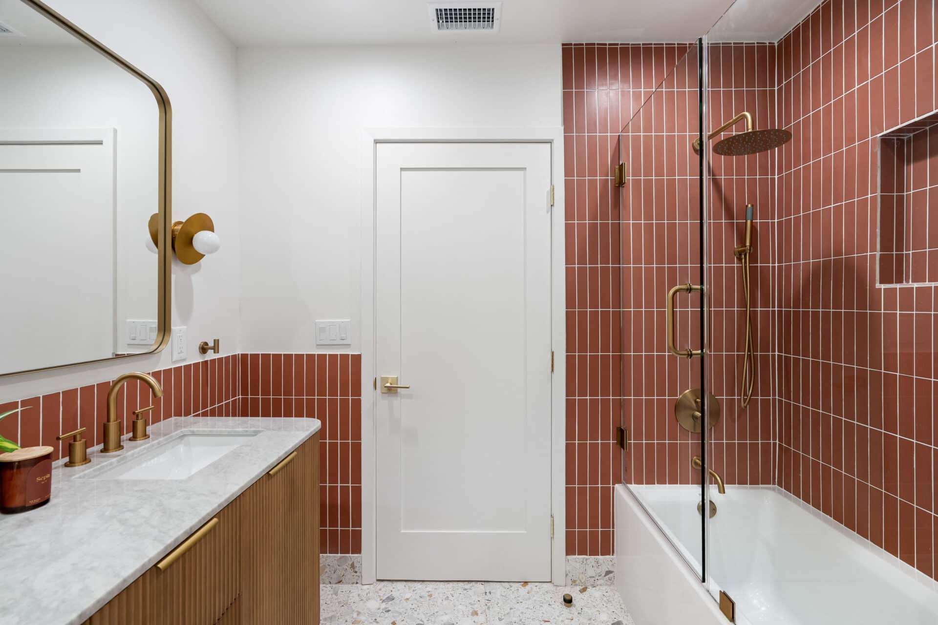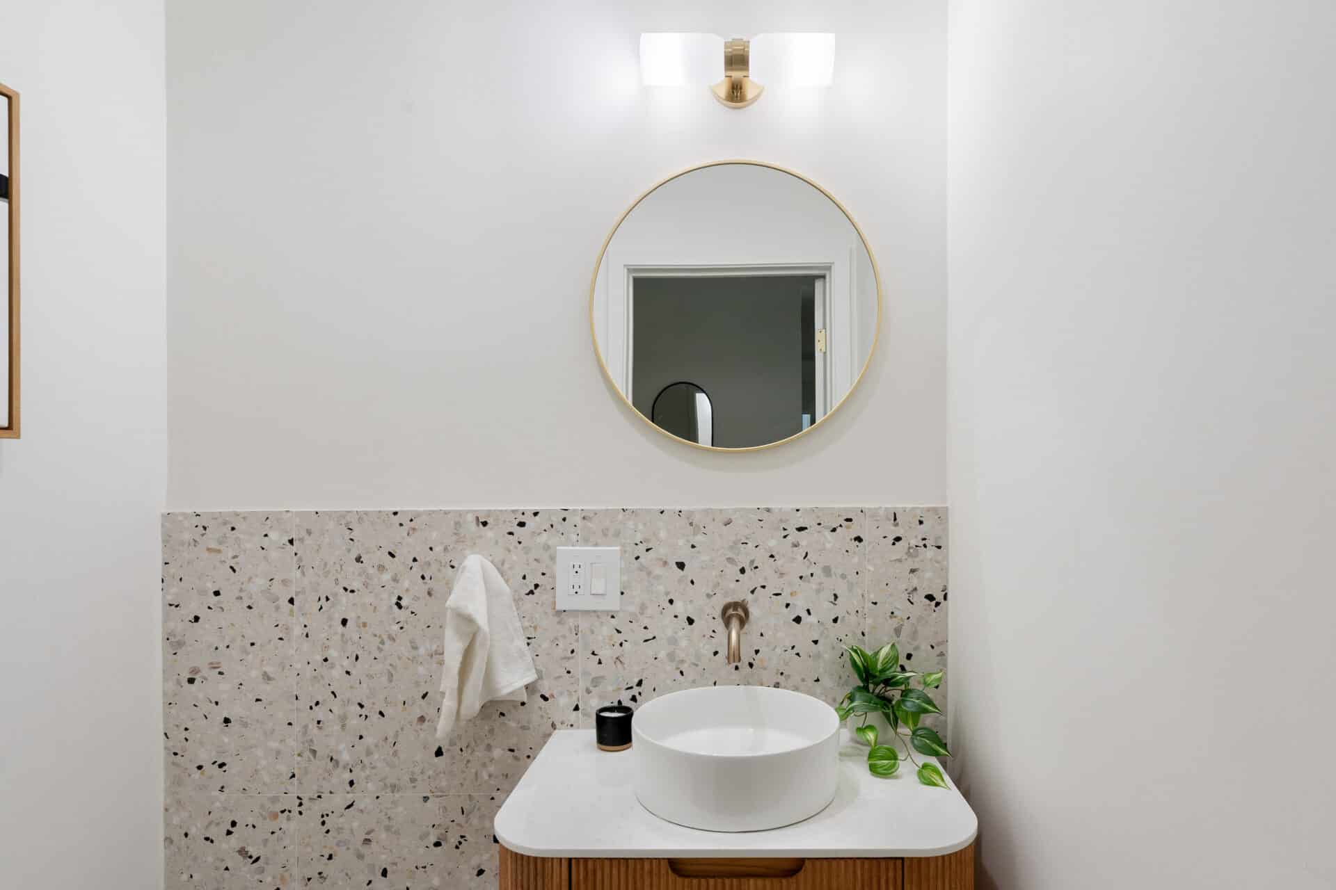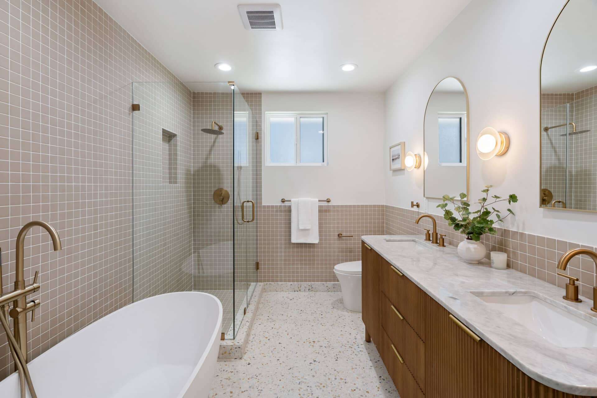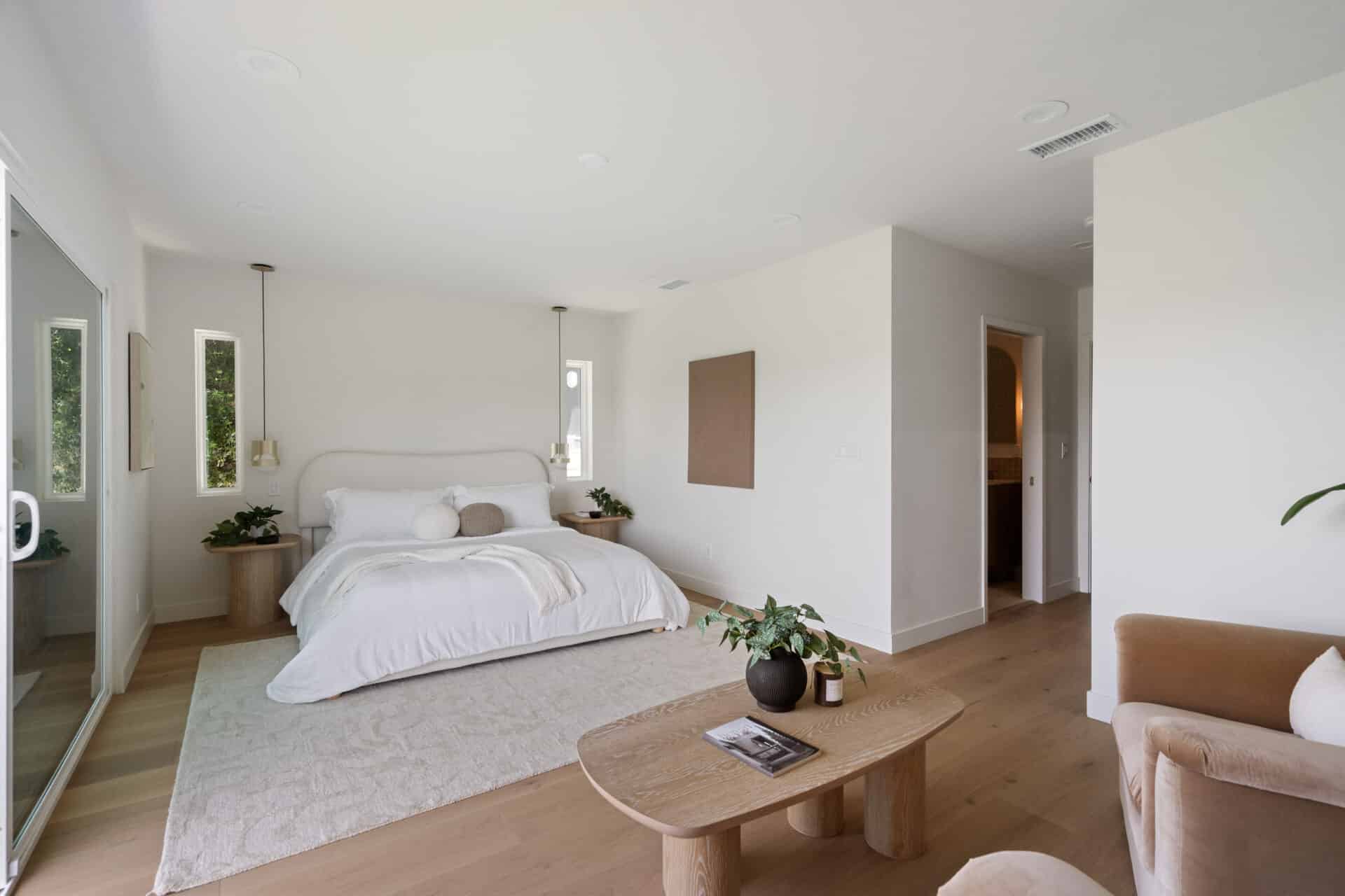 Retreat to the luxurious primary suite with its large walk-in closet and spa-like ensuite bath. Enjoy terrazzo flooring from Zia Tile, a custom mosaic wall tile, dual vanity, soaking tub, and a separate shower. Primary suite opens to the backyard through a large sliding door for added tranquility. Two additional spacious bedrooms share a beautifully appointed hall bath with Aloft Tiles’ terrazzo flooring and complementary wall tile. A stylish powder room at the entry continues the terrazzo theme.