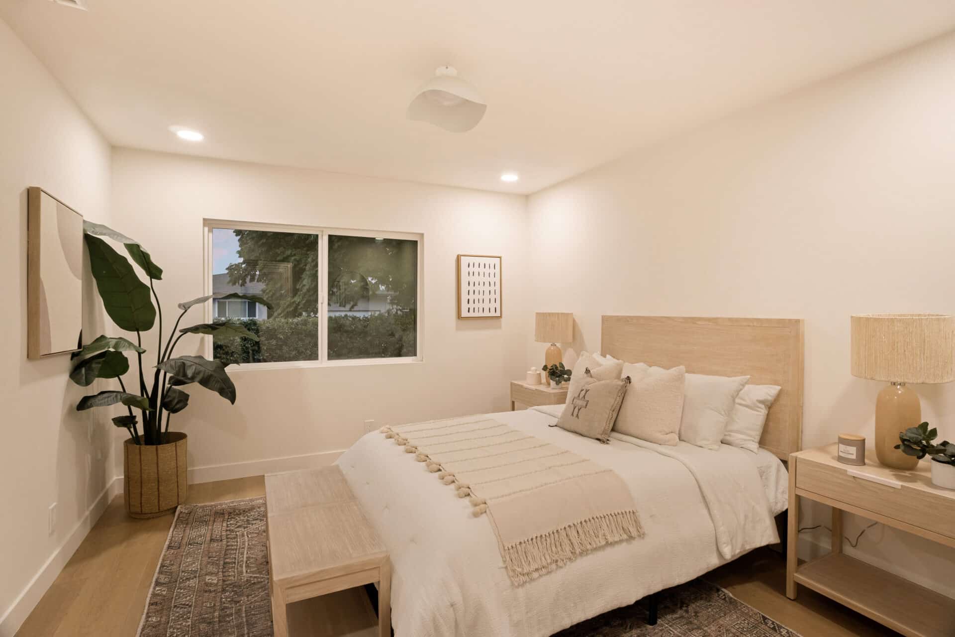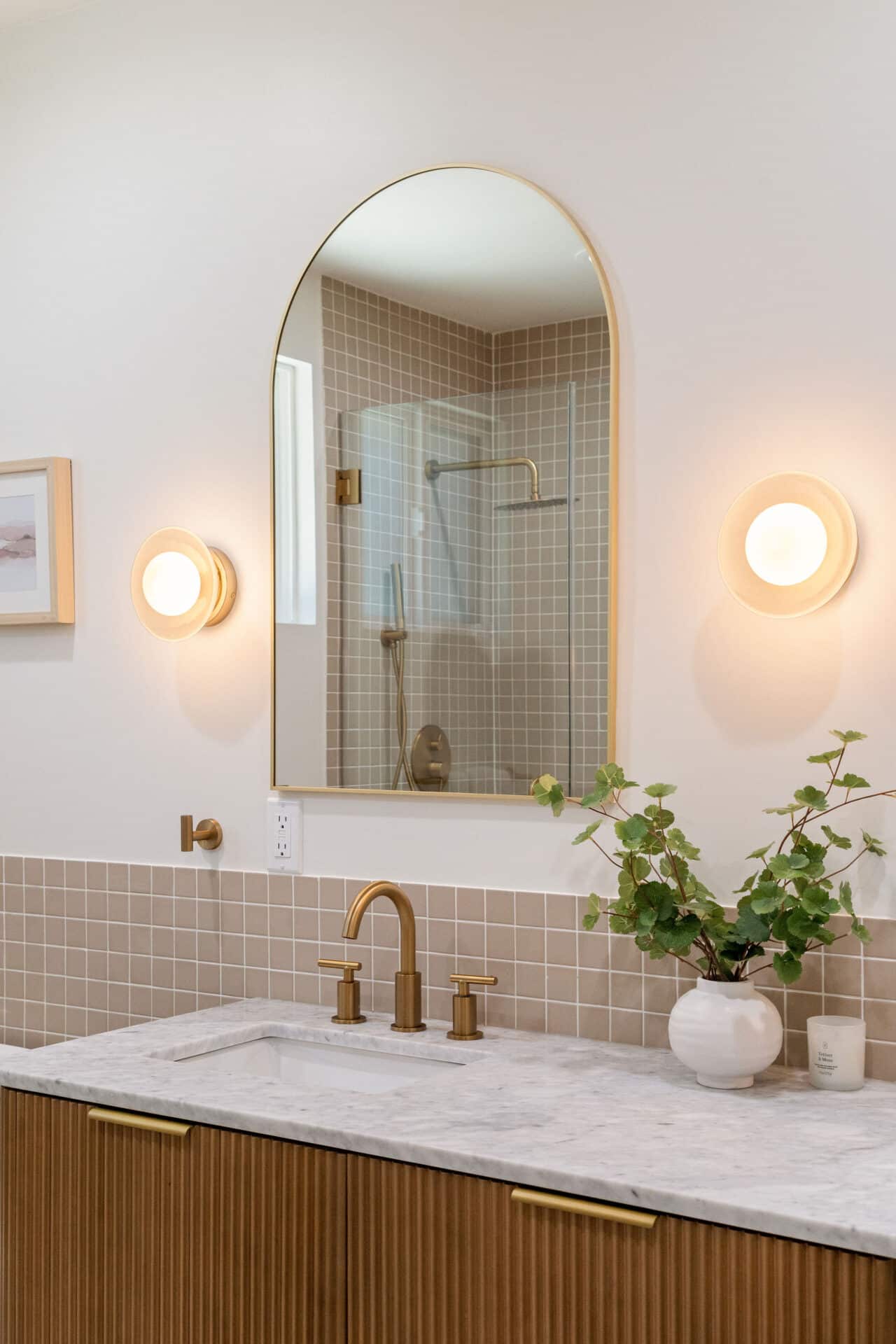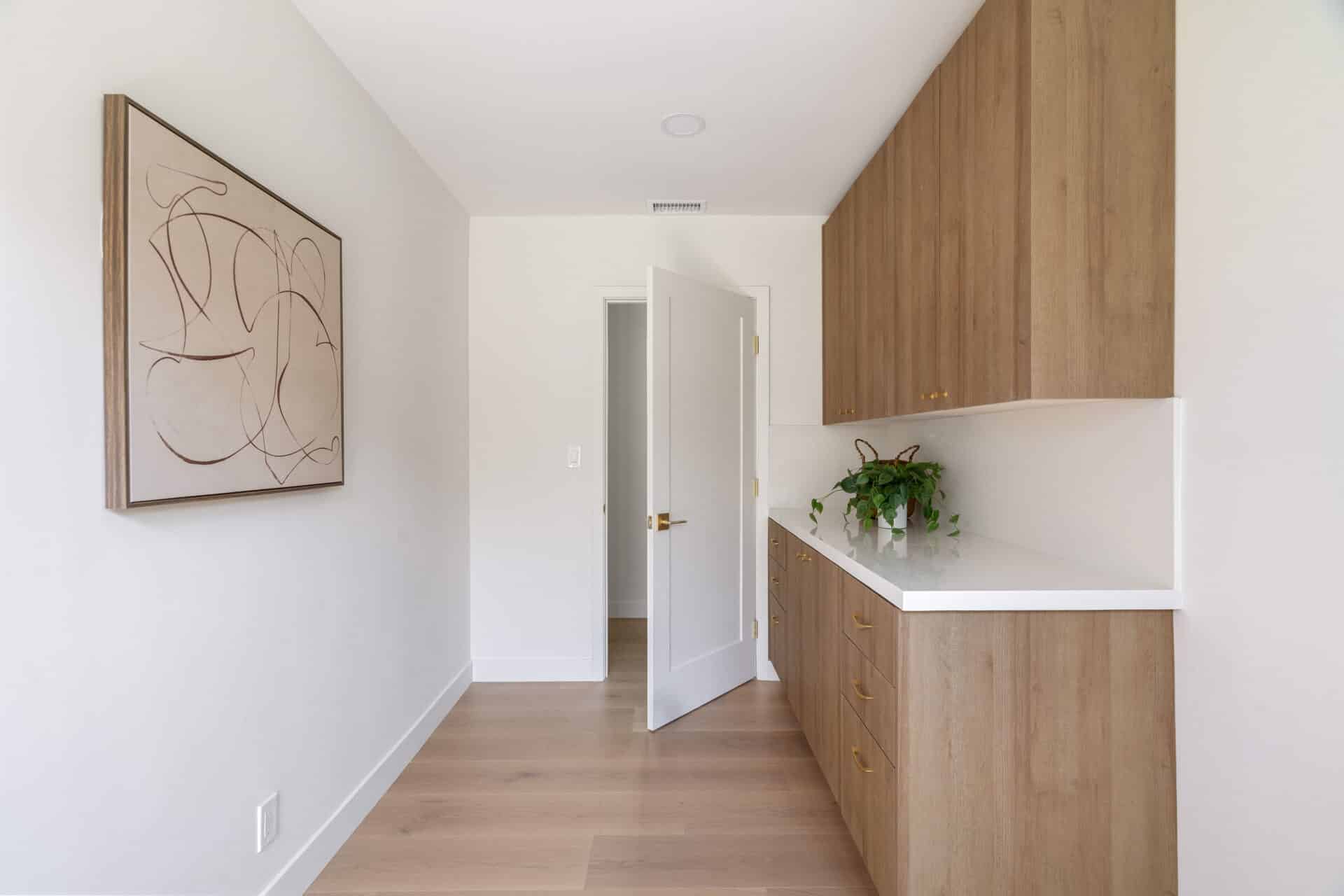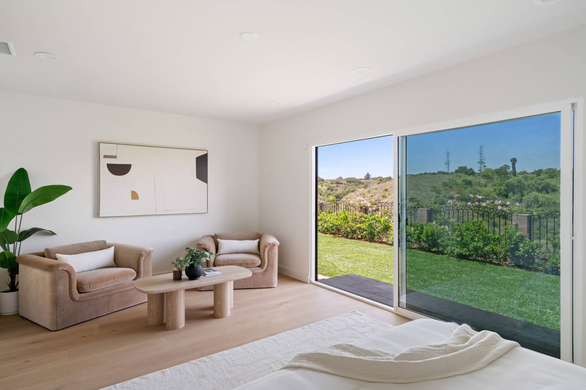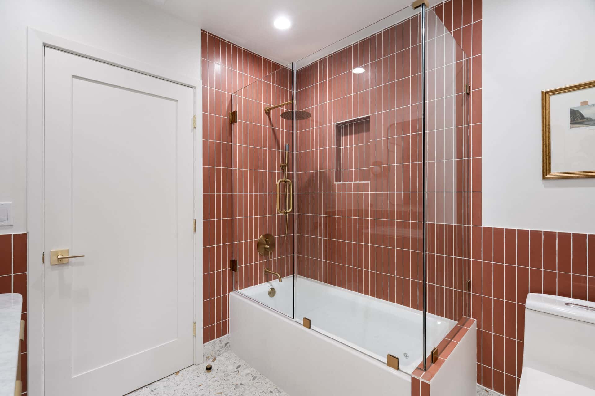 Retreat to the luxurious primary suite with its large walk-in closet and spa-like ensuite bath. Enjoy terrazzo flooring from Zia Tile, a custom mosaic wall tile, dual vanity, soaking tub, and a separate shower. Primary suite opens to the backyard through a large sliding door for added tranquility. Two additional spacious bedrooms share a beautifully appointed hall bath with Aloft Tiles’ terrazzo flooring and complementary wall tile. A stylish powder room at the entry continues the terrazzo theme.